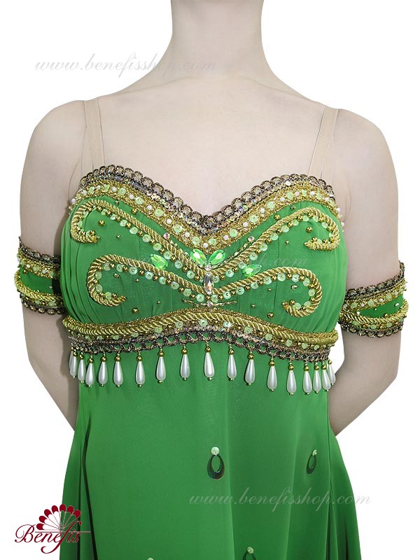 The basque line decorated with a row of pearl-beads in the shape of drops and the armlets underline the oriental style of the dress.