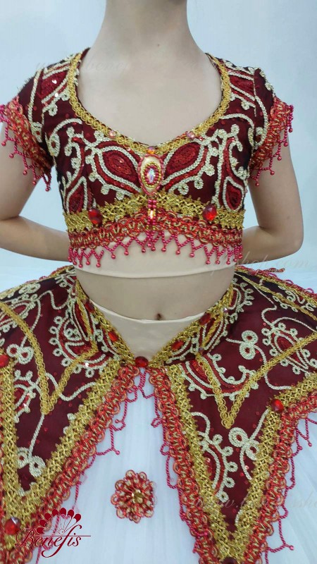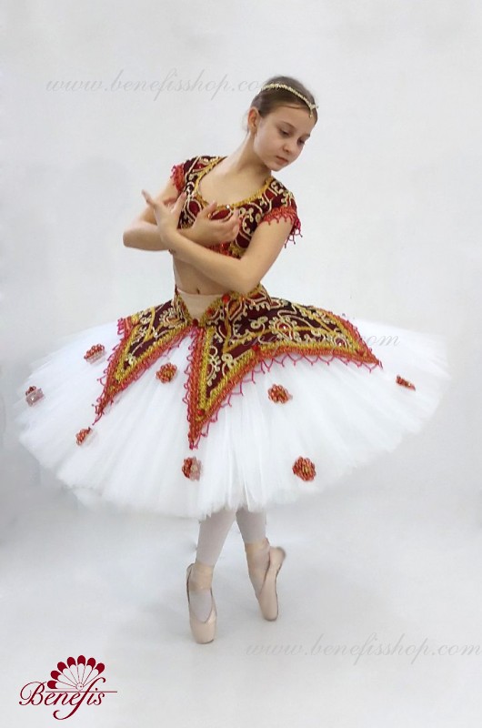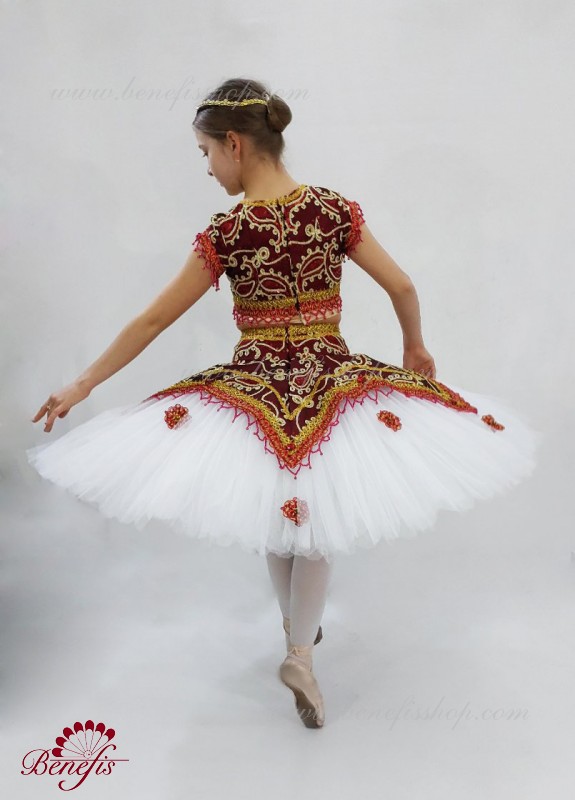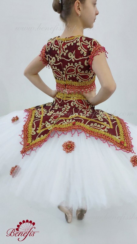 This professional stage costume is made on the basis of T0001G. The upper layer is assembled into a tube, the lower ones into folds. The panties are trimmed with decorative soft ruffle. The bundle has a crinoline hoop. The lower shuttlecocks are swept together, which gives the pack a flat look. The bodice is fastened with hooks in two rows for convenient size adjustment, and the inner cord serves to tighten the bodice in the chest area. The bodice under the breast ends with a fringe of beads and glass beads, which during the dance shimmer with shades of gold and silver In the form of decoration are used: appliques, sequins, rhinestones.