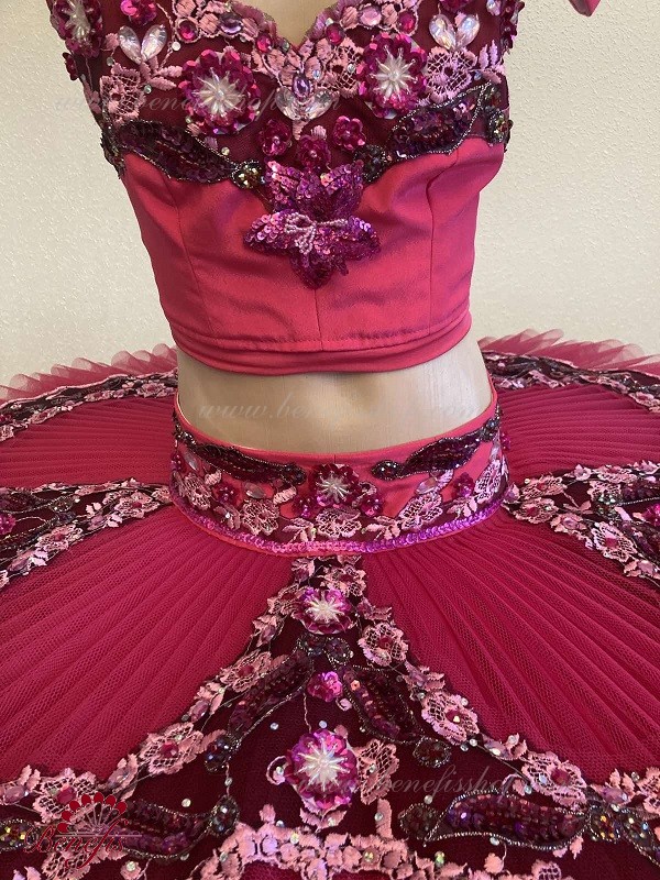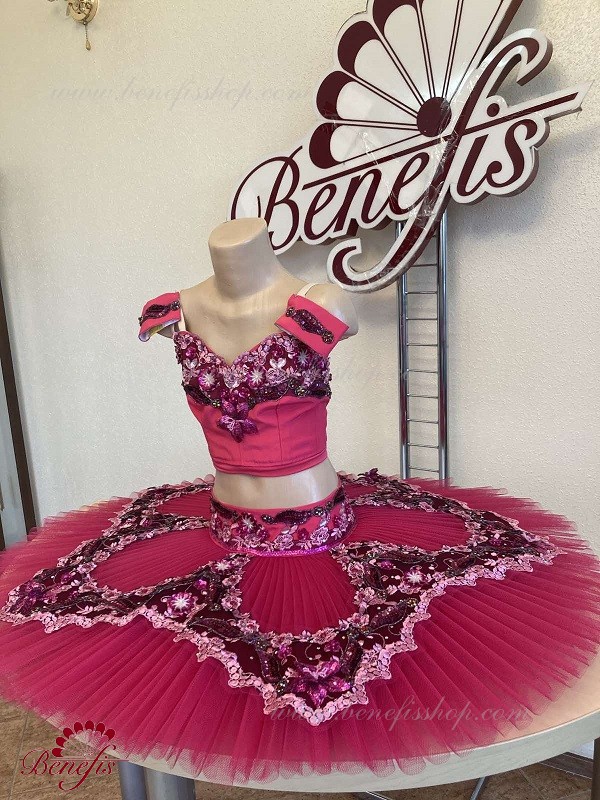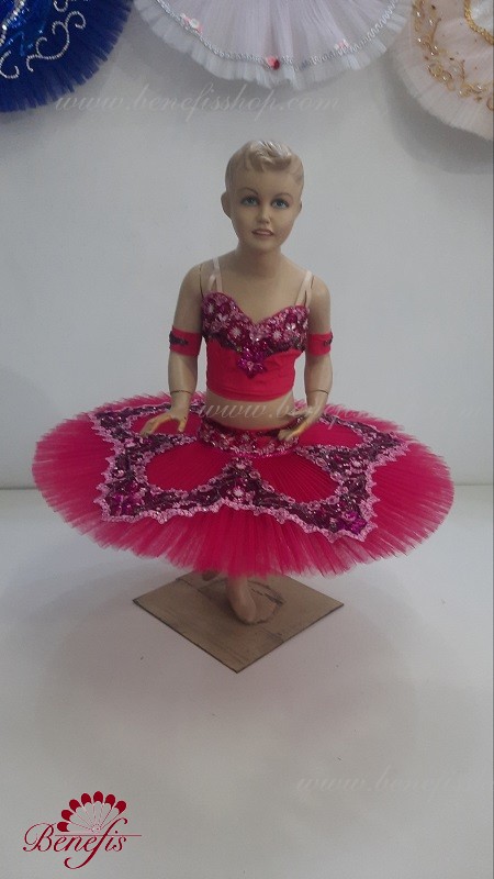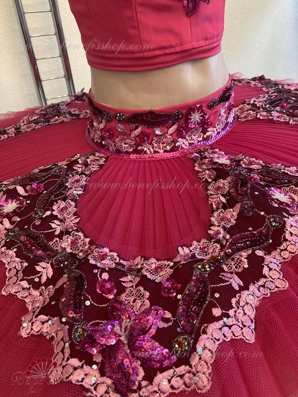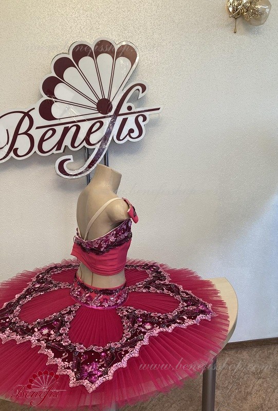 Eight pleated graduated layers of semi-soft tulle - seven long and one short on tulle panties with a 10 cm yoke attached to an elastic waistband. Two crinoline hoops are embedded in the middle layer with two additional short frills at the edges. The length of the top layer is 36-38 cm, each subsequent layer is 4 cm shorter. The pack is fastened at the back with 6 large hooks and loops.