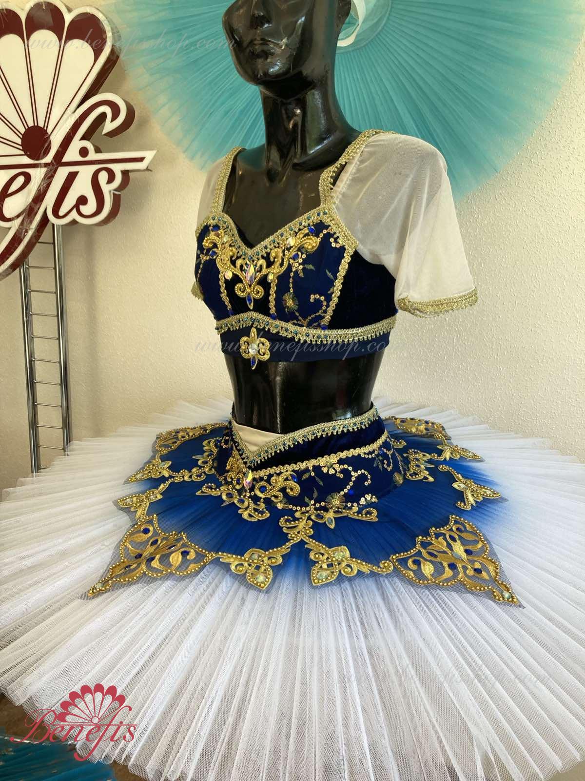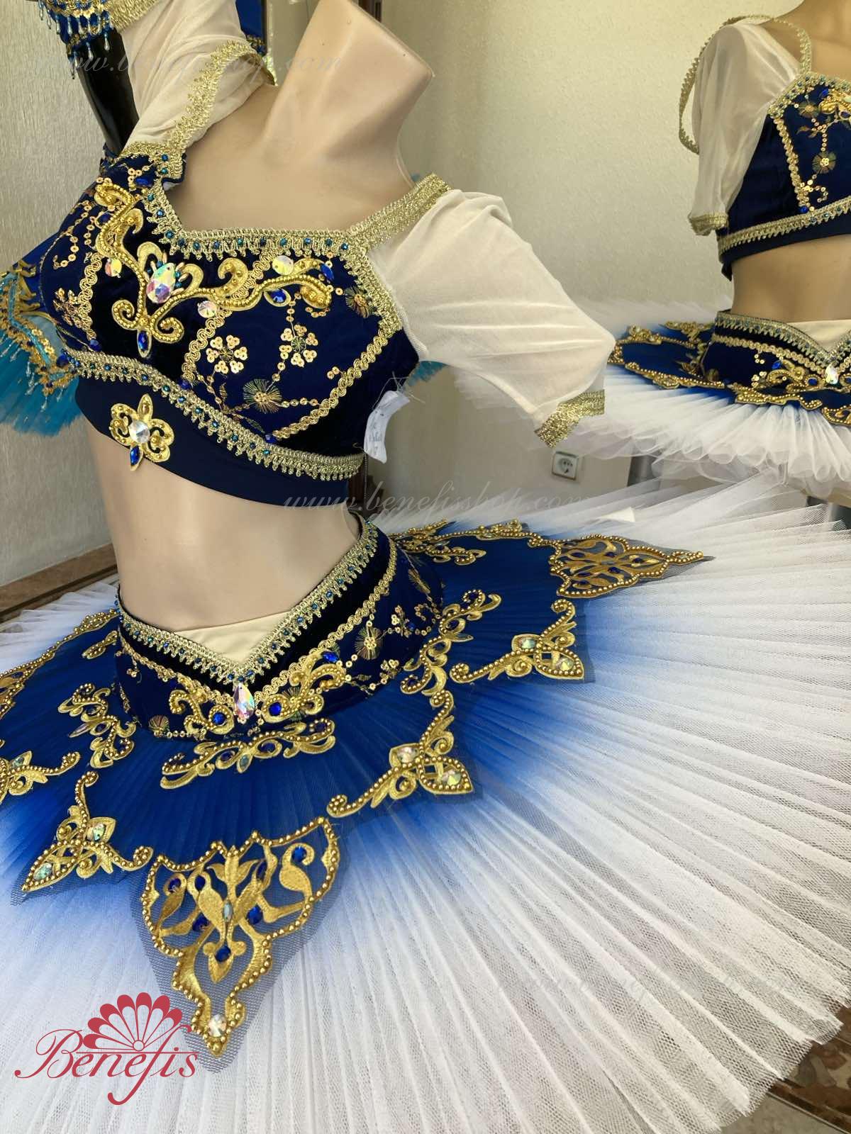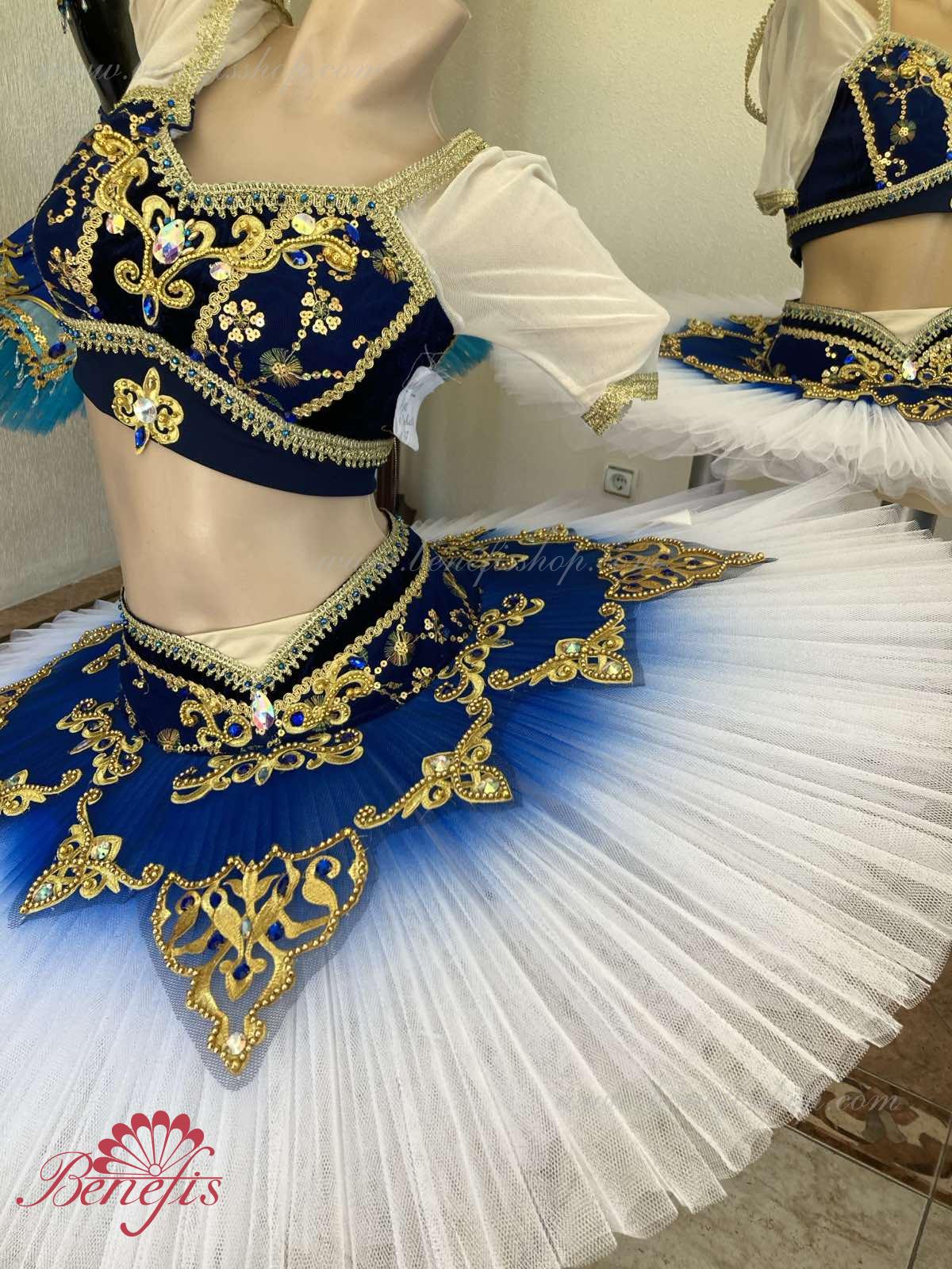 Details:costume. This professional ballet stage costume is made on the basis of a professional basic tutu # T 0001B (see the section "Basic and rehearsal ballet tutus"). The elastic bodice, with sleeves and sewn cups, is made of shiny biflex and ends under the breast. Yoke T0013. This model is made of two parts, which are attached to each other with elastic bands, in the waist area. The lower part is sewn to a tutu or skirt. The upper part is superimposed on the lower one, which allows you to adjust the length of the bodice depending on the height of the ballerina, and gives the bodice greater mobility. Eight pleated graduated layers of semi-soft tulle - seven long and one short on tulle panties with a 10 cm yoke attached to an elastic waistband. Two crinoline hoops are embedded in the middle layer with two additional short frills at the edges. The length of the top layer is 36-38 cm, each next layer is 4 cm shorter. The pack is fastened at the back with 6 large hooks and loops.