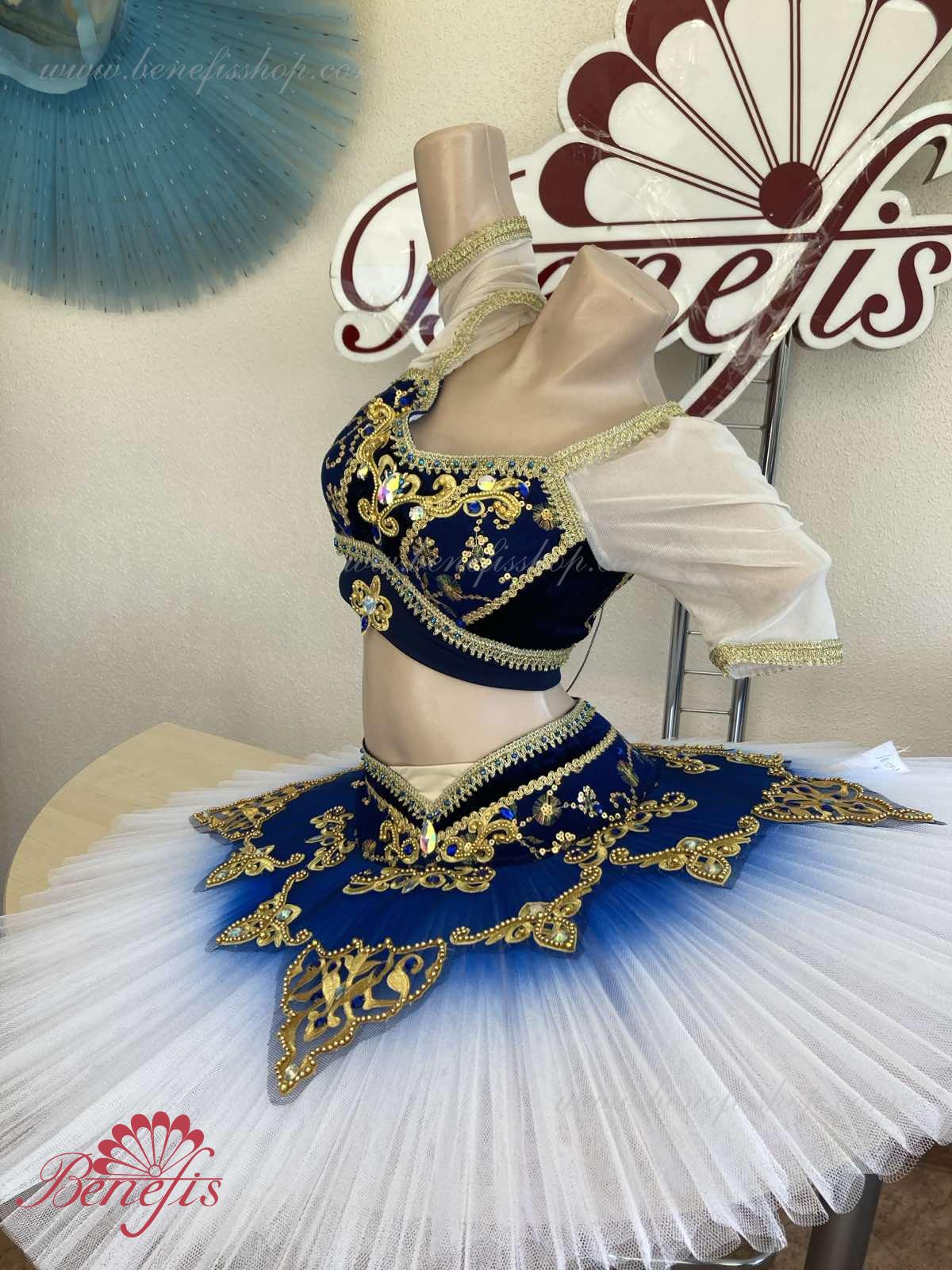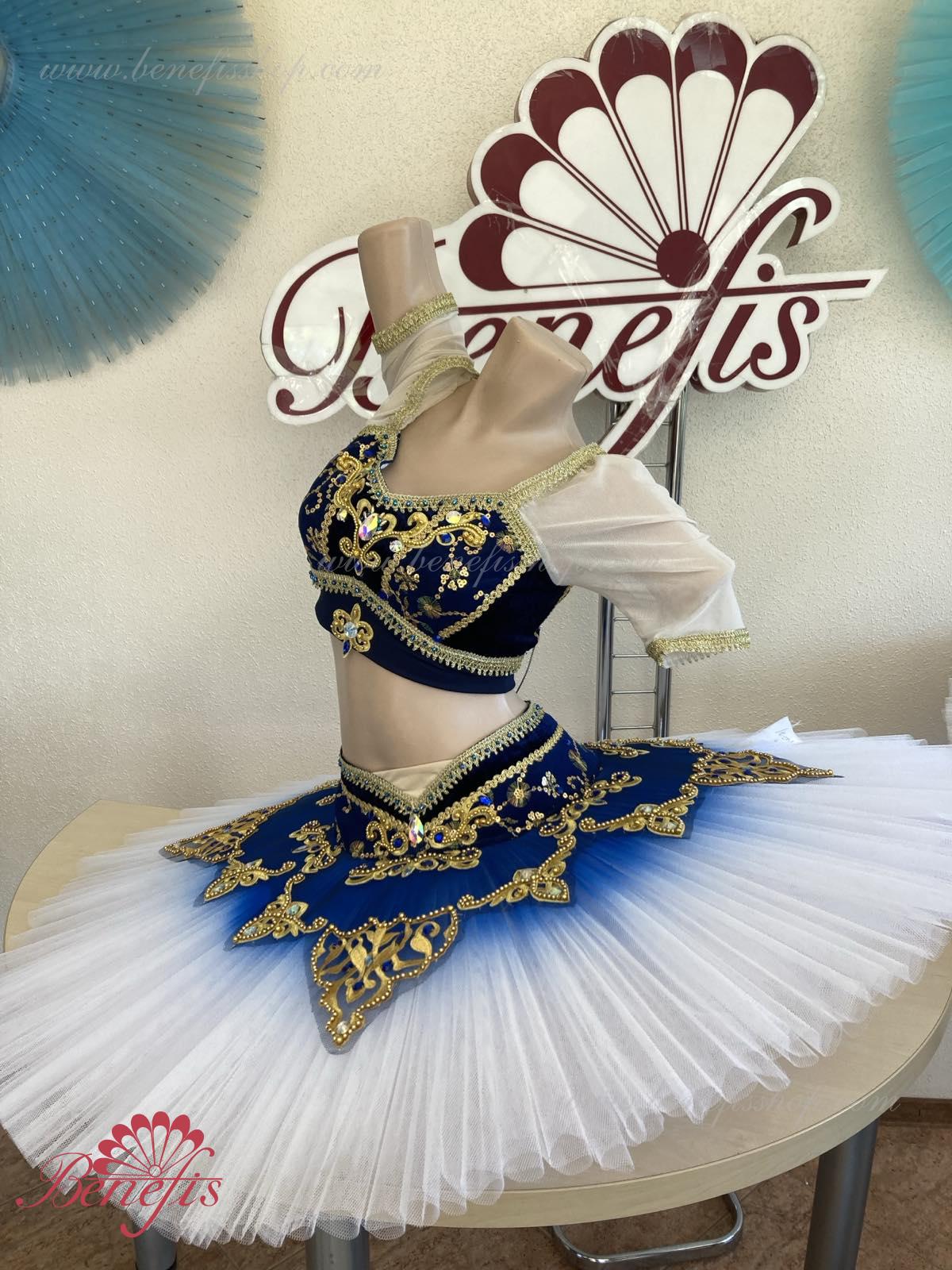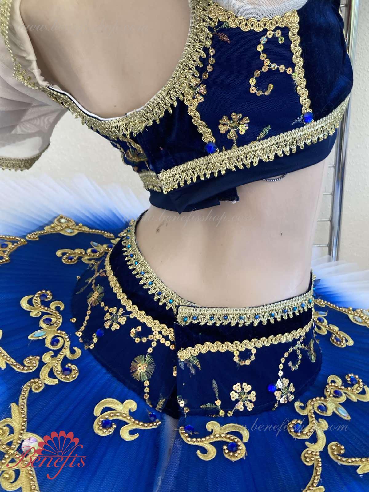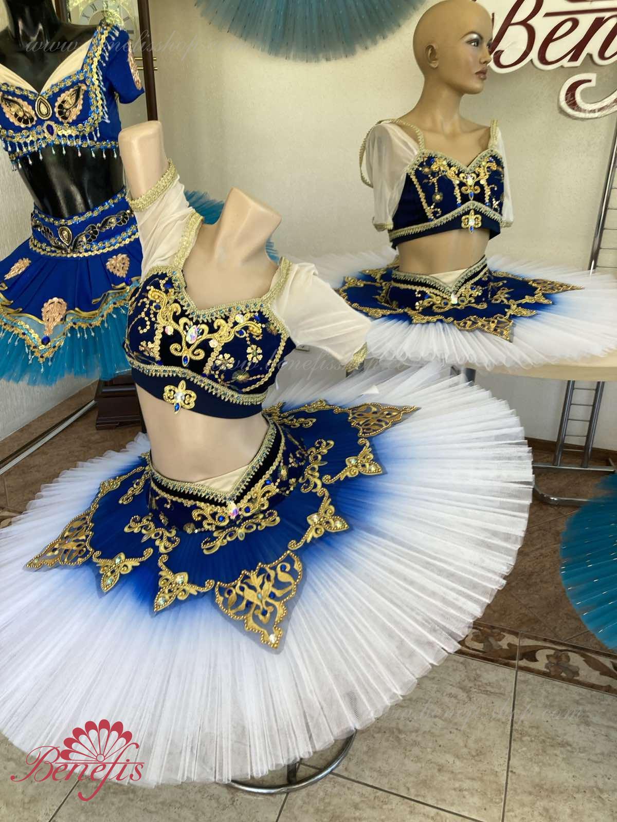 Details:costume. This professional ballet stage costume is made on the basis of a professional basic tutu # T 0001B (see the section "Basic and rehearsal ballet tutus"). The elastic bodice, with sleeves and sewn cups, is made of shiny biflex and ends under the breast. Yoke T0013. This model is made of two parts, which are attached to each other with elastic bands, in the waist area. The lower part is sewn to a tutu or skirt. The upper part is superimposed on the lower one, which allows you to adjust the length of the bodice depending on the height of the ballerina, and gives the bodice greater mobility. Eight pleated graduated layers of semi-soft tulle - seven long and one short on tulle panties with a 10 cm yoke attached to an elastic waistband. Two crinoline hoops are embedded in the middle layer with two additional short frills at the edges. The length of the top layer is 36-38 cm, each next layer is 4 cm shorter. The pack is fastened at the back with 6 large hooks and loops.