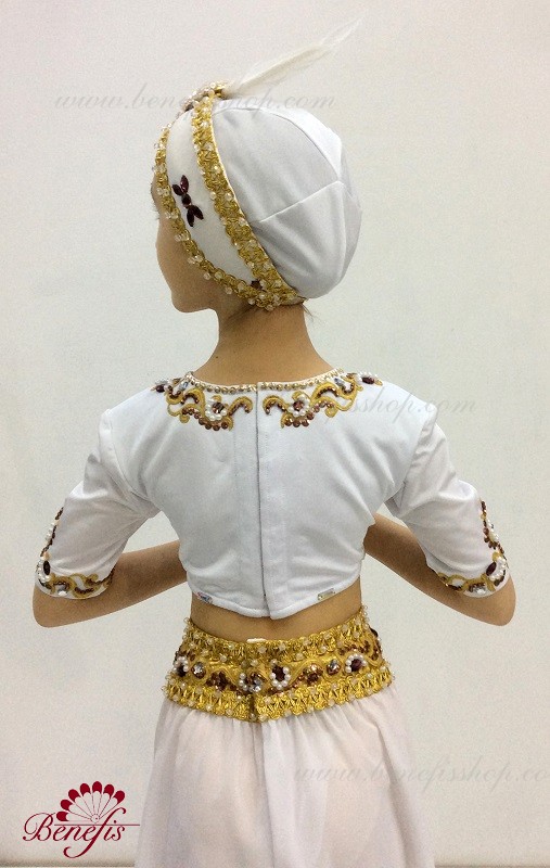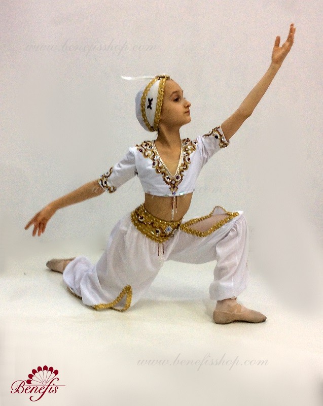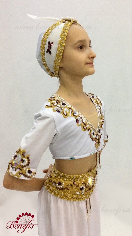 The belt and cuffs on the trousers are embroidered with blue and white rhinestones of different sizes and shapes.