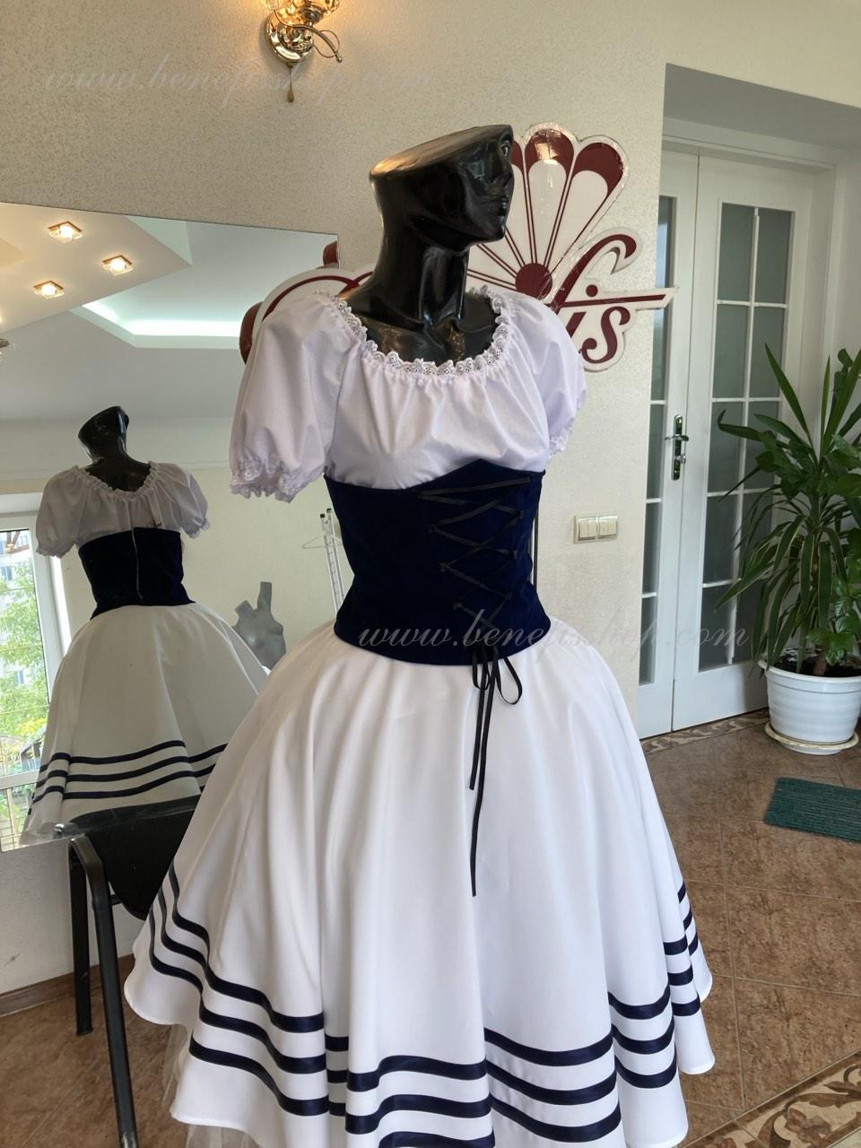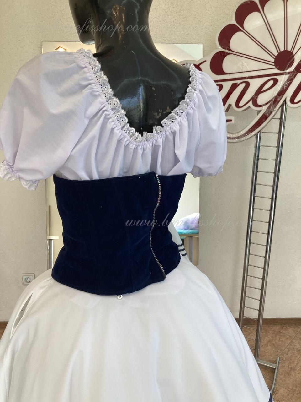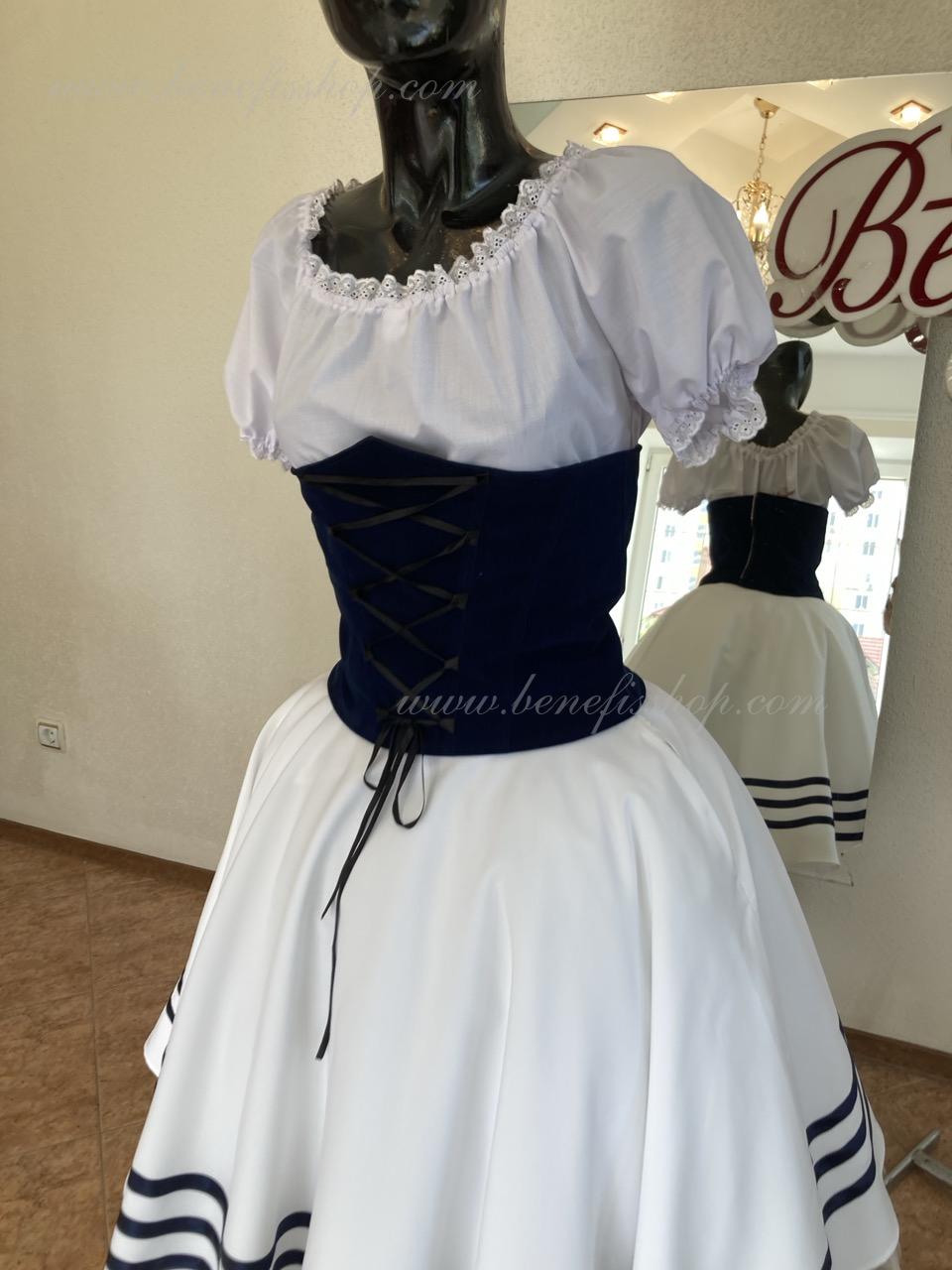 Details: blouse, corset, skirt. Blouse made of magpie fabric. The corset is made of velvet-lined paper. Lacing made of satin ribbon allows you to adjust the width of the corset. The upper contour of the product elegantly emphasizes the shape of the breast. The corset is zipped at the back. This airy romantic basic tutu consists of six layers of soft and hard tulle made from a variety of wedges. All the layers are planted on tulle panties. The panties are connected to a 7cm tulle yoke attached to an elastic waistband. The top layer is a top layer of viscose with satin ribbons, the second layer is hard tulle, the third layer is soft tulle, the fourth layer is hard tulle, the fifth layer is hard tulle, the sixth layer is soft tulle.