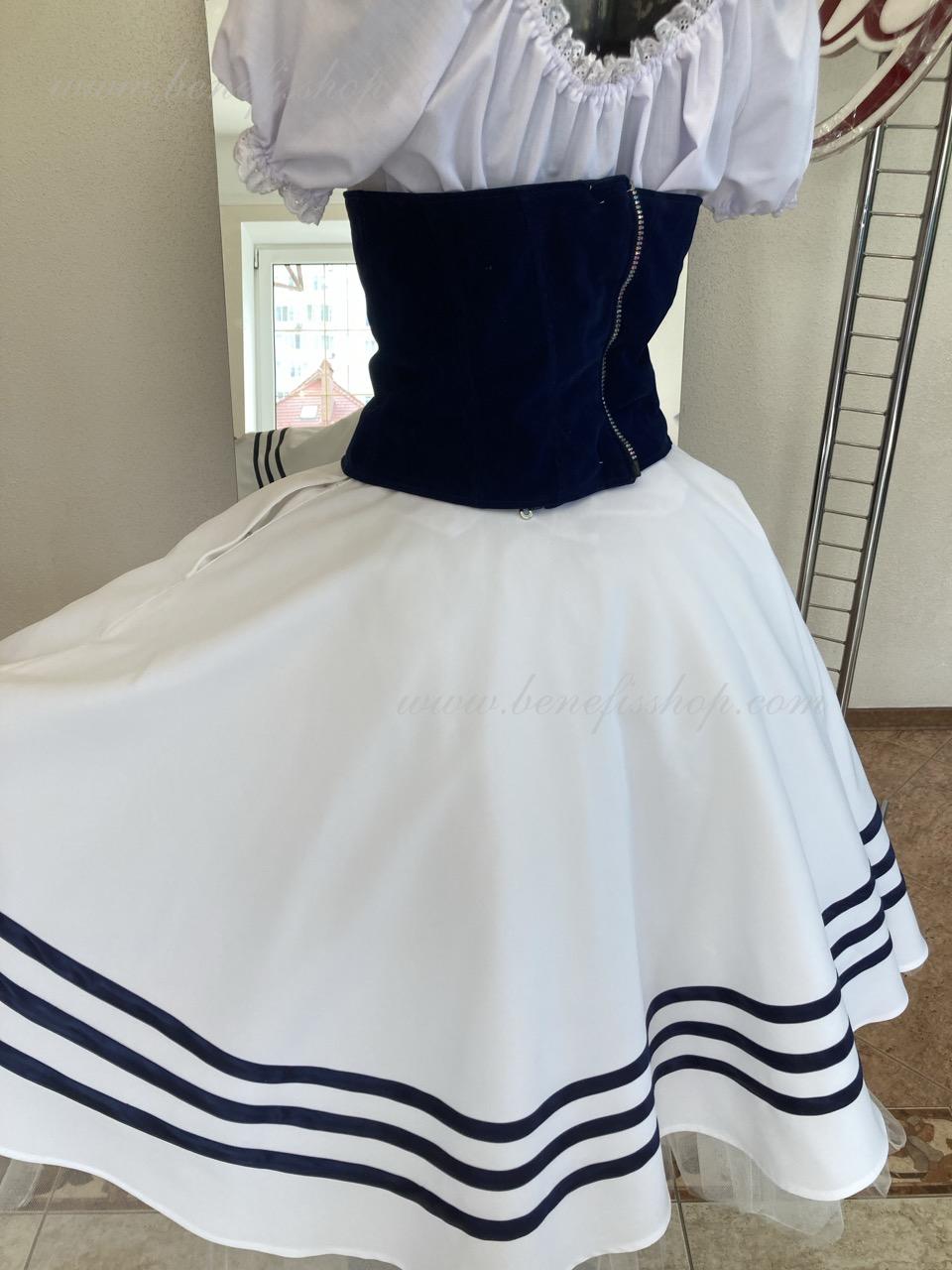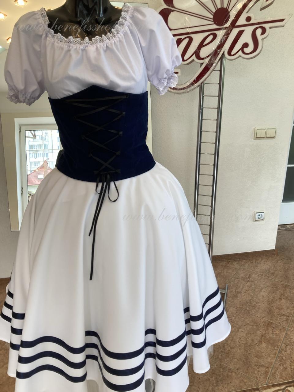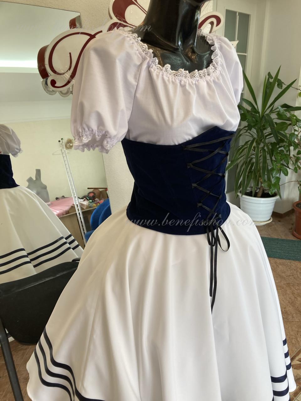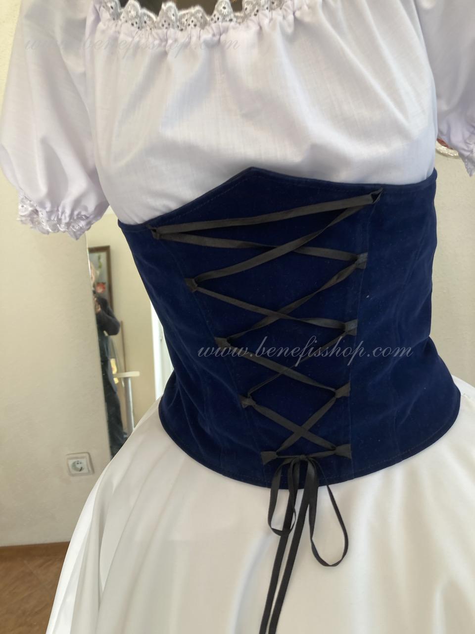 Details: blouse, corset, skirt. Blouse made of magpie fabric. The corset is made of velvet-lined paper. Lacing made of satin ribbon allows you to adjust the width of the corset. The upper contour of the product elegantly emphasizes the shape of the breast. The corset is zipped at the back. This airy romantic basic tutu consists of six layers of soft and hard tulle made from a variety of wedges. All the layers are planted on tulle panties. The panties are connected to a 7cm tulle yoke attached to an elastic waistband. The top layer is a top layer of viscose with satin ribbons, the second layer is hard tulle, the third layer is soft tulle, the fourth layer is hard tulle, the fifth layer is hard tulle, the sixth layer is soft tulle.
