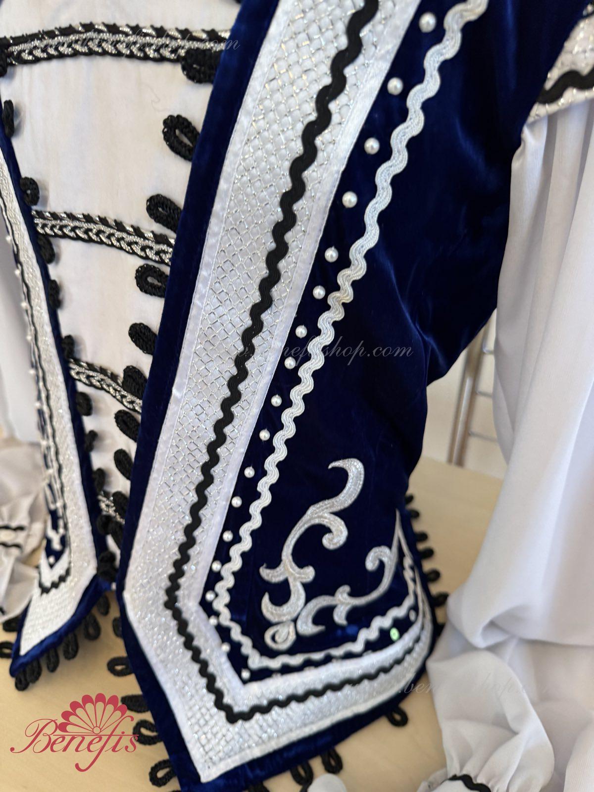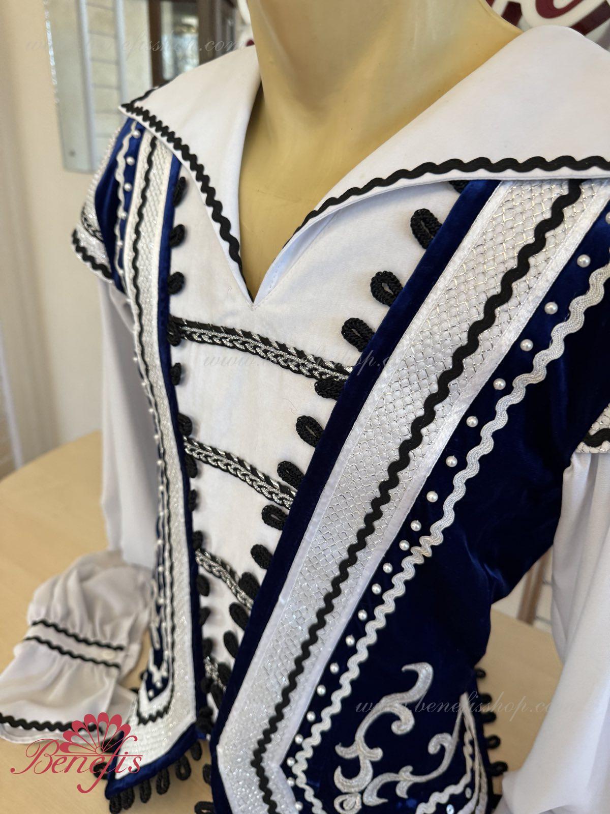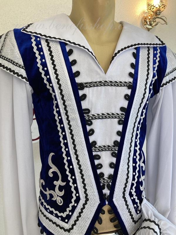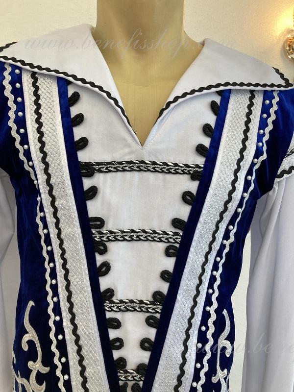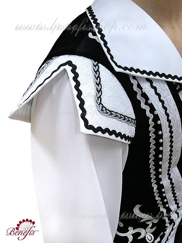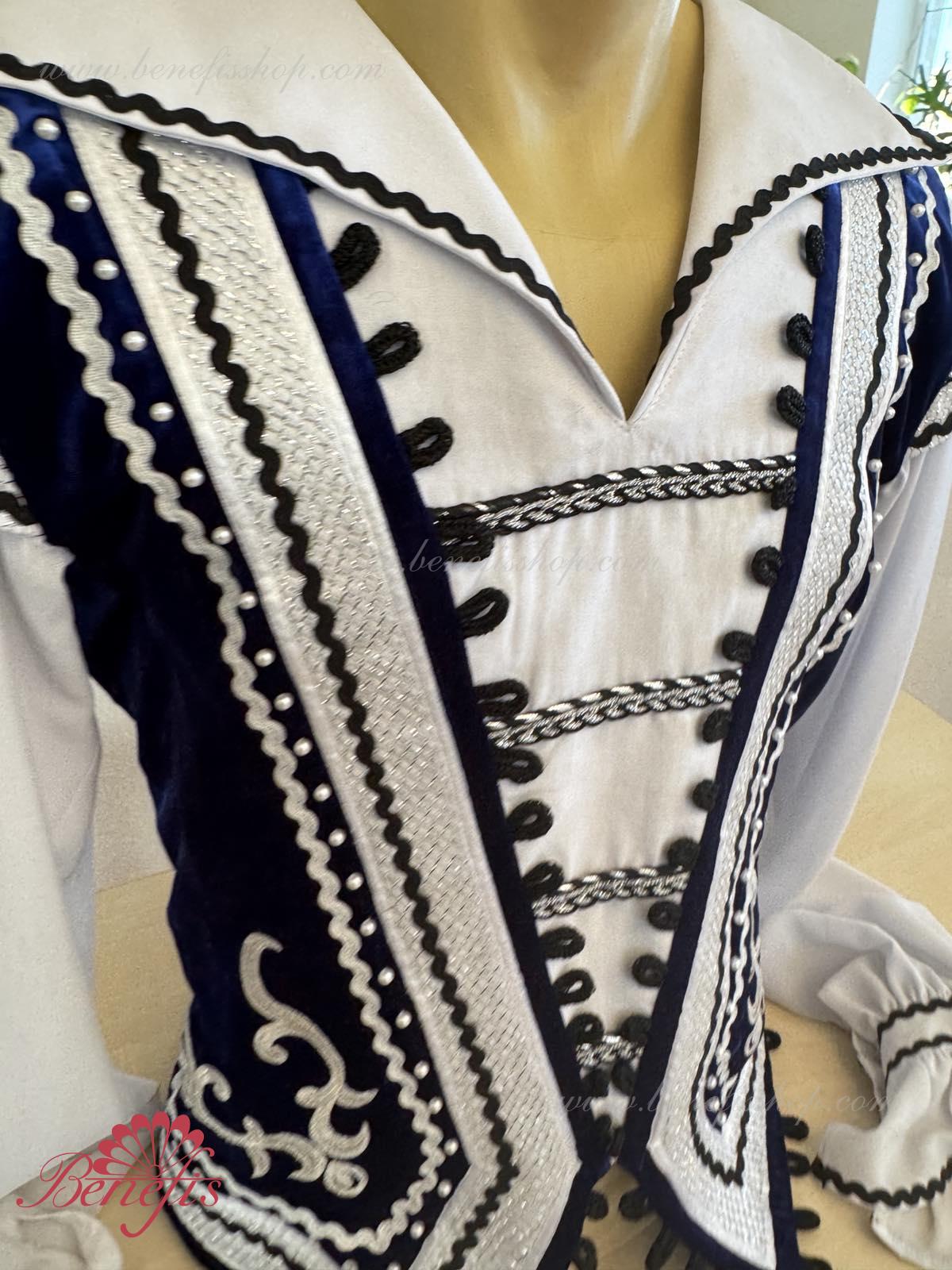 The decor consists of applique, black and silver lace and small buttons. The edge of the tunic is bordered with a decorative trim with eyes.