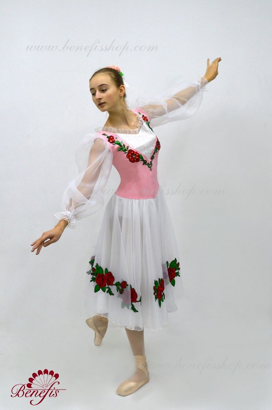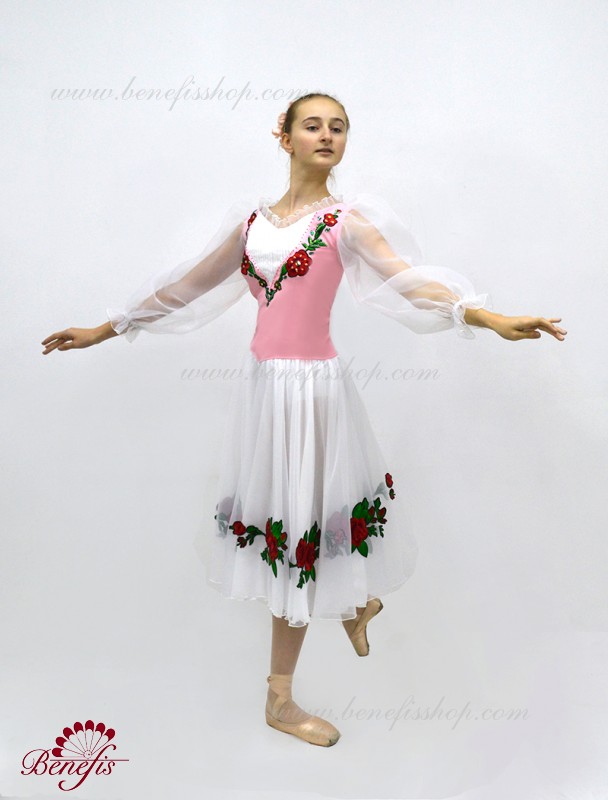 The bodice is made of semi-elastic fabric. A white V-shaped draped inset at the front, fastens on the back with two rows of hooks. Long organza sleeves. Two-layered skirt: the upper organza layer and the lower chiffon layer. Décor includes large elegant appliques, sequins, and rhinestones.