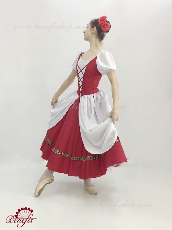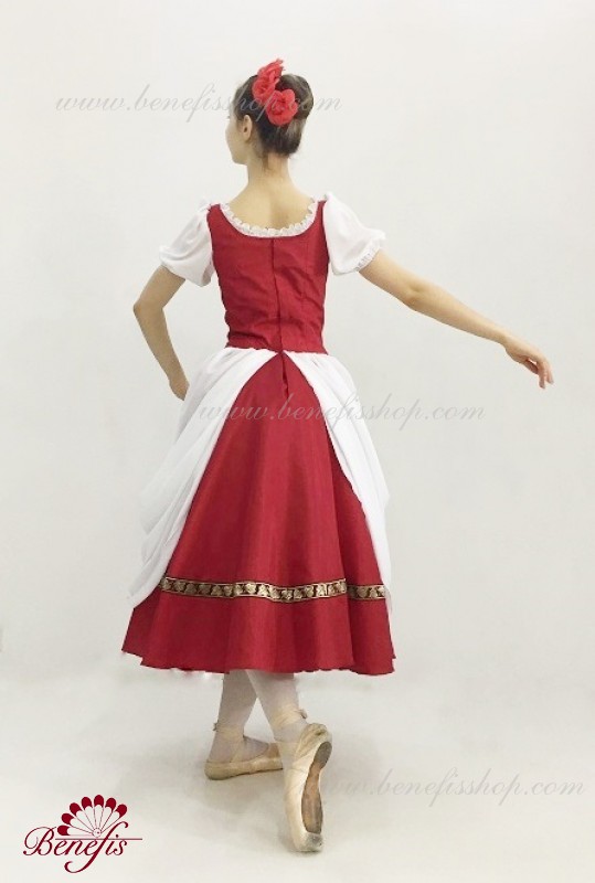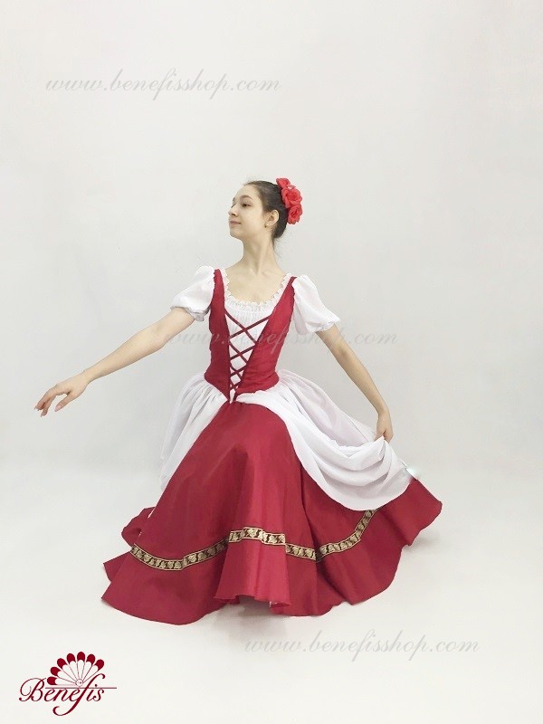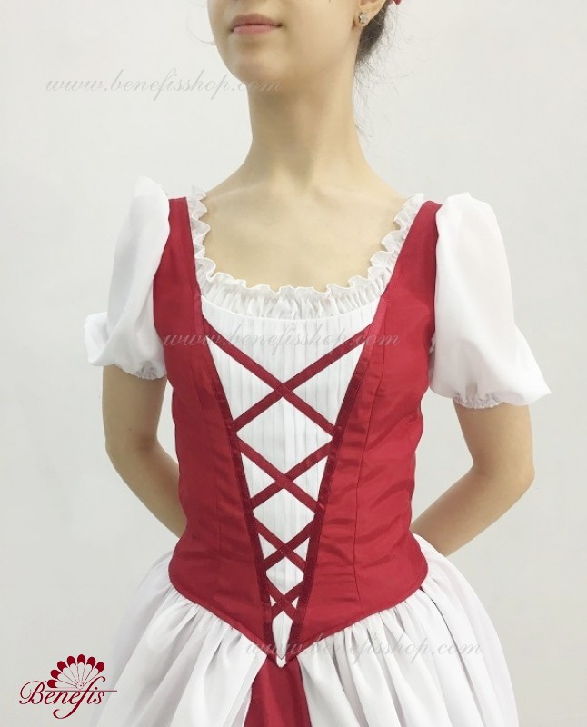 Details: dress. This is a professional stage ballet costume. The bodice has shoulder seams with cape. Fastens at the back with two rows of hooks and loops. The neckline is surrounded by delicate chiffon gathering, lantern sleeves. A tulle petticoat gives a splendor to the skirt.