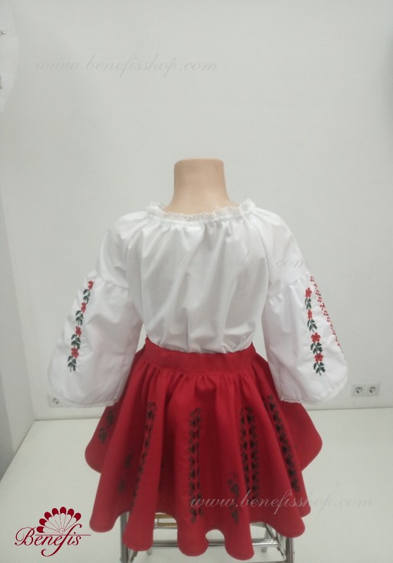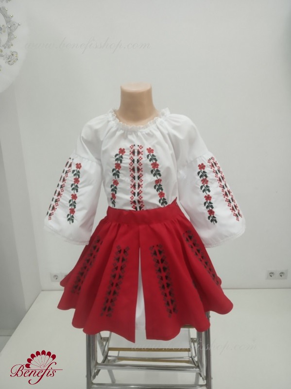 The costume consists of: dress and skirt. The dress is made of shirt (shirt) fabric. The edges of the dress are decorated with natural lace. The skirt is made of gabardine on an adjustable waist with slits. The embroidery is made in the national style on a special machine.