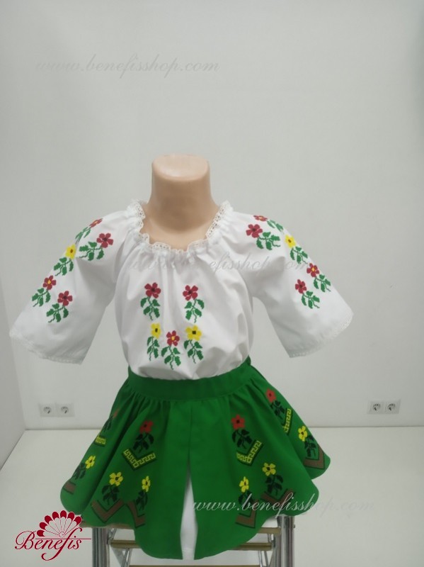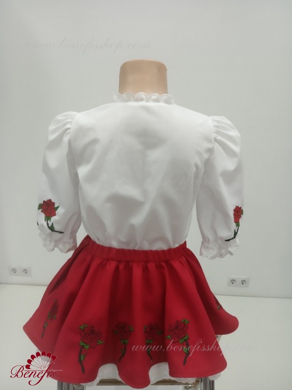 The costume consists of: dress and skirt. The dress is made of shirt (shirt) fabric. The edges of the dress are decorated with natural lace. The skirt is made of gabardine on an adjustable waist with slits. The embroidery is made in the national style on a special machine.