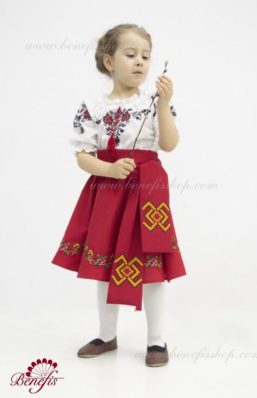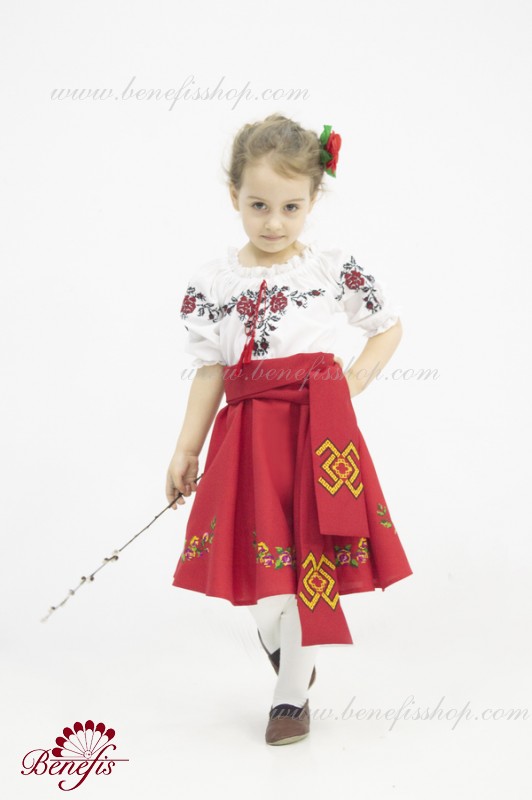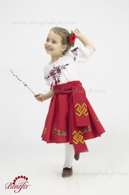 The blouse is made of shirt fabric. An elastic band is inserted on the neckline and arm ruffles and is decorated with natural lace. The embroidery is made in the national style on a special machine.