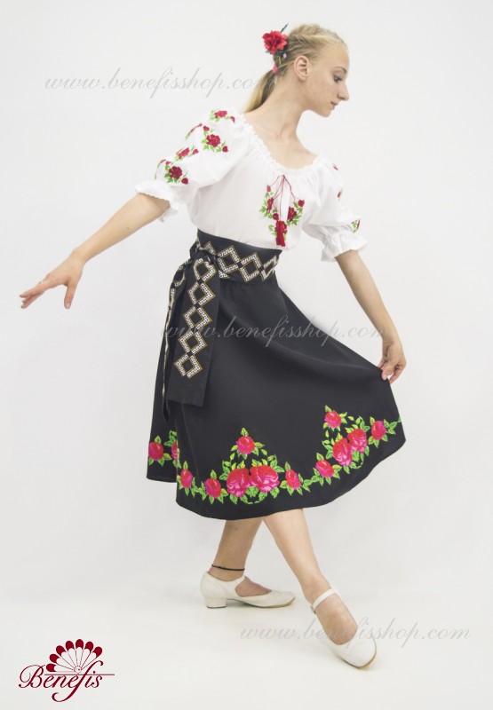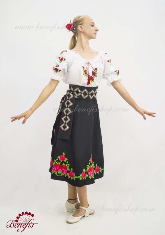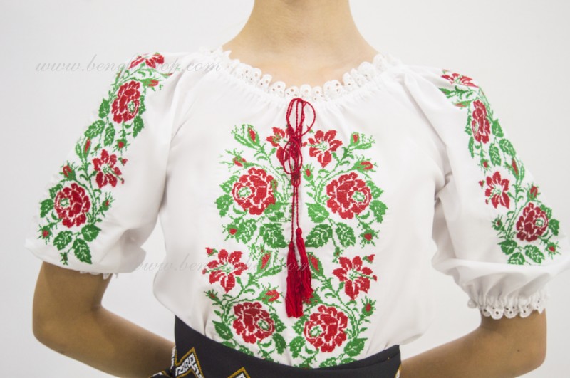 The blouse is made of shirt fabric. An elastic band is inserted on the neckline and arm ruffles and is decorated with natural lace. The embroidery is made in the national style on a special machine.