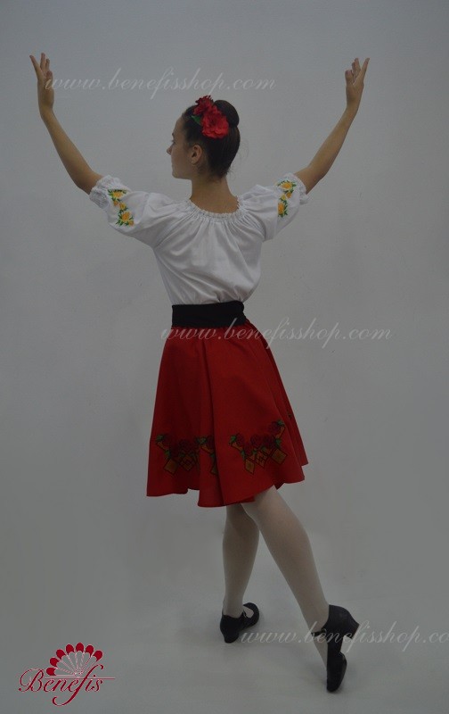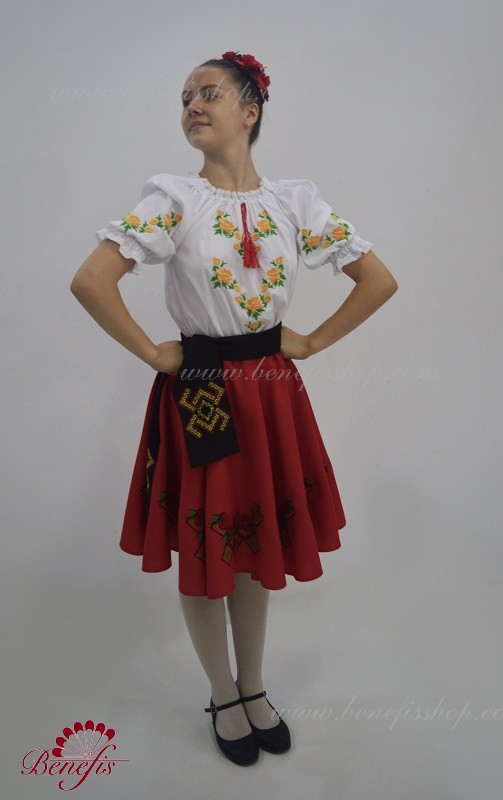 The blouse is made of shirt fabric. An elastic band is inserted on the neckline and arm ruffles and is decorated with natural lace. The embroidery is made in the national style on a special machine.
