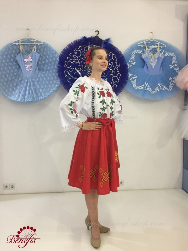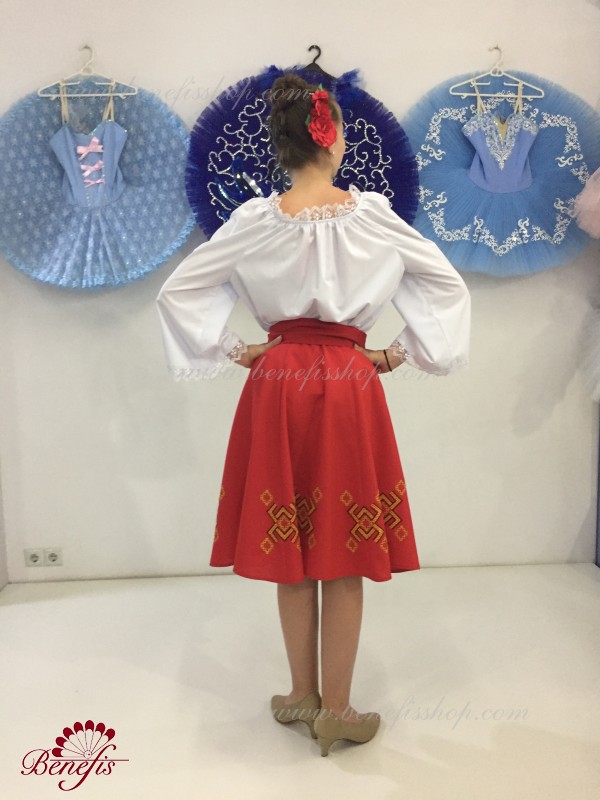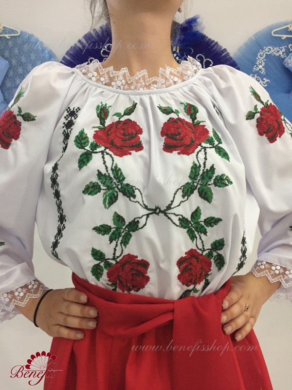 The blouse is made of shirt fabric. An elastic band is inserted on the neckline and arm ruffles and is decorated with natural lace. The embroidery is made in the national style on a special machine.