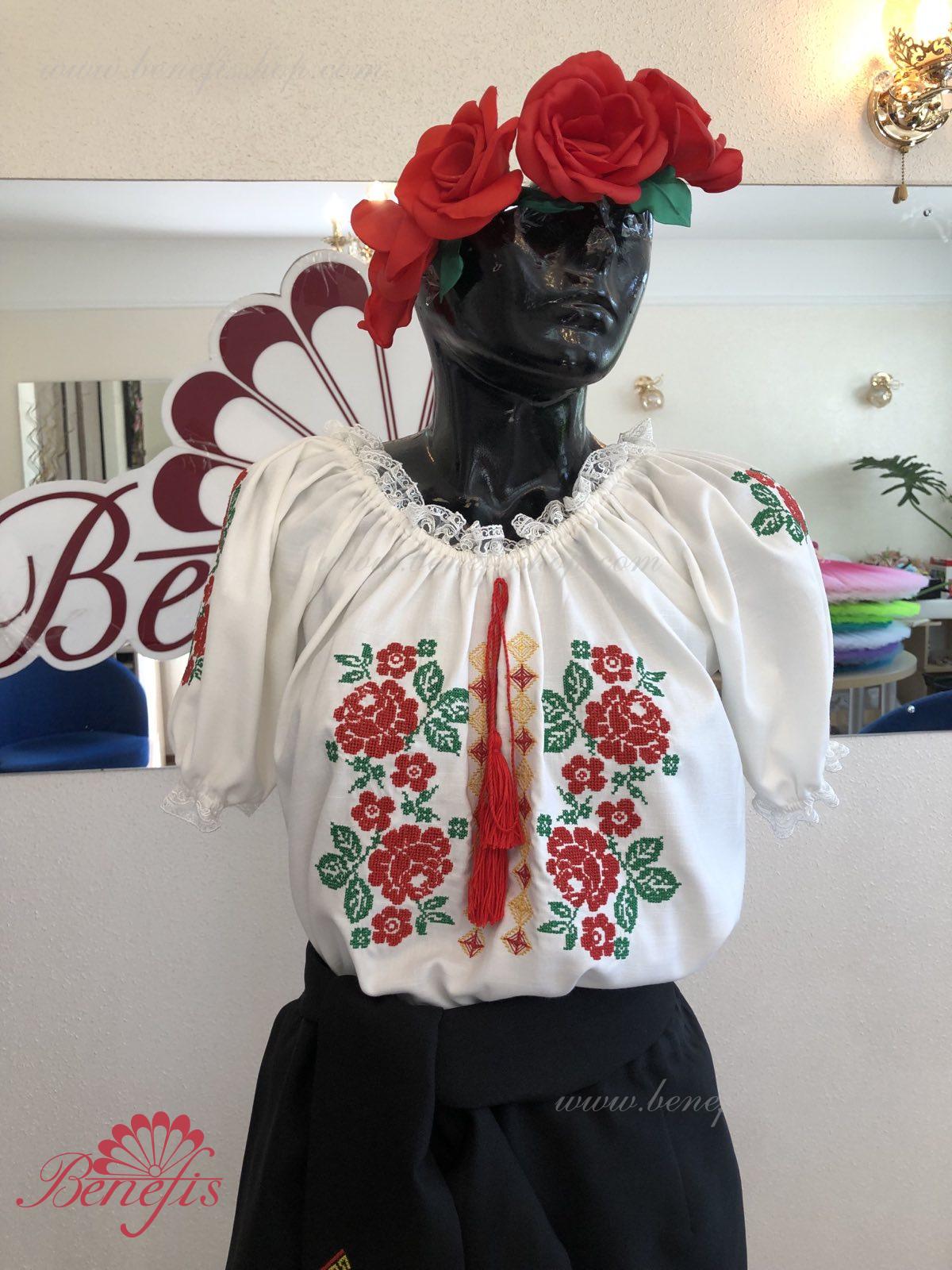 The blouse is made of shirt fabric. An elastic band is inserted on the neckline and arm ruffles and is decorated with natural lace. The embroidery is made in the national style on a special machine.