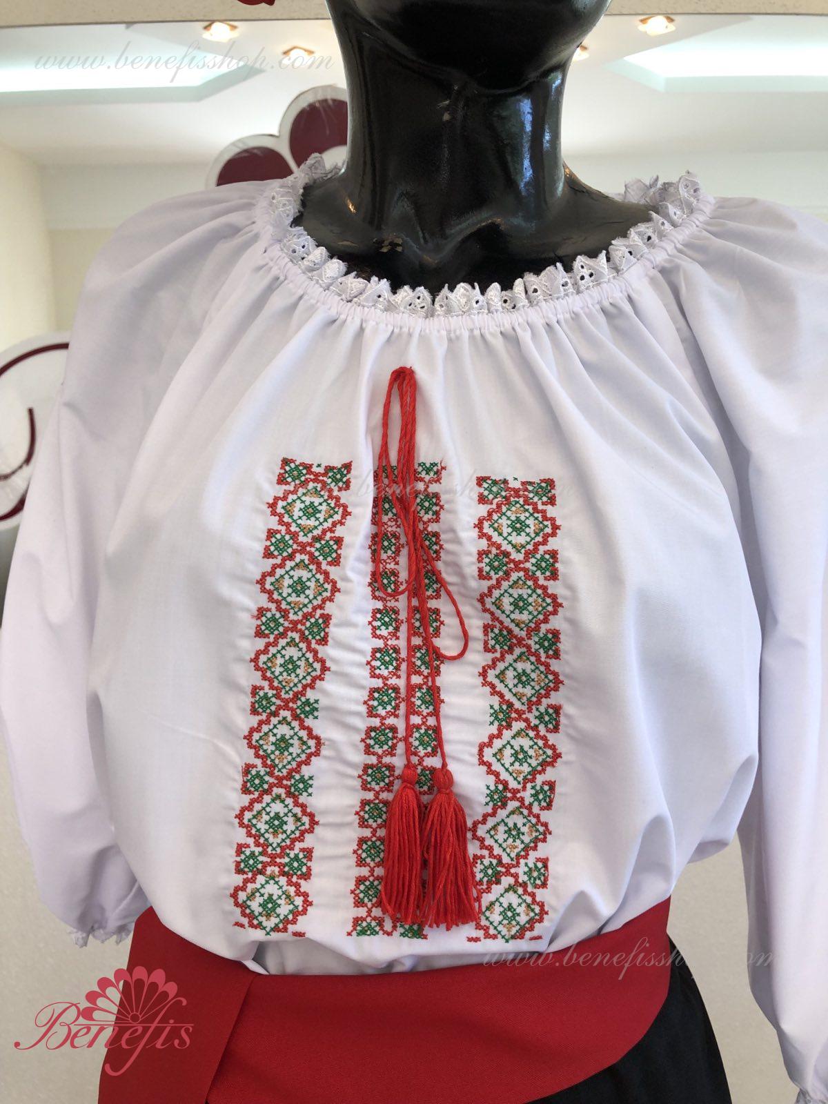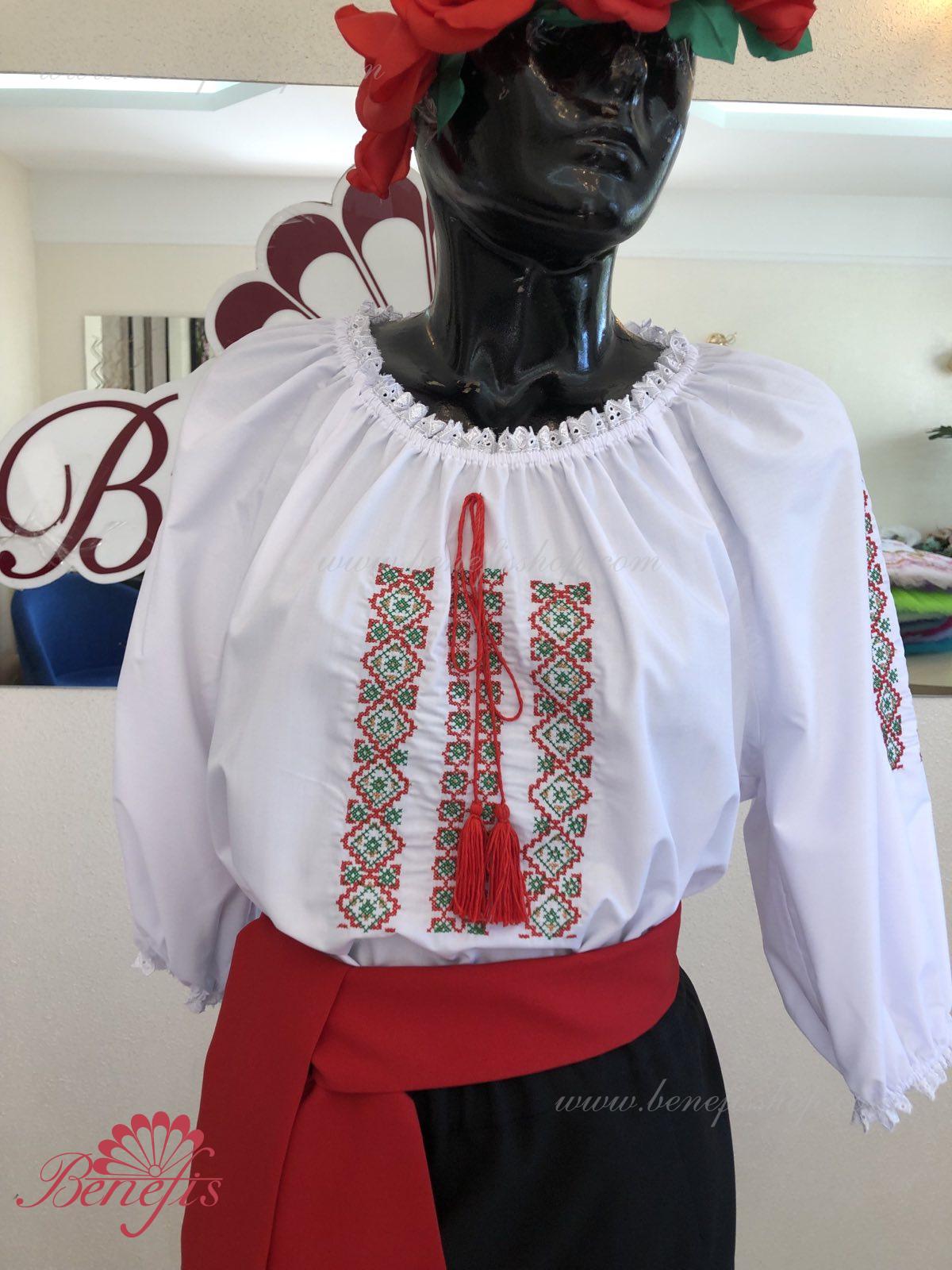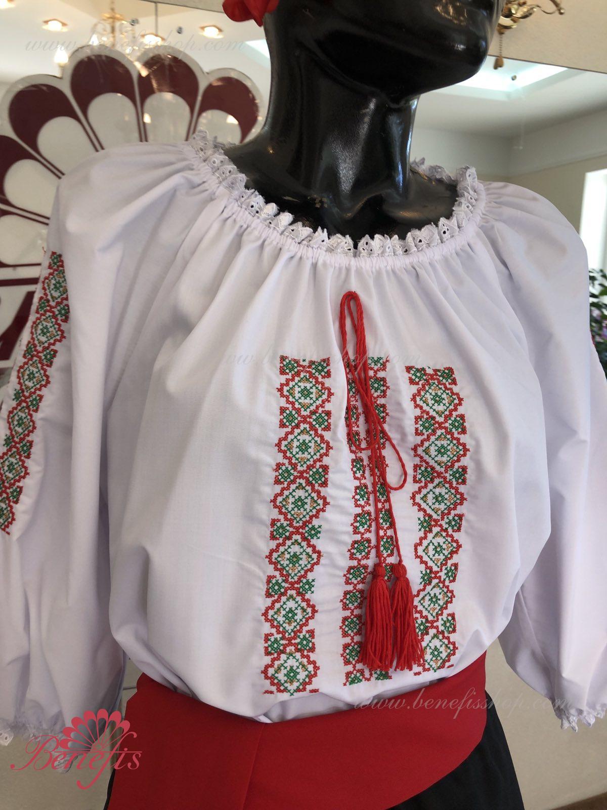 The blouse is made of shirt fabric. An elastic band is inserted on the neckline and arm ruffles and is decorated with natural lace. The embroidery is made in the national style on a special machine.