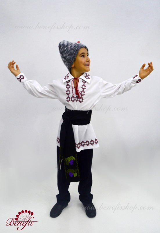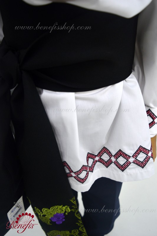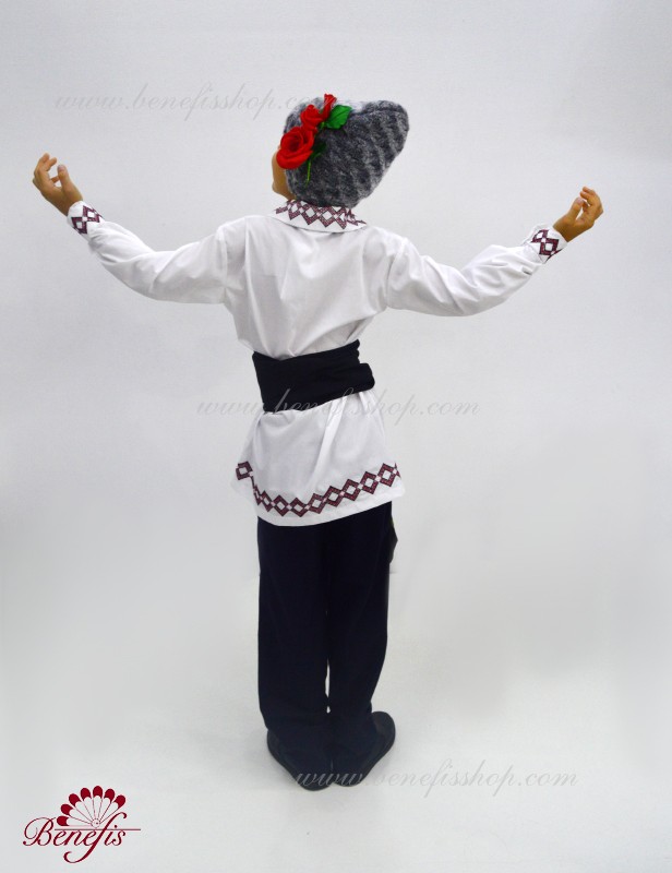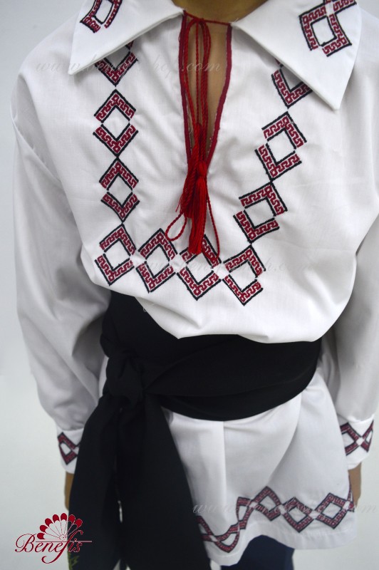 Details: shirt. A shirt for a national costume for a boy is a shirt with a long sleeve made of magpie fabric. The collar, bottom and sleeves of the shirt are decorated with threads with national motifs. The embroidery is made on a special machine.