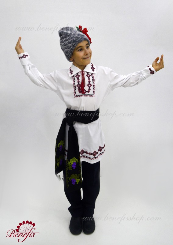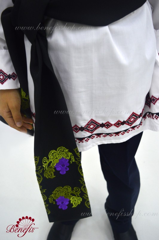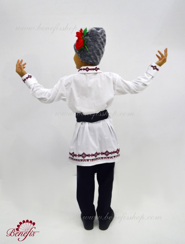 Details: shirt. A shirt for a national costume for a boy is a shirt with a long sleeve made of magpie fabric. The collar, bottom and sleeves of the shirt are decorated with threads with national motifs. The embroidery is made on a special machine.
