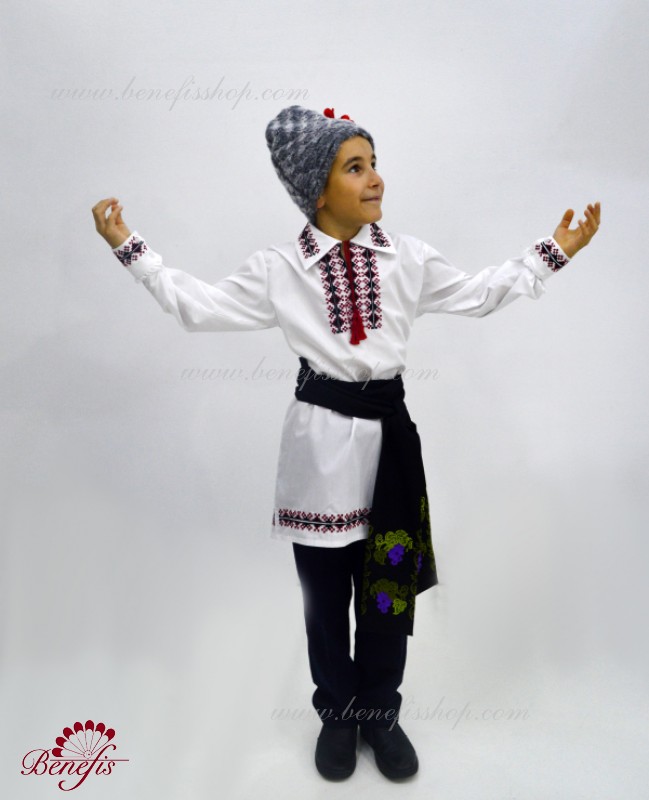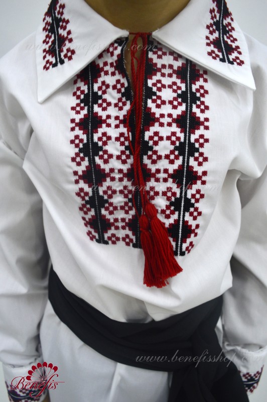 Details: shirt. A shirt for a national costume for a boy is a shirt with a long sleeve made of magpie fabric. The collar, bottom and sleeves of the shirt are decorated with threads with national motifs. The embroidery is made on a special machine.