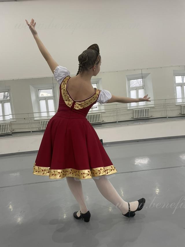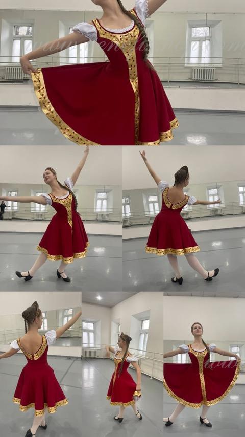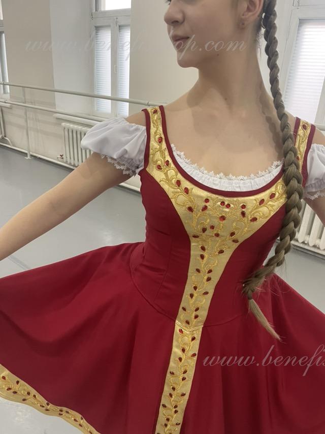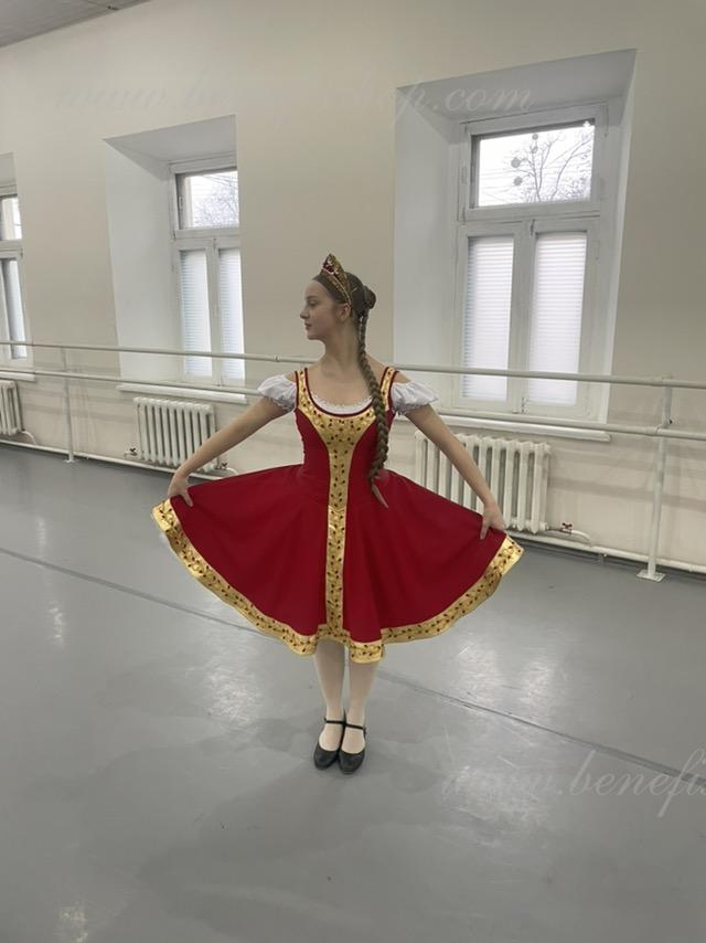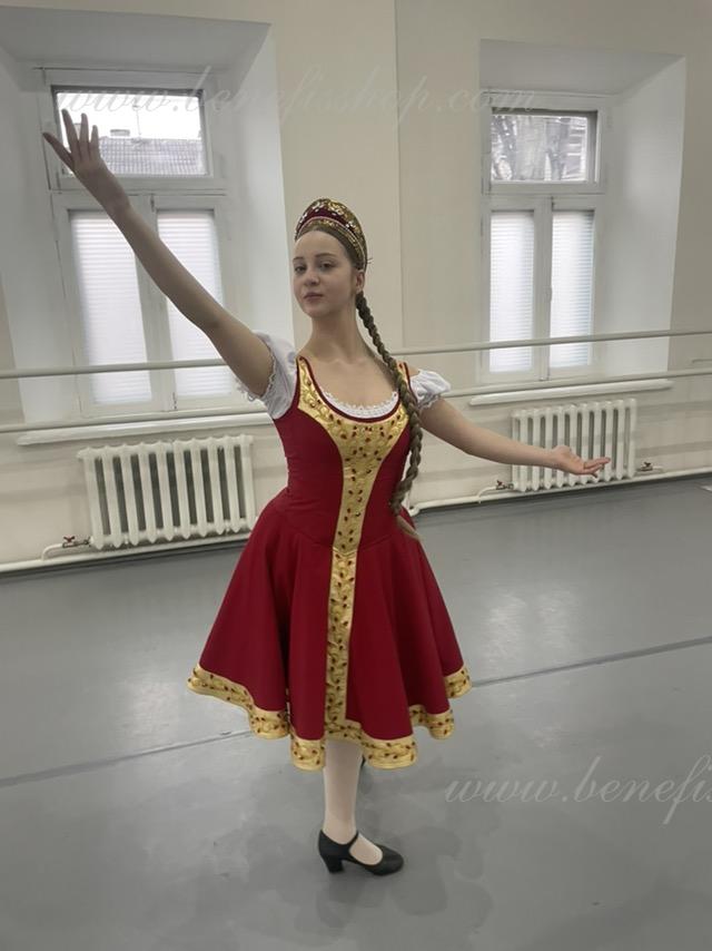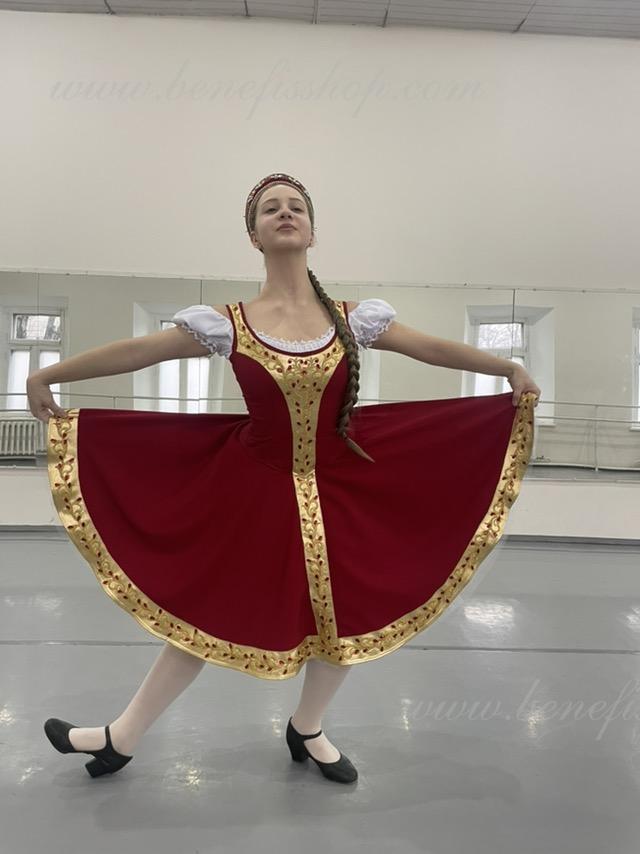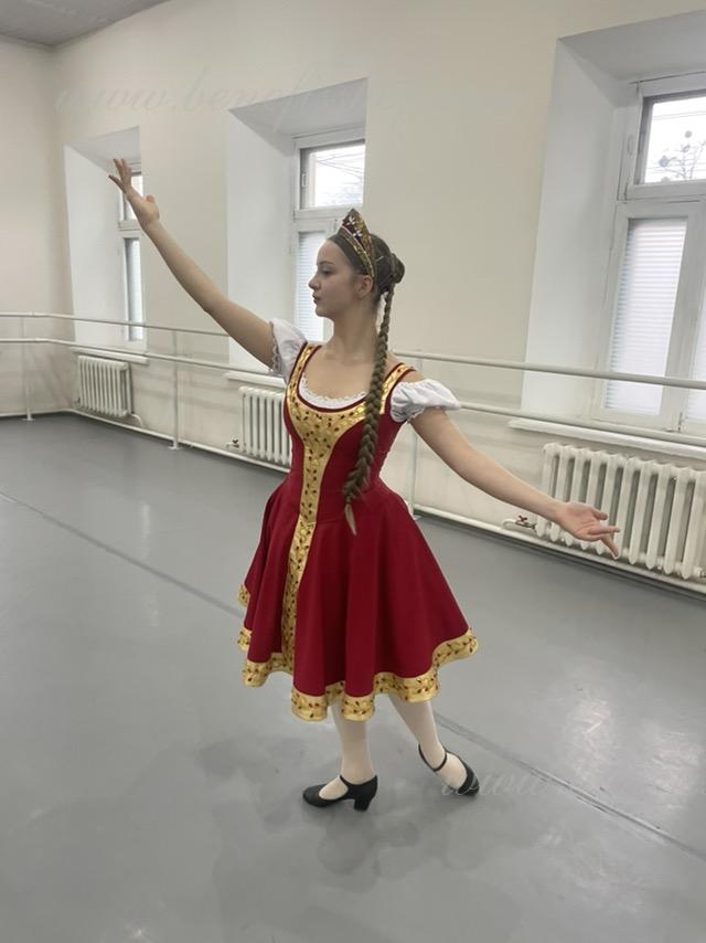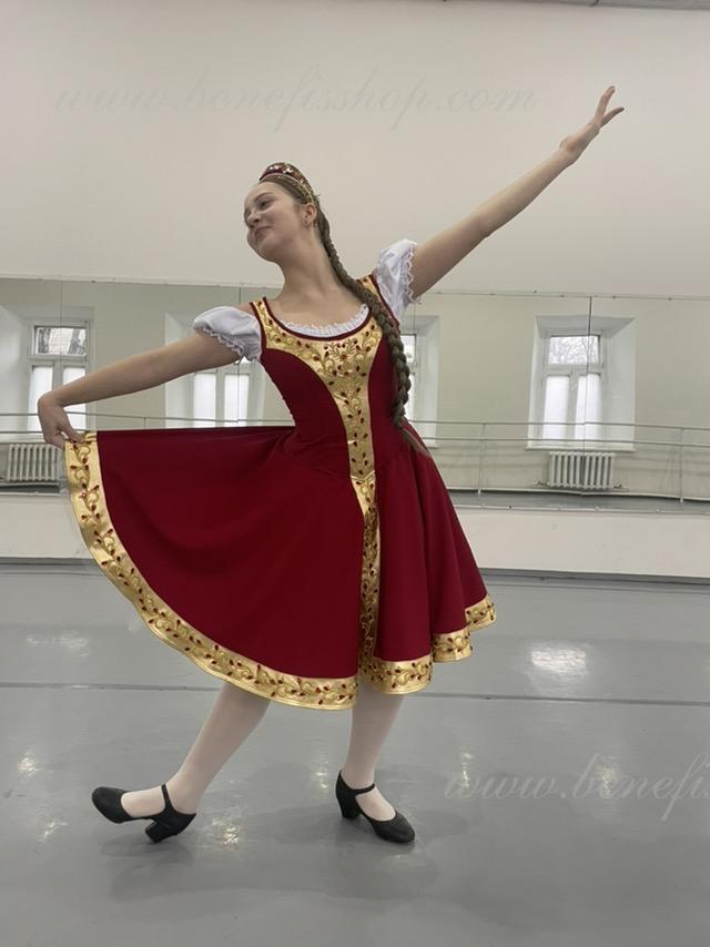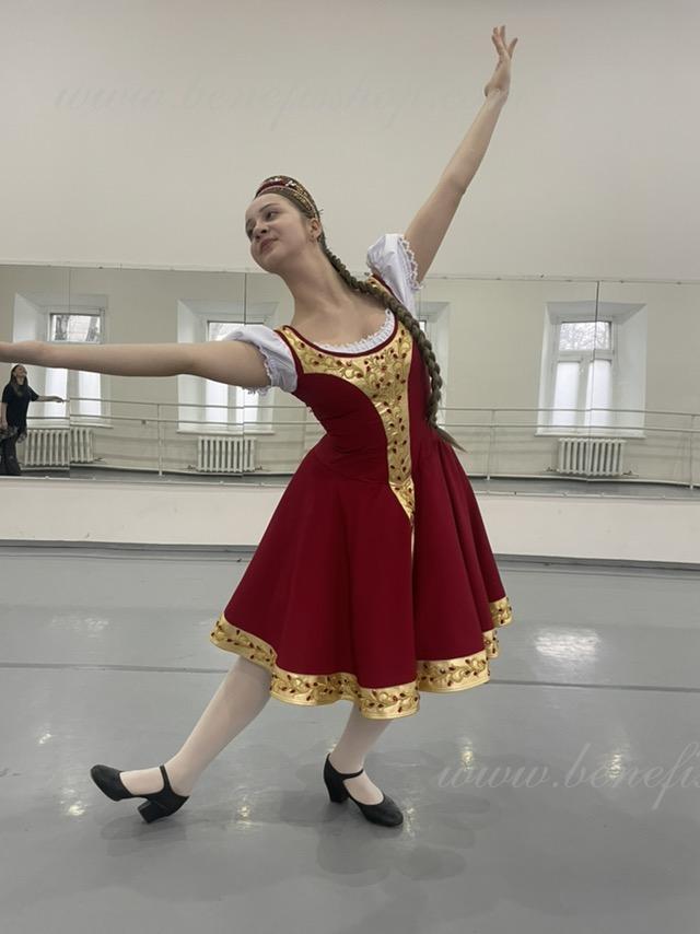 Costume :sundress, headdress. The sleeves are sewn in, the blouse is issued. The costume is made of satin, felt, tulle. Decor: lace braid.