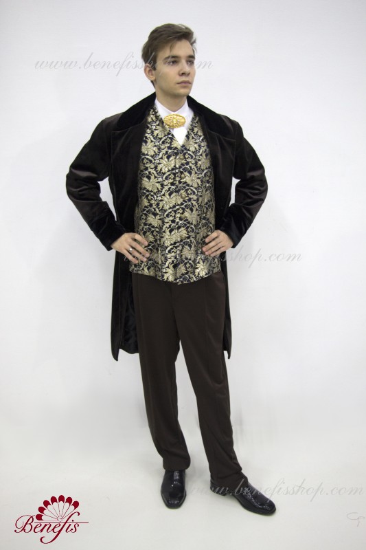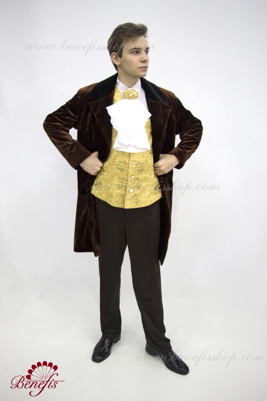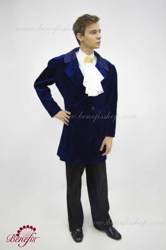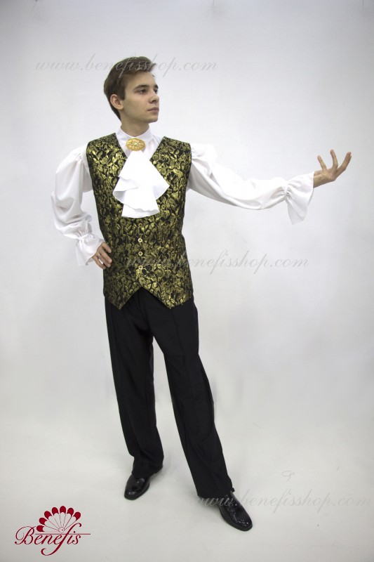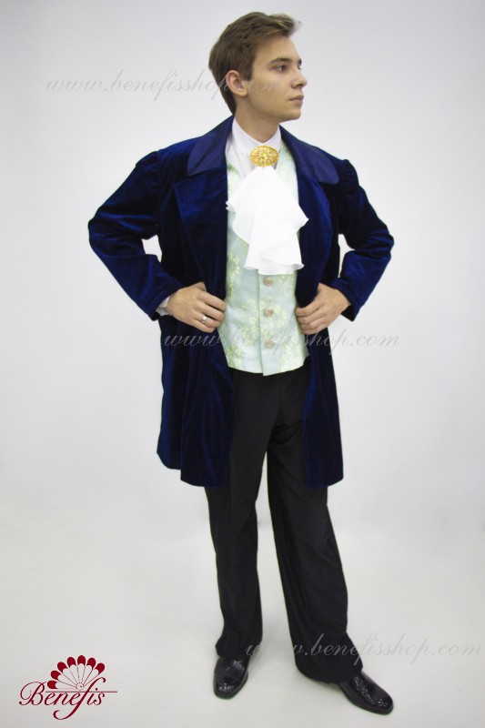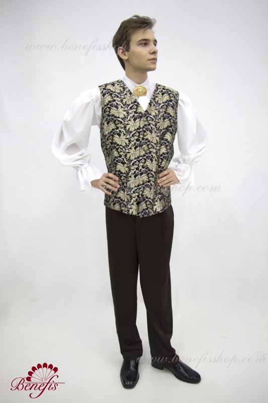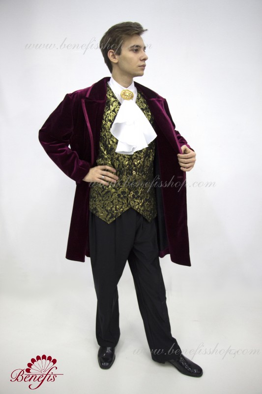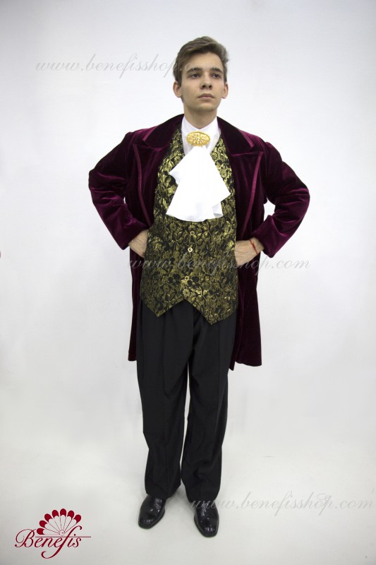 Details: tunic, shirt, vest, trousers. This is a ballet stage costume. The tunic is made of semi-elastic velvet. Chiffon blouse decorated with frill. Supplex trousers and brocade vest. The tunic, in turn, is fastened with buttons such as trousers and a vest. Only professional designers and seamstresses work on the product. The costume can be made in any color at the customer's choice.
