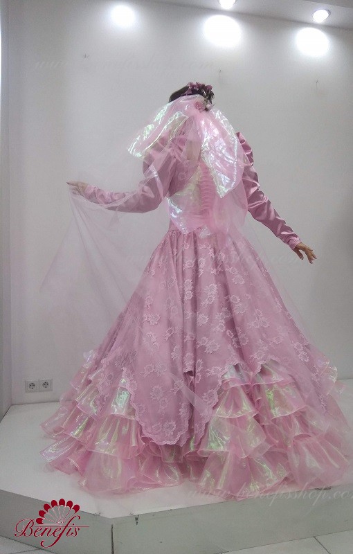 This professional ballet stage costume is made on the basis of a professional basic tutu # T 0013 (see the section "Basic and rehearsal ballet tutus"). The bodice is made of satin, partially duplicated by guipure. Yoke separately ,shoulder seams, lacing at the back, without hooks. A skirt with organza ruffles, covered with a guipure tire, all on a crinoline.