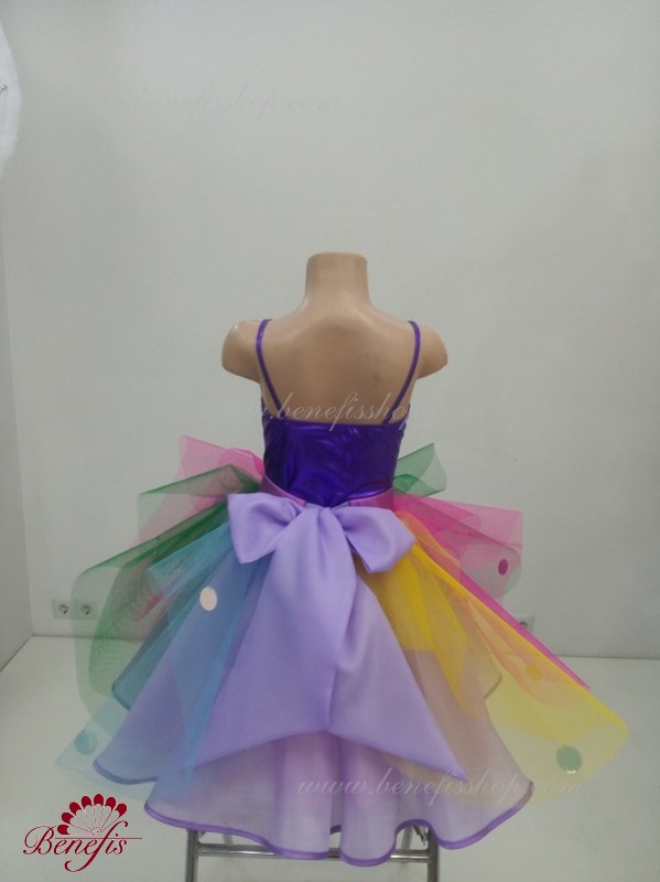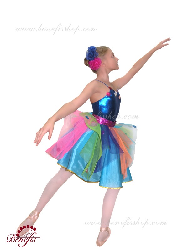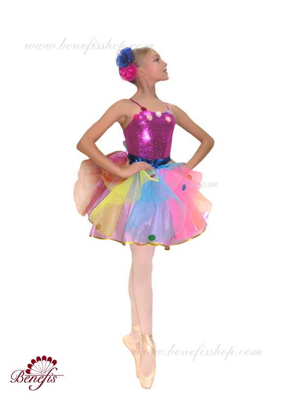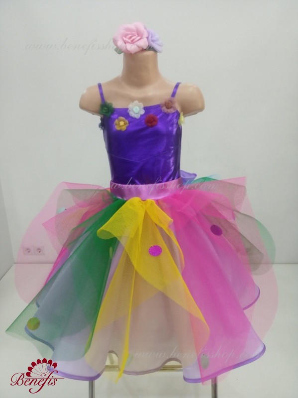 The costume is made of supplex, a soft silk fabric and tulle of seven colors. There is a wreath of artificial flowers on the head.