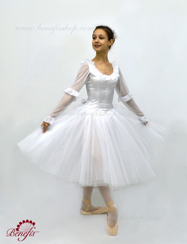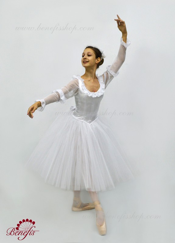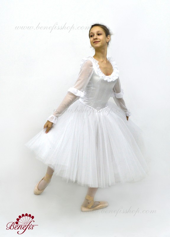 This is a professional stage costume made on the basis of the basic romantic skirt T0003. The bodice is made from semi elastic, dense fabric and is fastened with two rows of hooks and loops. For convenience, the bodice is regulated by a lace at the chest. The sleeves are made of soft mesh. Chiffon ruches adorn the sleeves and neck. A deep neckline and a large bow give the costume elegance. Professional seamstresses work on the costume and it can be made in any color at the request of the customer.