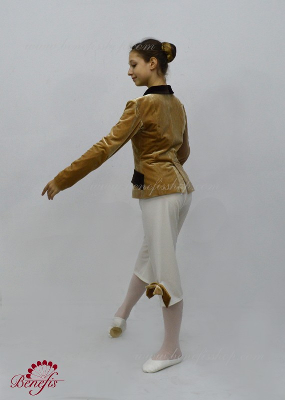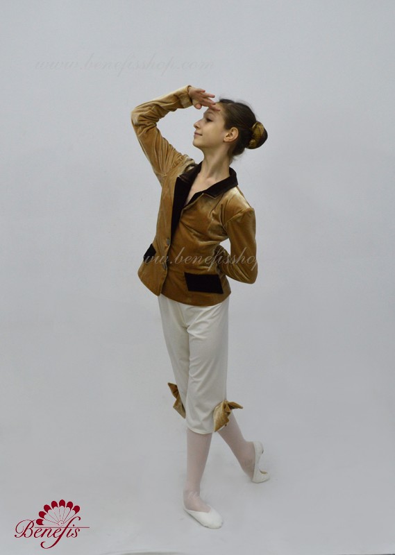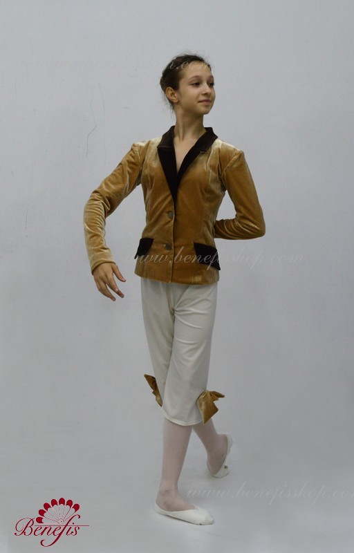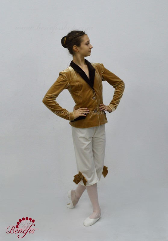 This is a professional stage costume. Tunic and shorts are made of semi elastic, dense fabric. Fastens in front with buttons. The tunic has a tight collar and valves in a contrasting color. Shorts are decorated with large bows.