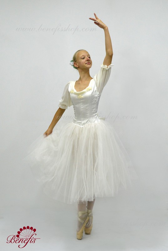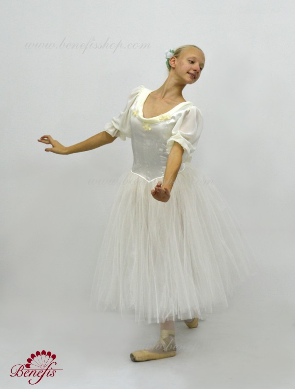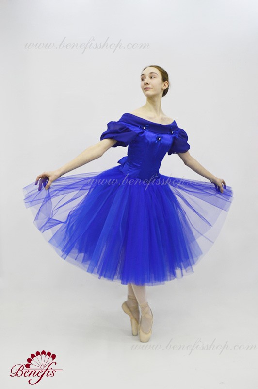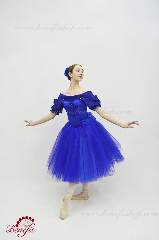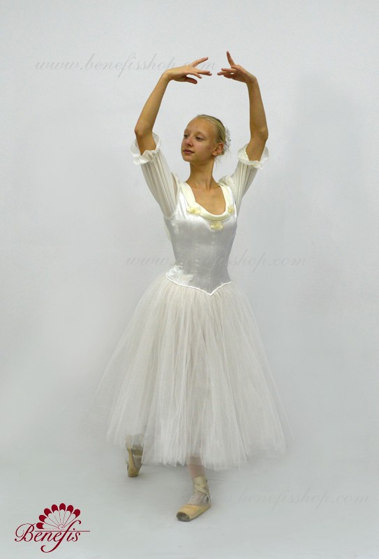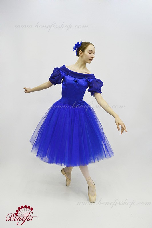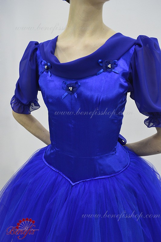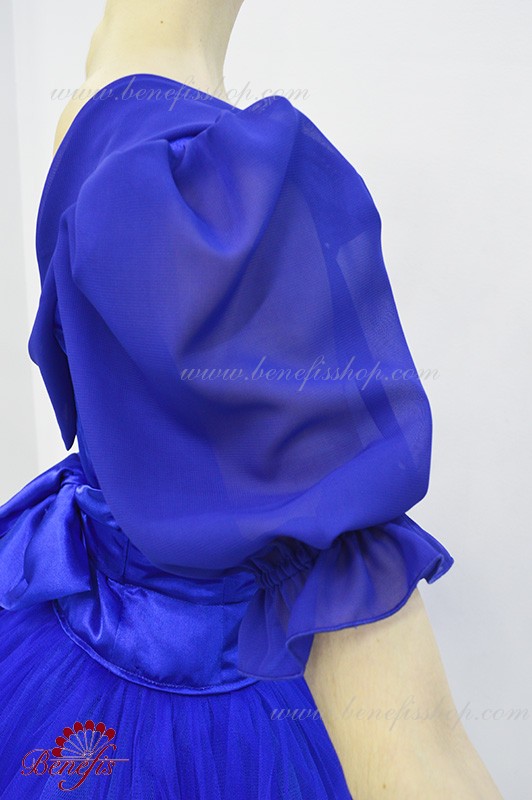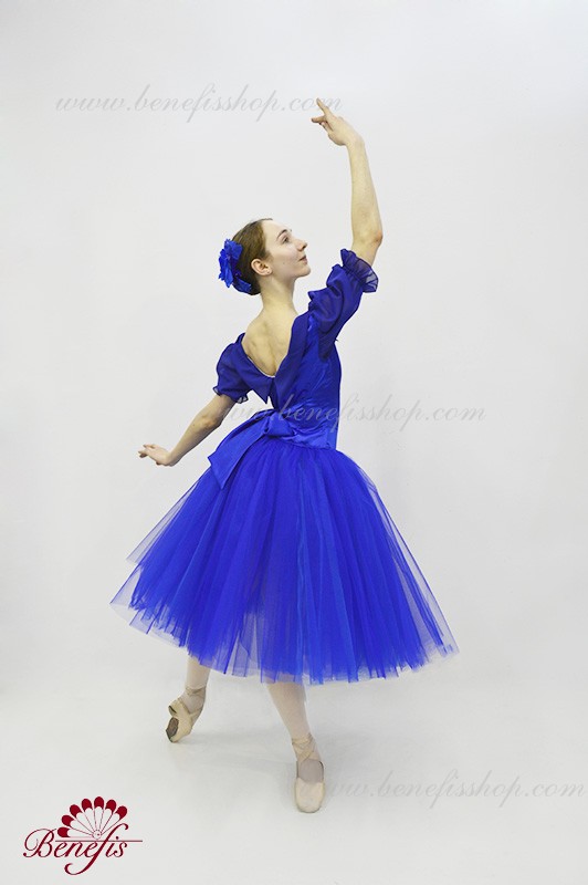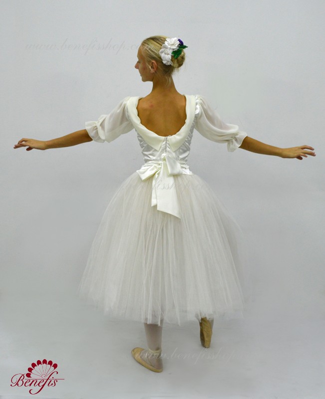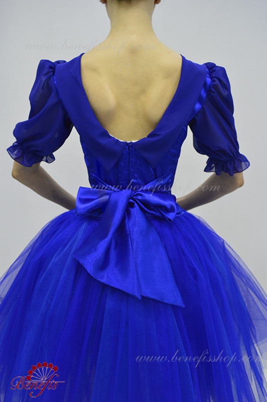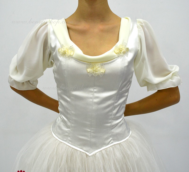 This is a professional ballet stage dress. Made from shiny semi elastic taffeta. A bodice with shoulder seams and sleeves made of delicate chiffon. The neck is trimmed with a chiffon collar and decorated with flowers. A deep neckline and a huge bow make the costume even more elegant. The base skirt T 0003 consists of 6 layers of soft and hard tulle.