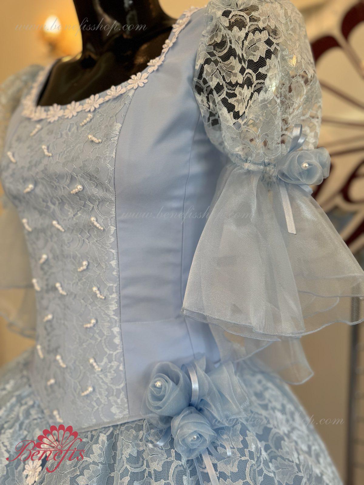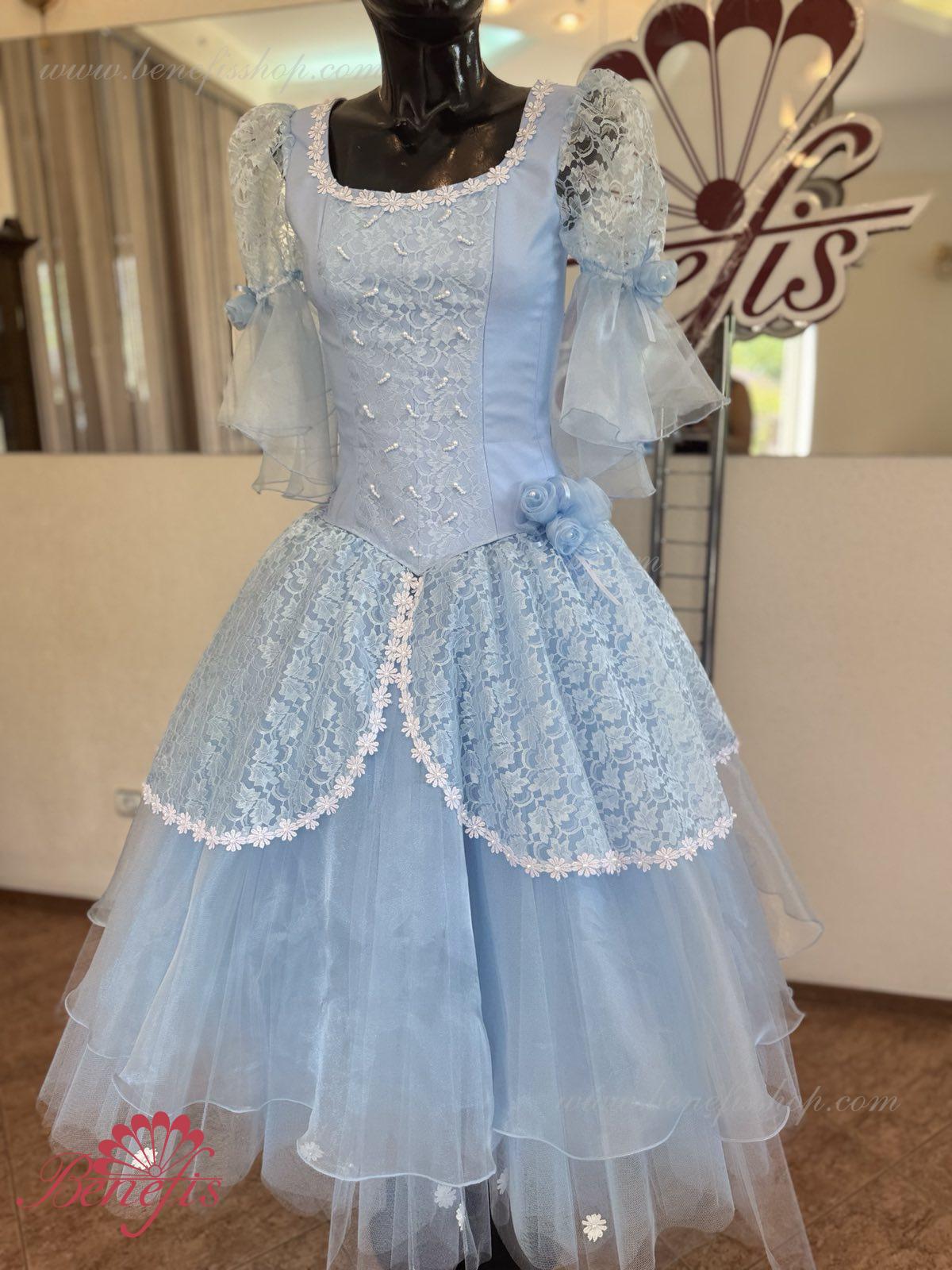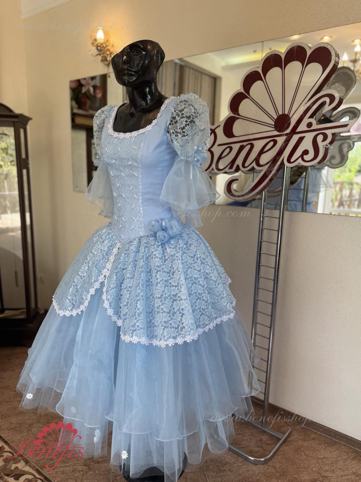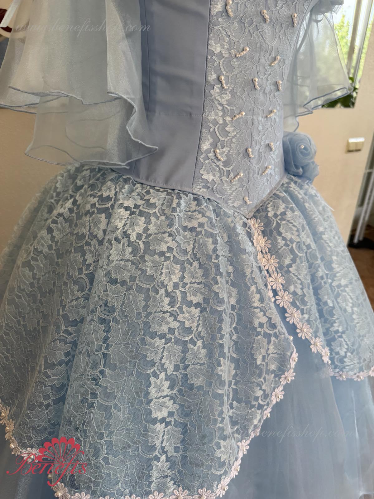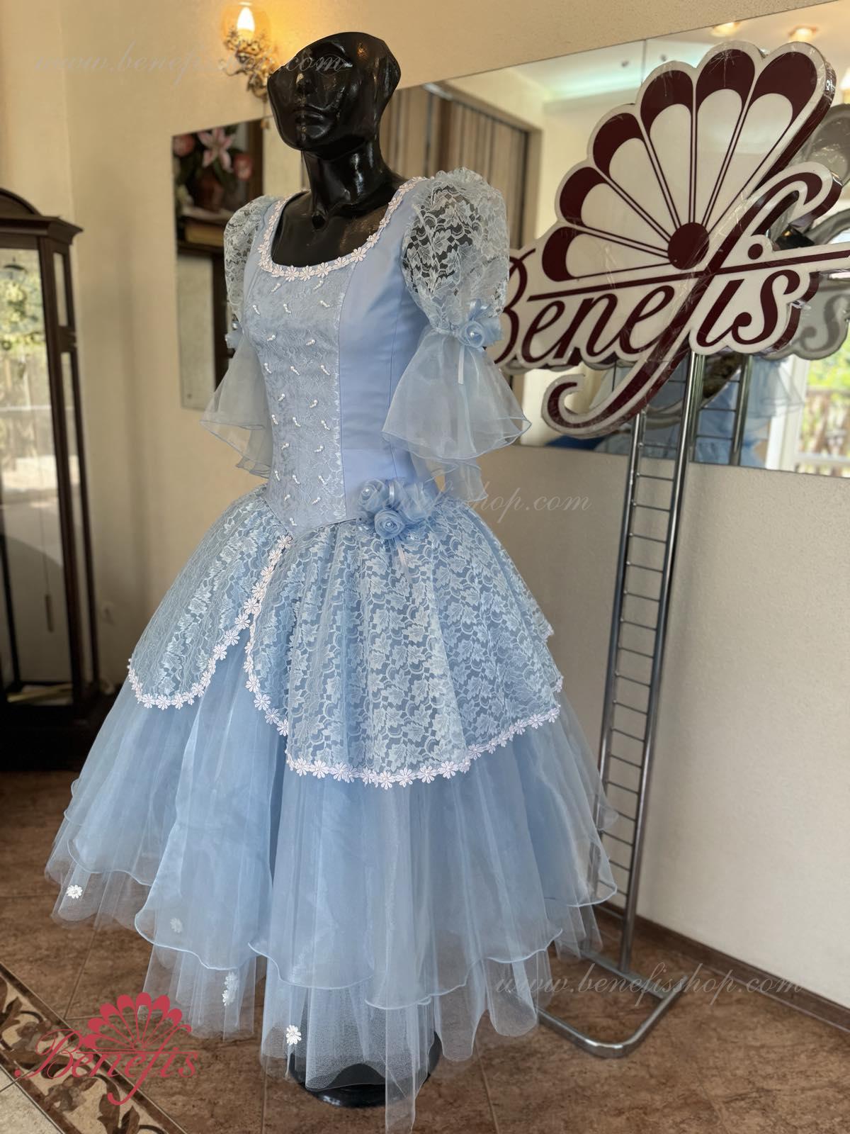 The dress’s bodice is made of dense fabric, embellished with braid, applications, bugles, strasses. Wide lower skirt is made of several layers of rough and soft tulle. The upper skirt is made of one layer of organza and one short guipure layer. The laced braid in the form of flowers, flowers on the sleeves and on the waist make this dress especially elegant.