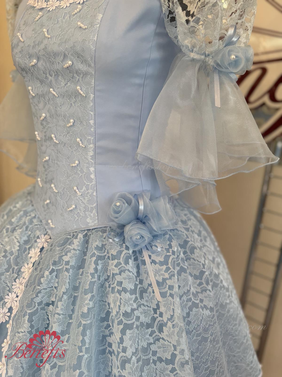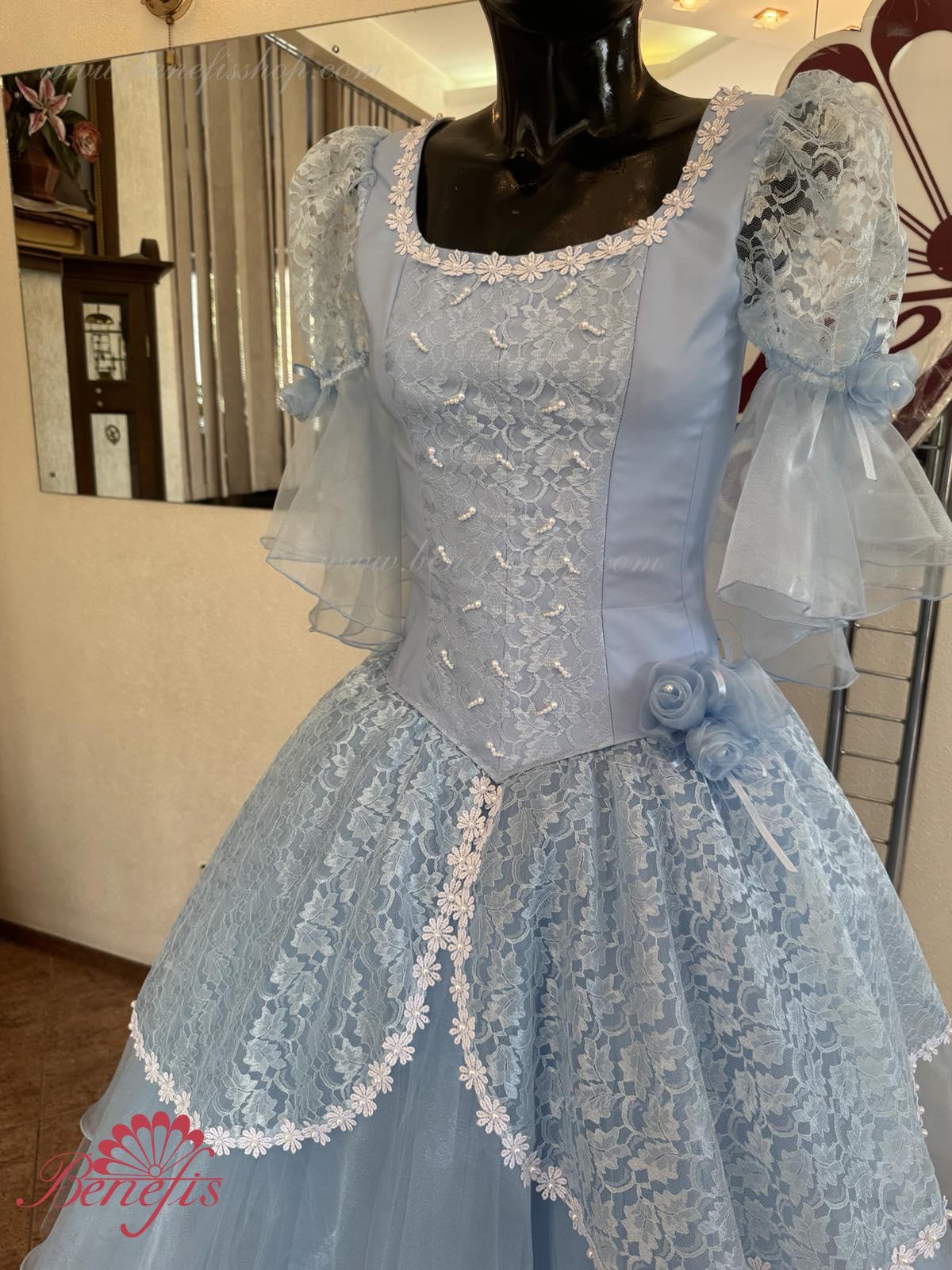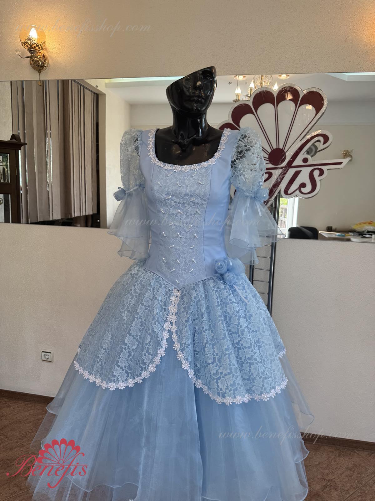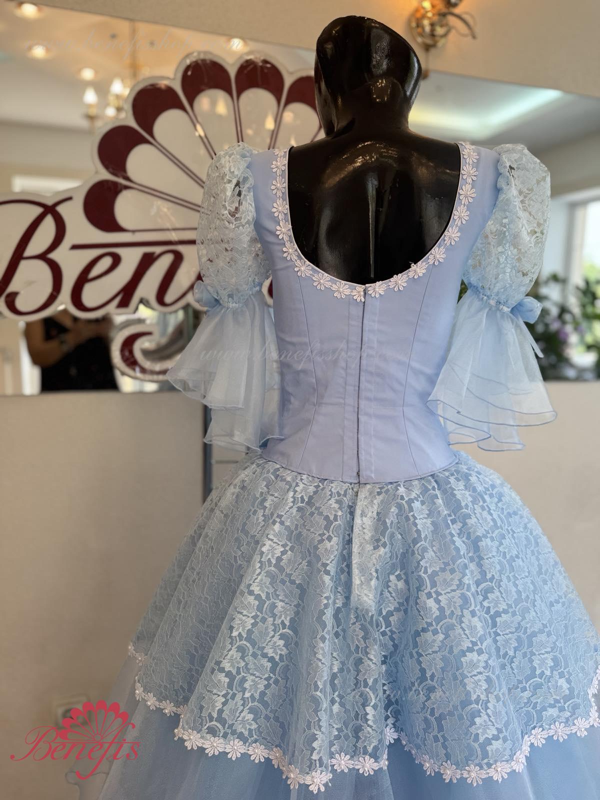 The dress’s bodice is made of dense fabric, embellished with braid, applications, bugles, strasses. Wide lower skirt is made of several layers of rough and soft tulle. The upper skirt is made of one layer of organza and one short guipure layer. The laced braid in the form of flowers, flowers on the sleeves and on the waist make this dress especially elegant.
