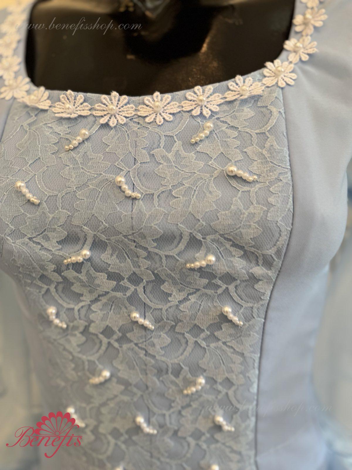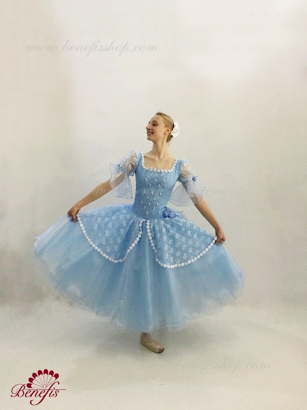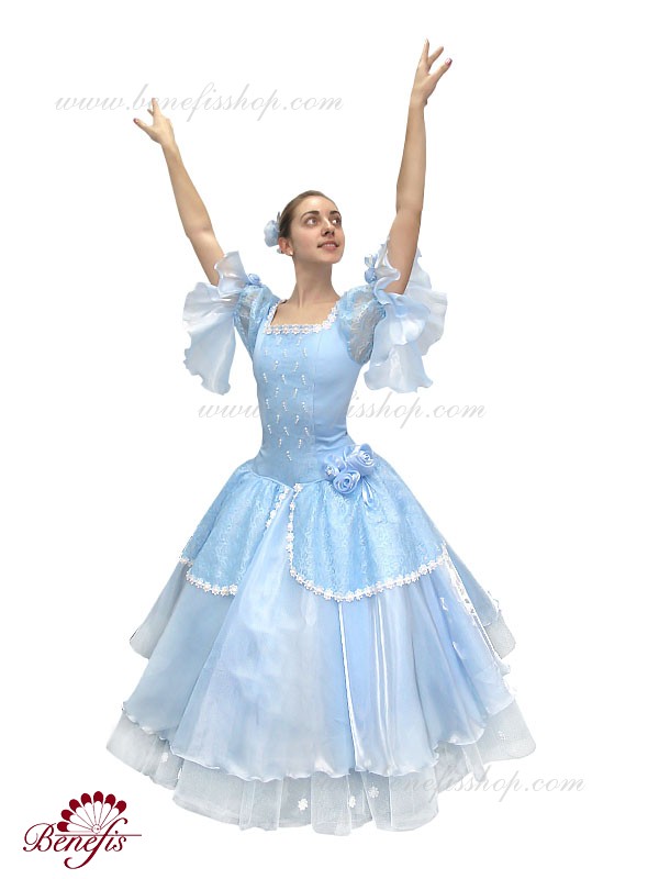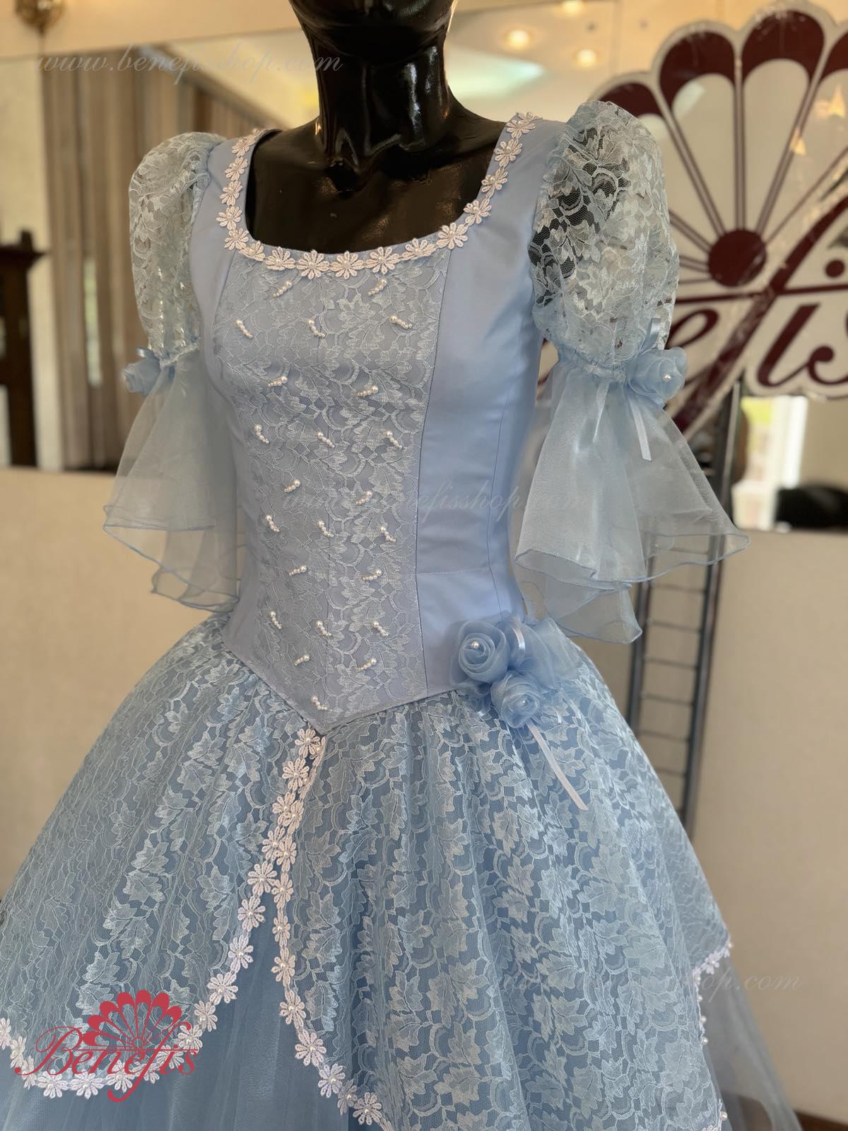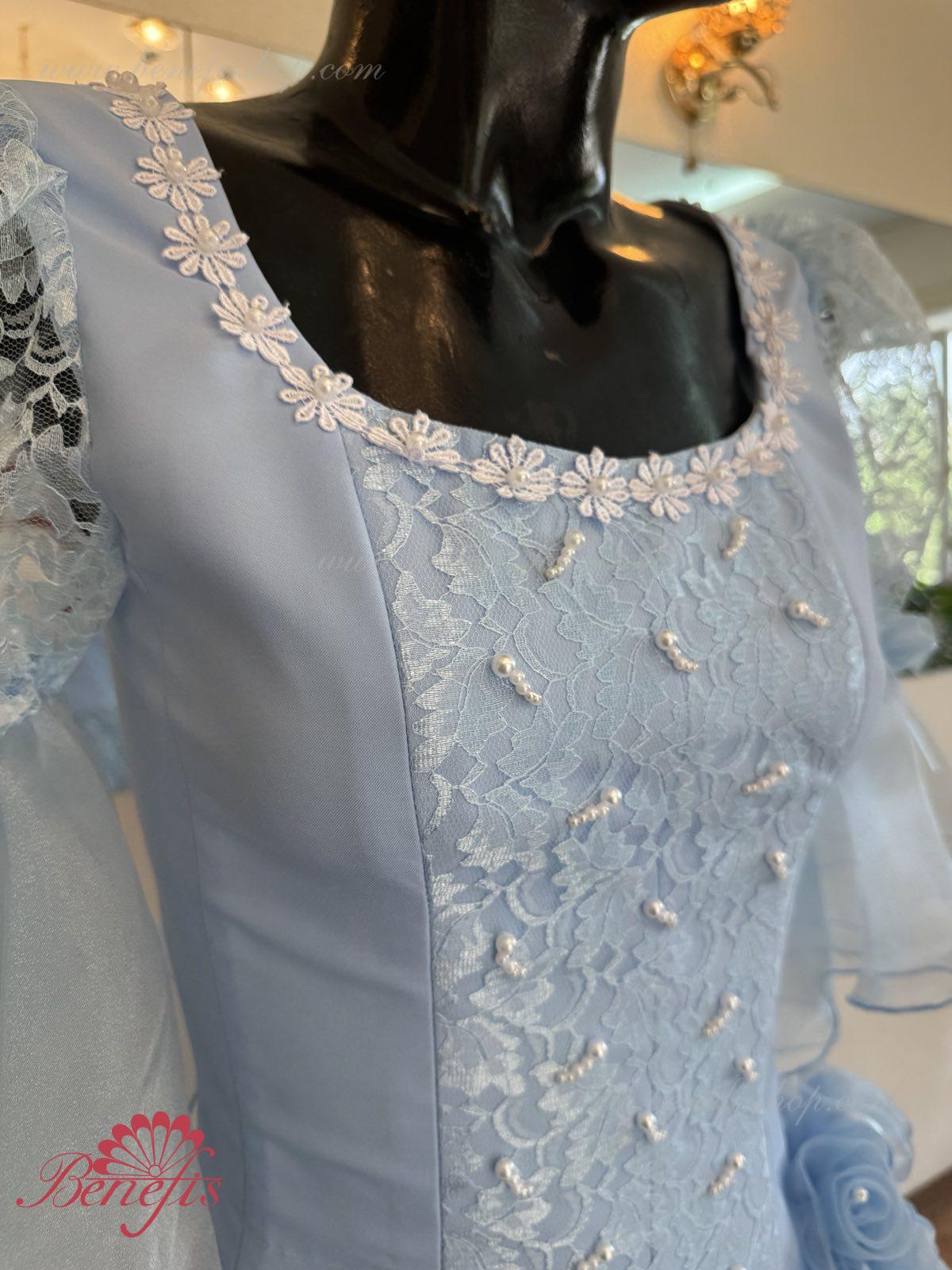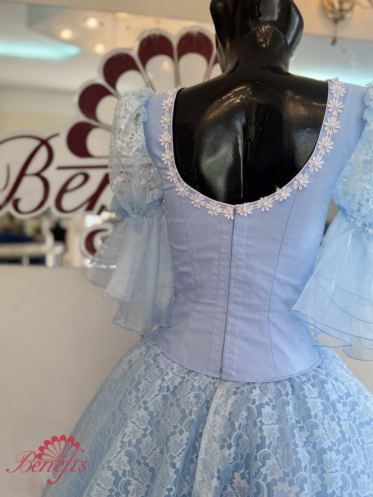 The dress’s bodice is made of dense fabric, embellished with braid, applications, bugles, strasses. Wide lower skirt is made of several layers of rough and soft tulle. The upper skirt is made of one layer of organza and one short guipure layer. The laced braid in the form of flowers, flowers on the sleeves and on the waist make this dress especially elegant.