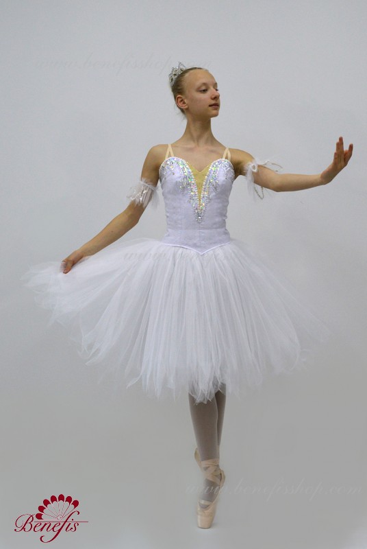 Professional ballet stage costume, based on the basic bodice T 0009. The bodice is fastened on the back with two rows of hooks and loops. For more comfortable adjustment, the bodice can be tightened with a lace at the chest. The base skirt T 0003 consists of 4 layers of soft tulle. The edges of the skirt end with teeth. In the form of decor is used a lot of beautiful sparkles, poetics and rhinestones.