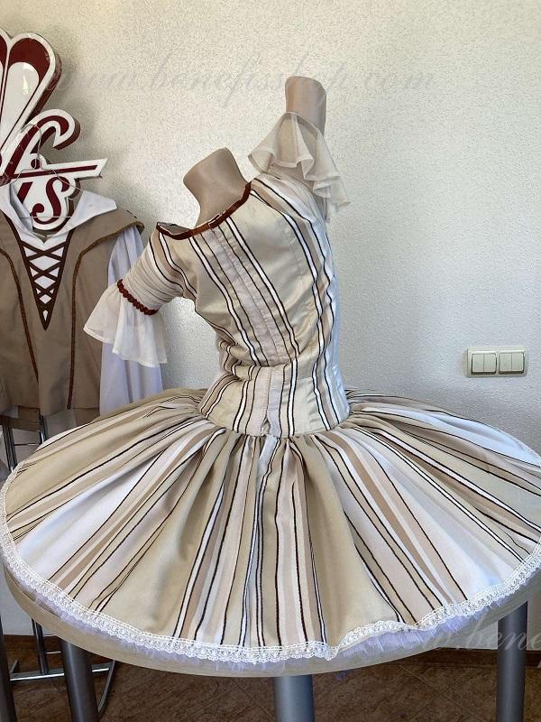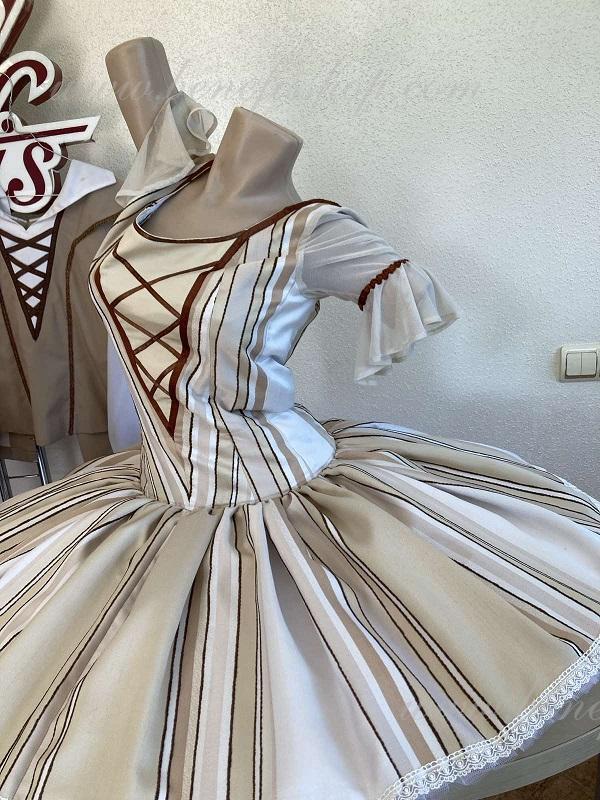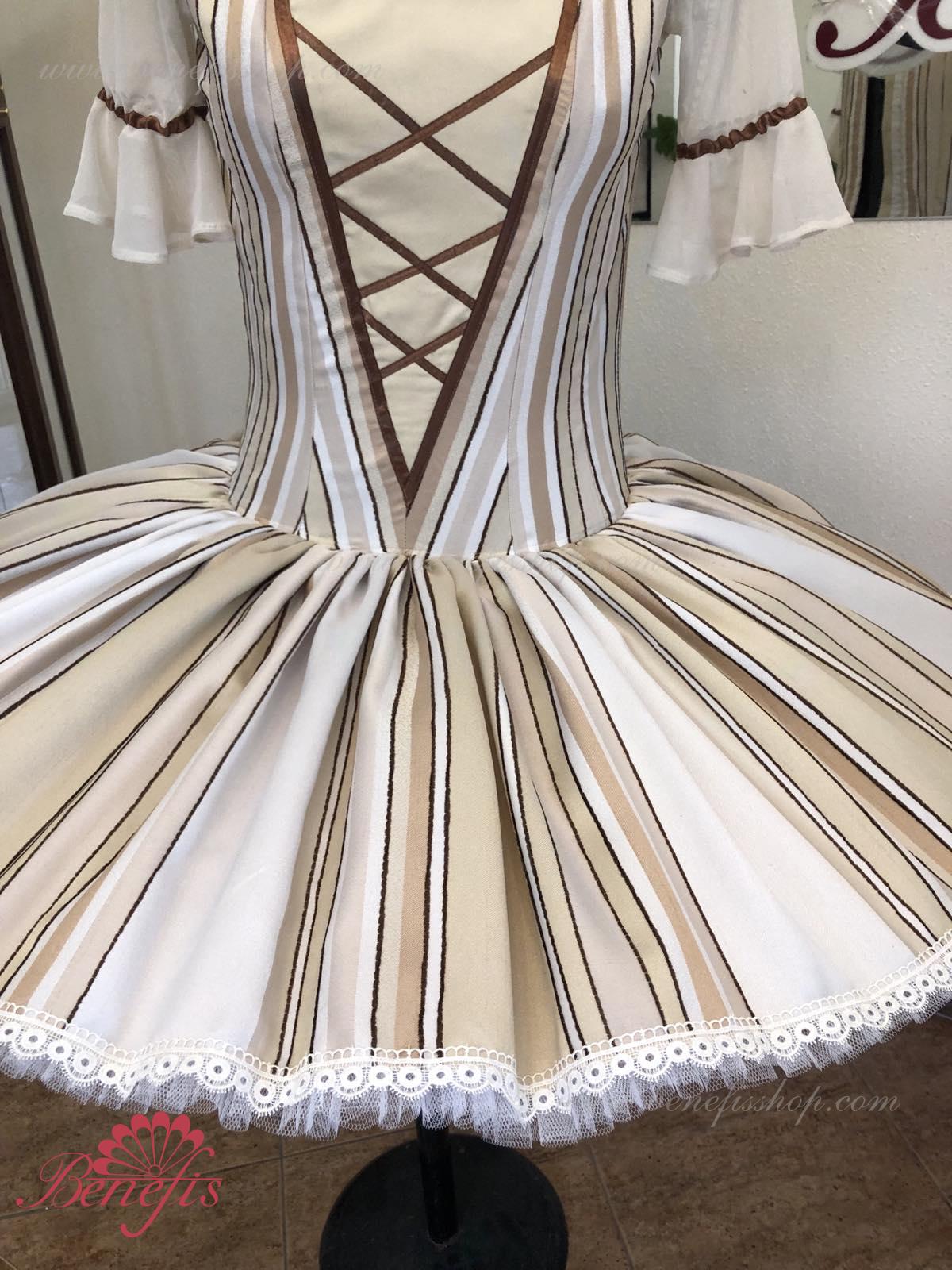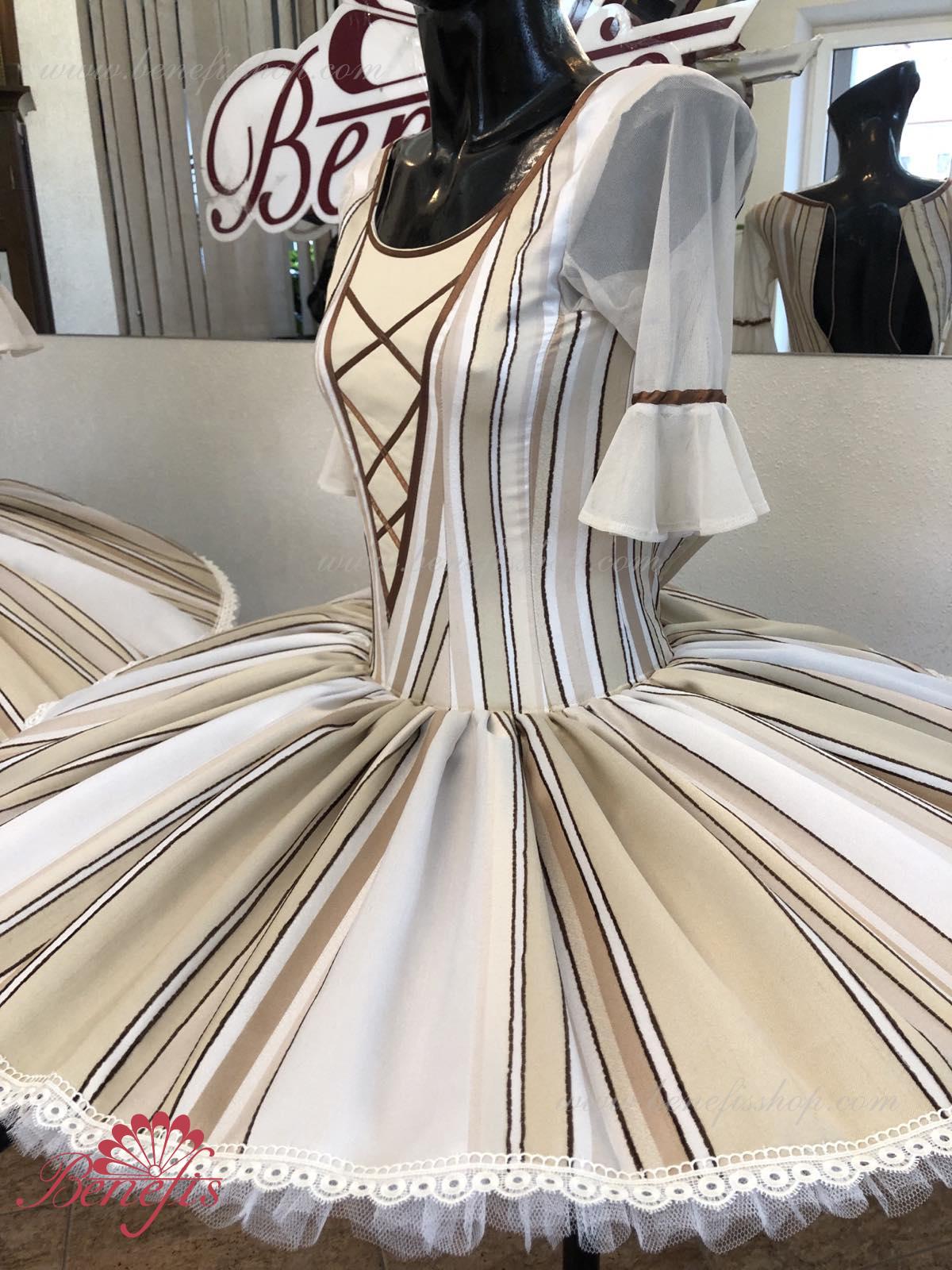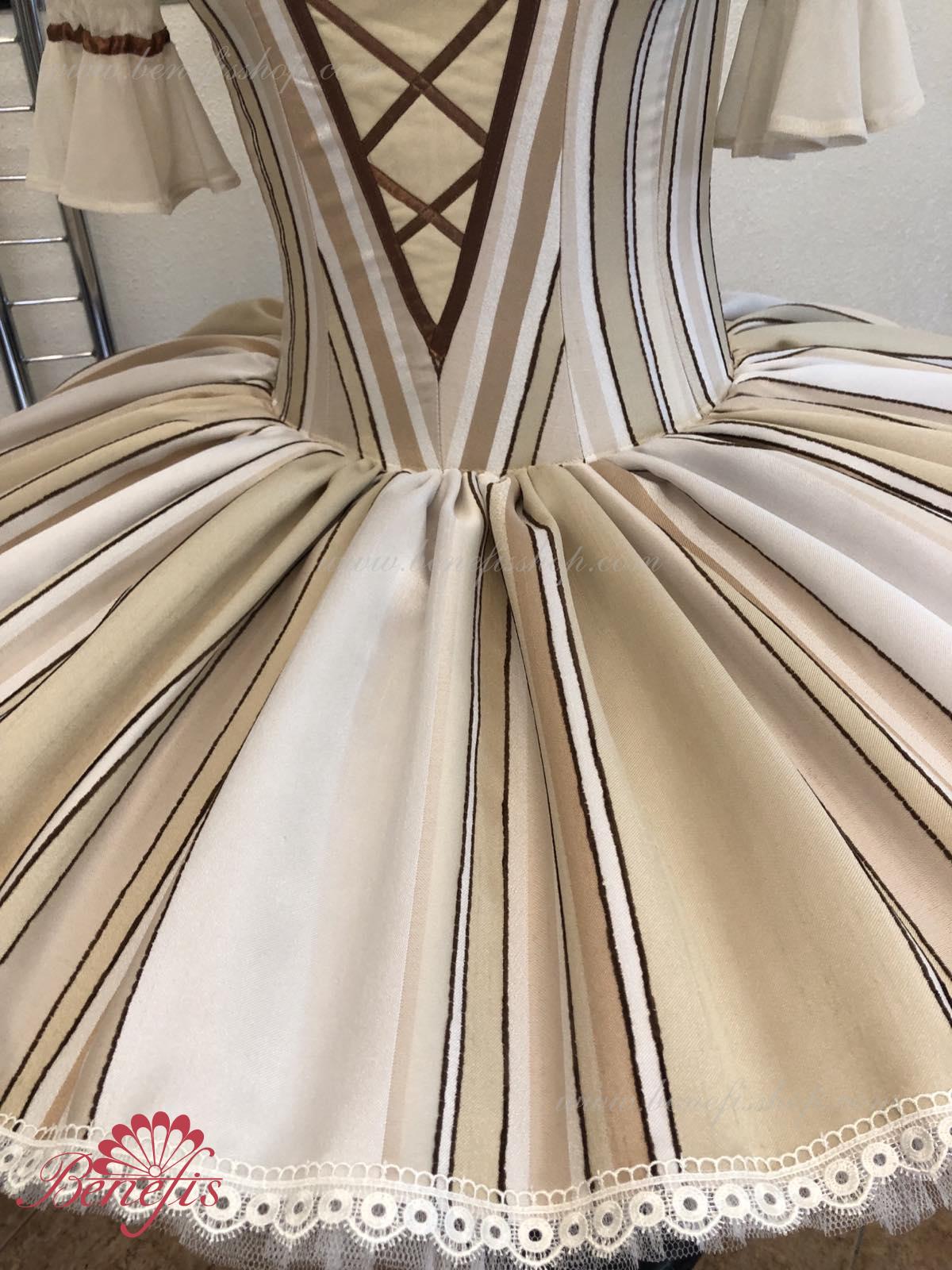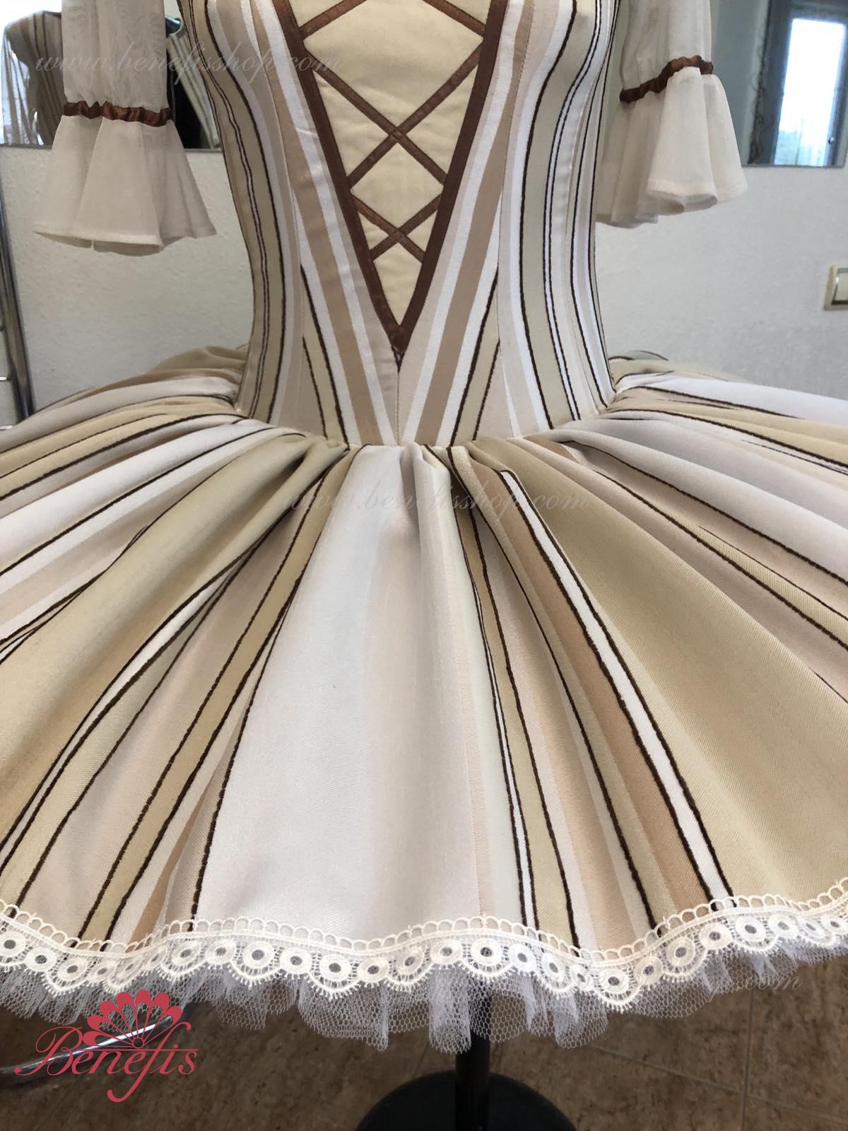 The bodice is made of semi-elastic dense fabric. For convenient adjustment, the bodice fastens at the back with 2 rows of hooks and loops. The bottom of the product is based on the T0001B base pack. The originality of the costume gives the fabric texture and pattern.