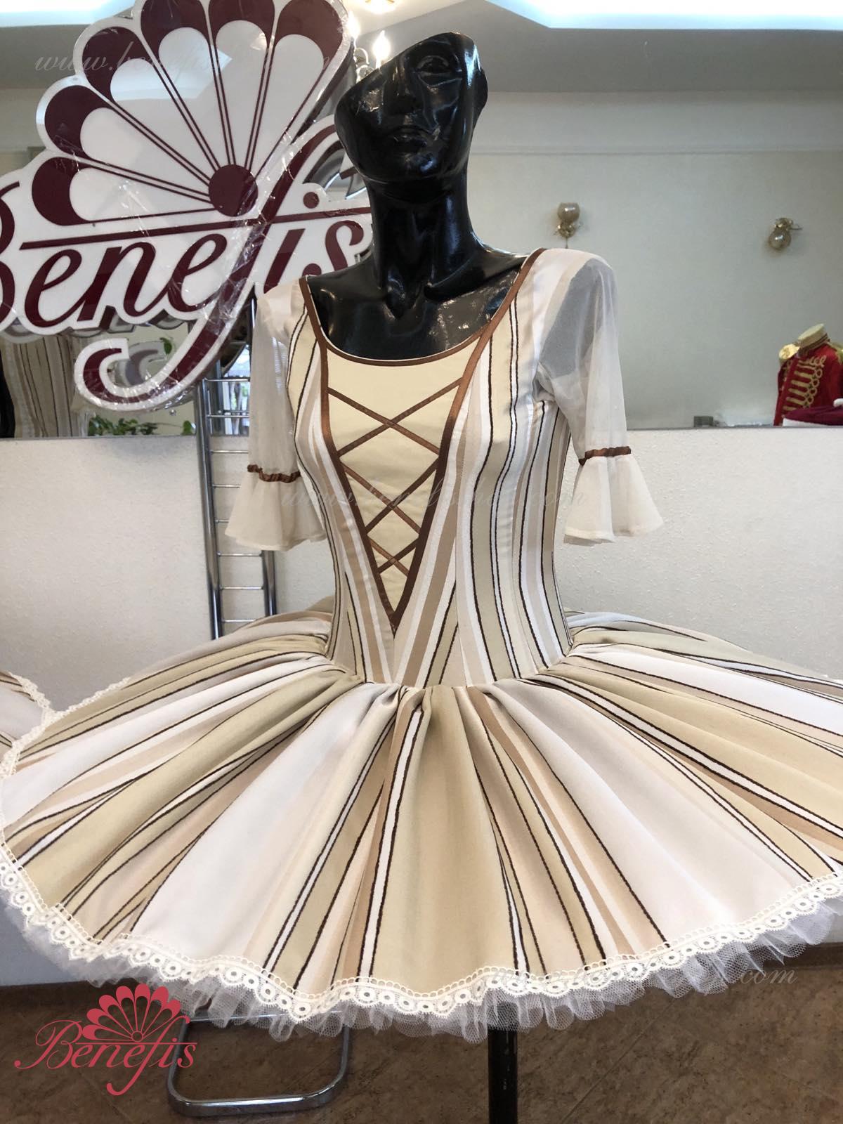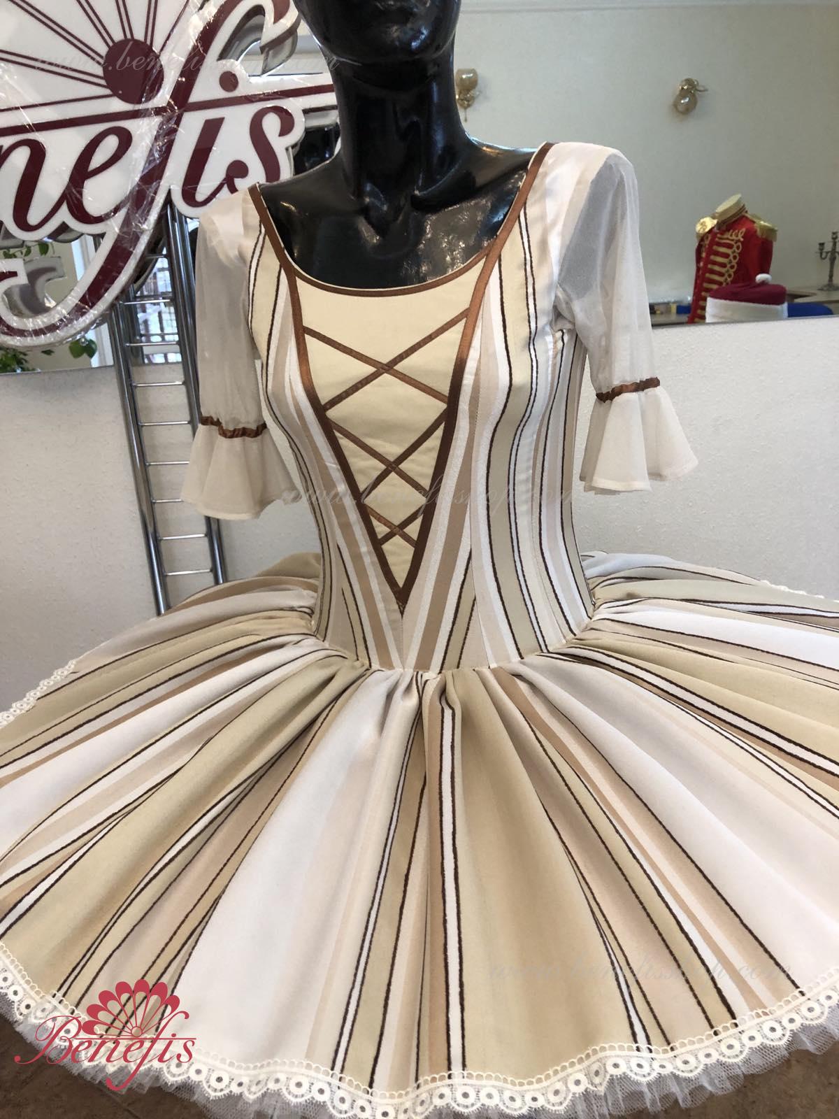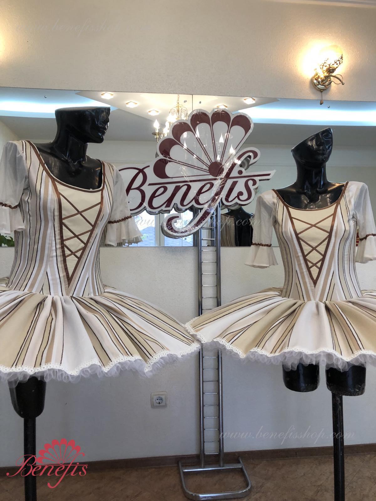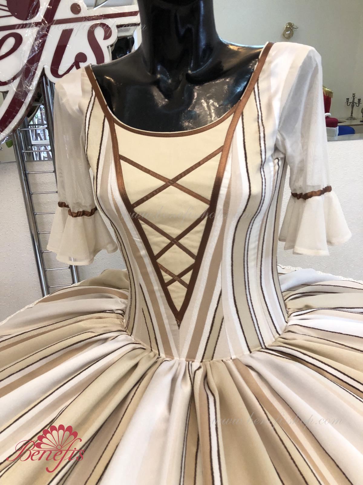 The bodice is made of semi-elastic dense fabric. For convenient adjustment, the bodice fastens at the back with 2 rows of hooks and loops. The bottom of the product is based on the T0001B base pack. The originality of the costume gives the fabric texture and pattern.