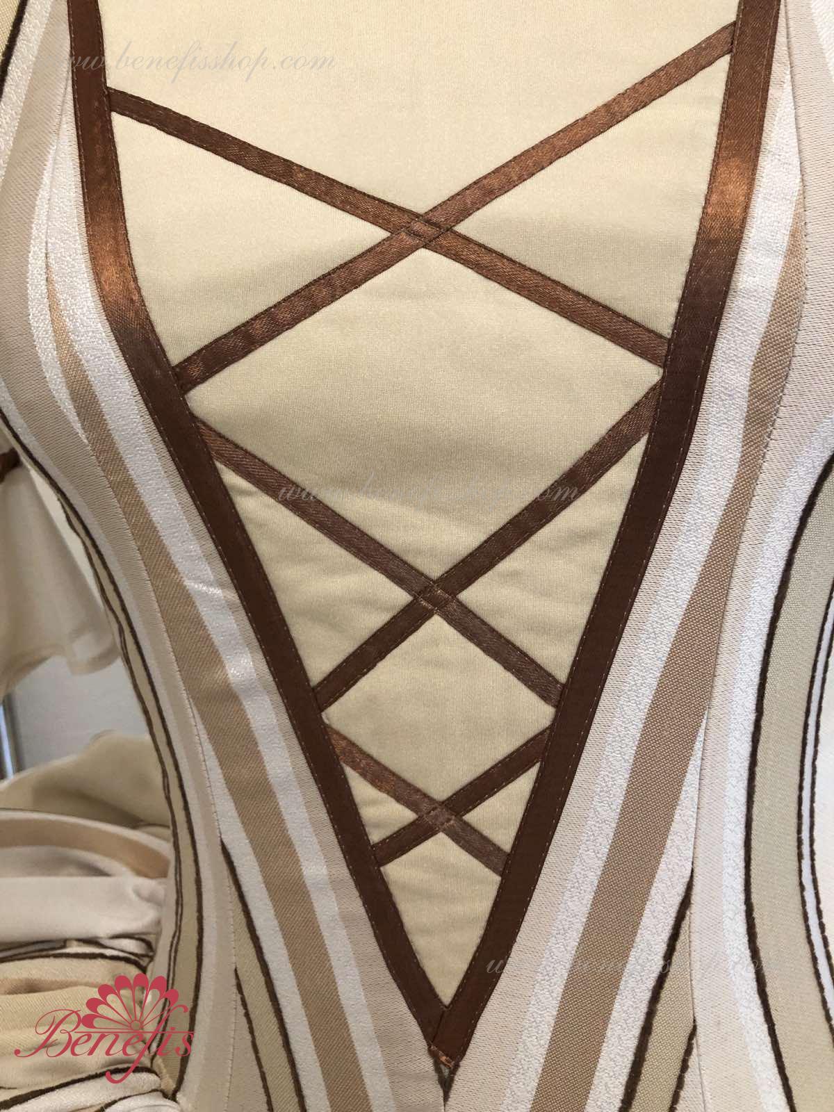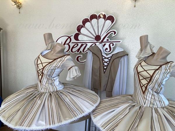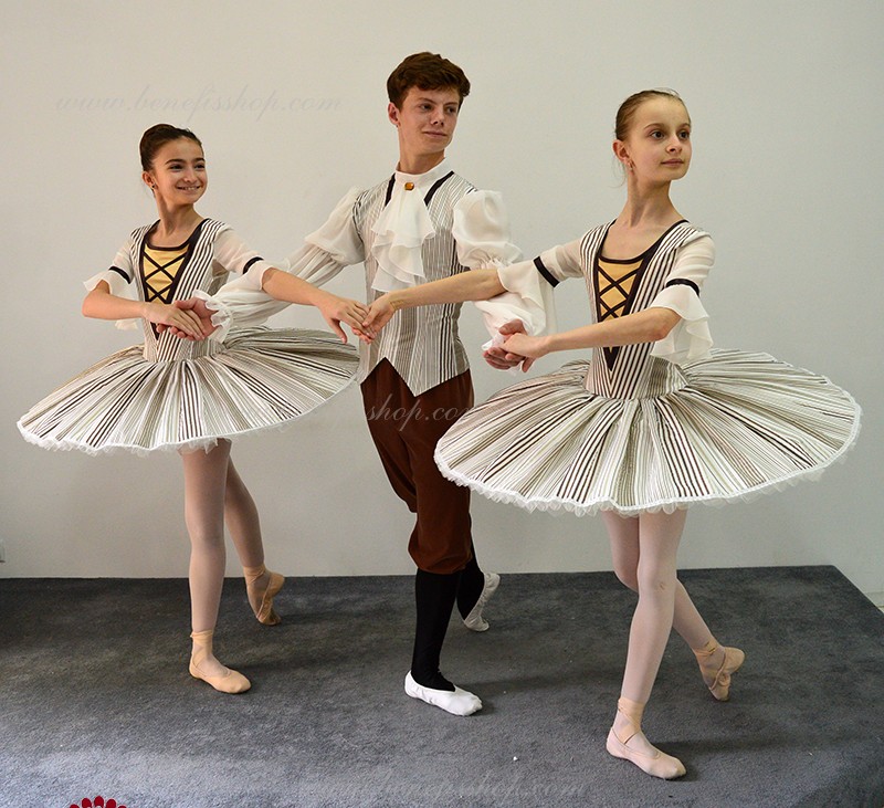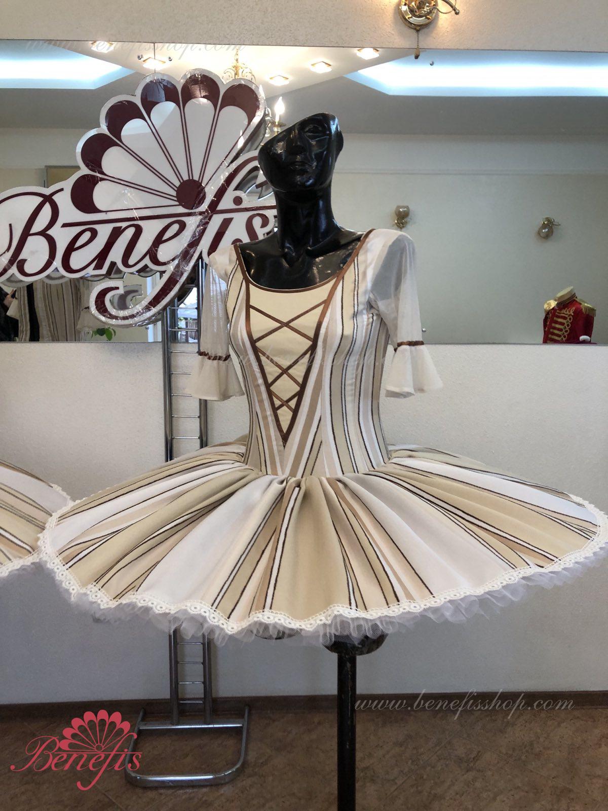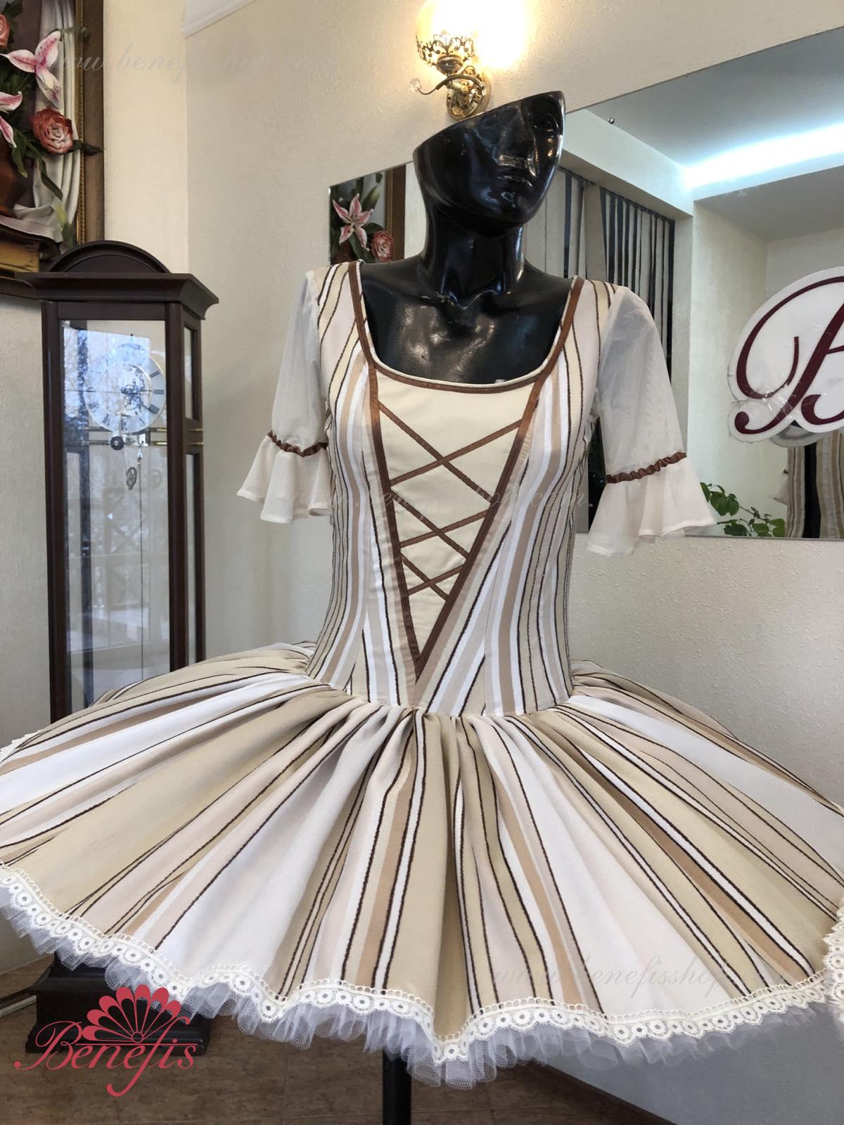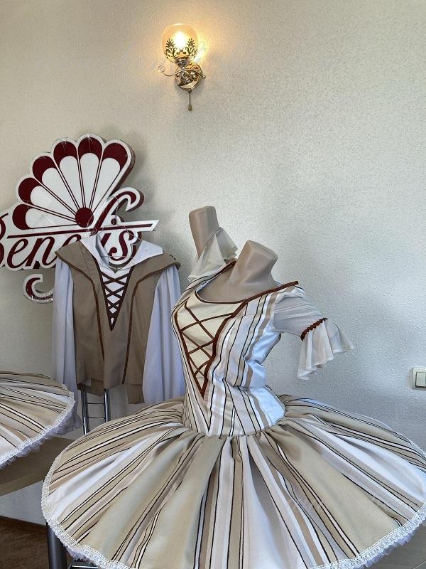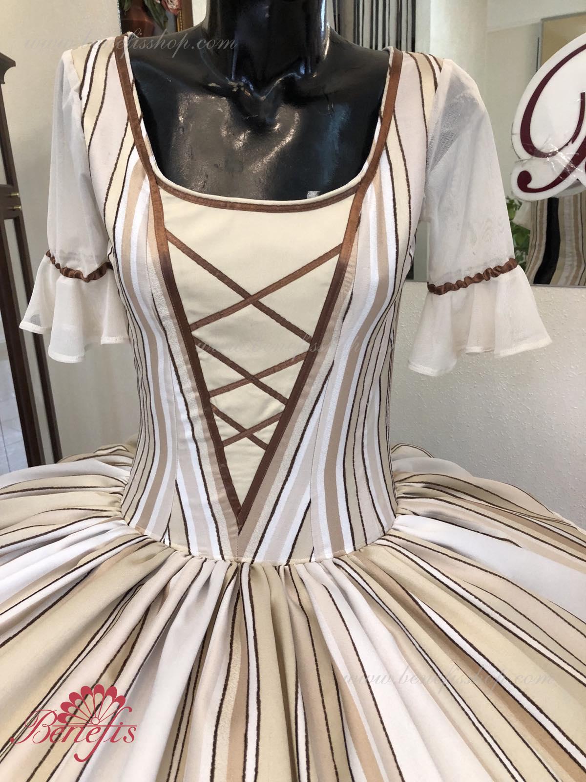 The bodice is made of semi-elastic dense fabric. For convenient adjustment, the bodice fastens at the back with 2 rows of hooks and loops. The bottom of the product is based on the T0001B base pack. The originality of the costume gives the fabric texture and pattern.
