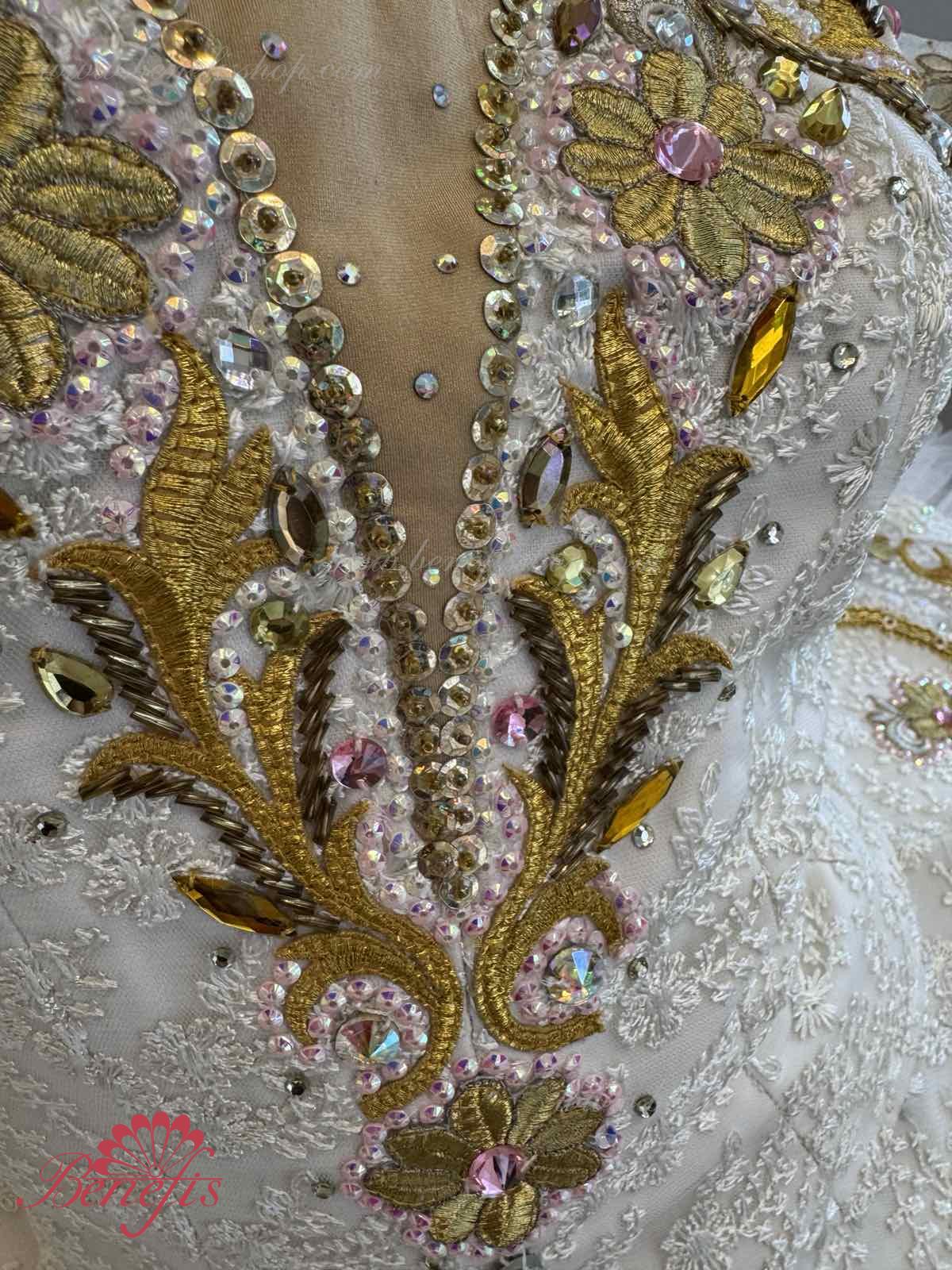 Golden appliqués,braid, bugles, beads, golden crystals, a lot of holographic sparkles, are used as decor elements.