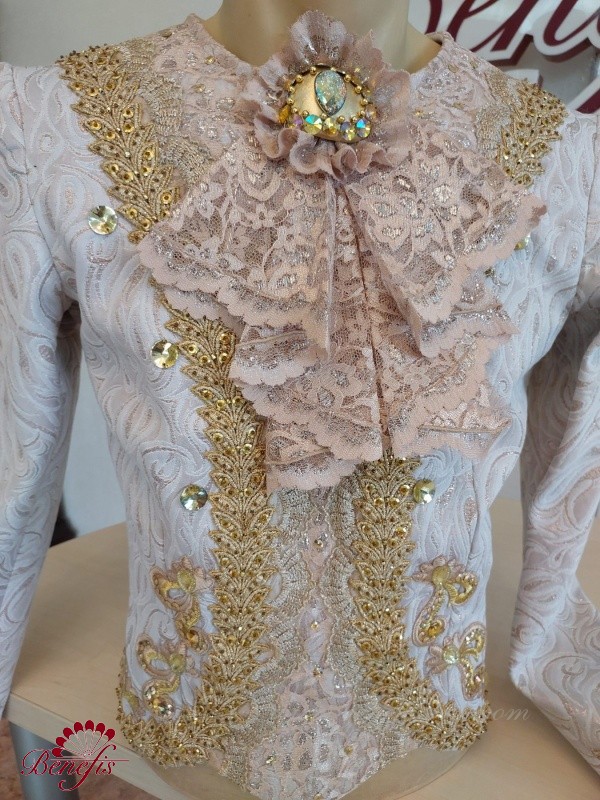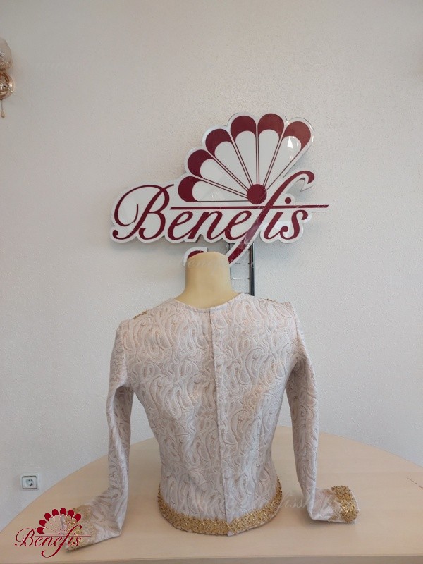The stage professional ballet costume is made of semi-elastic fabric. The jacket is fastened with two rows of hooks. As a decoration, webbing, appliques, beads, rhinestones are used.