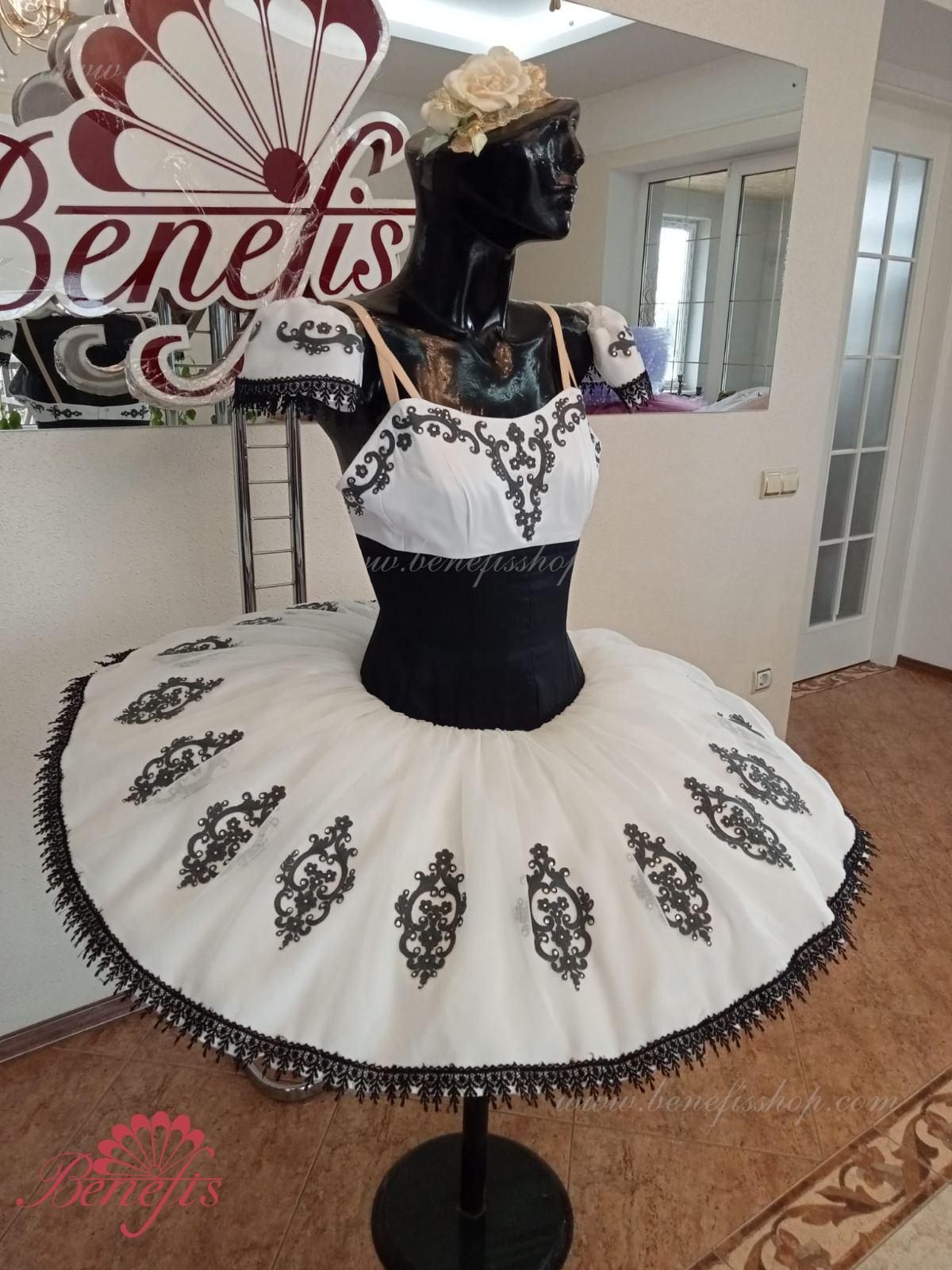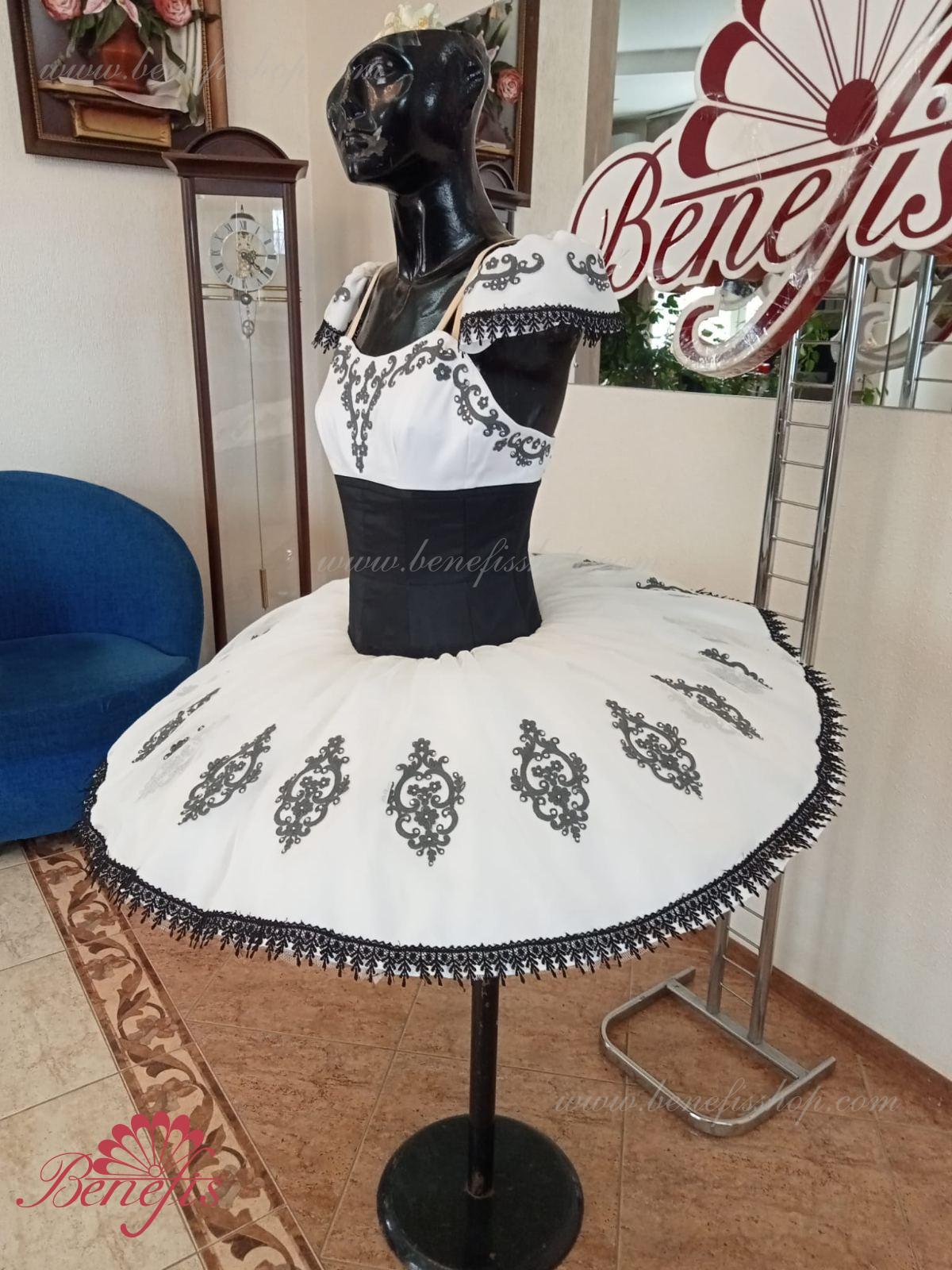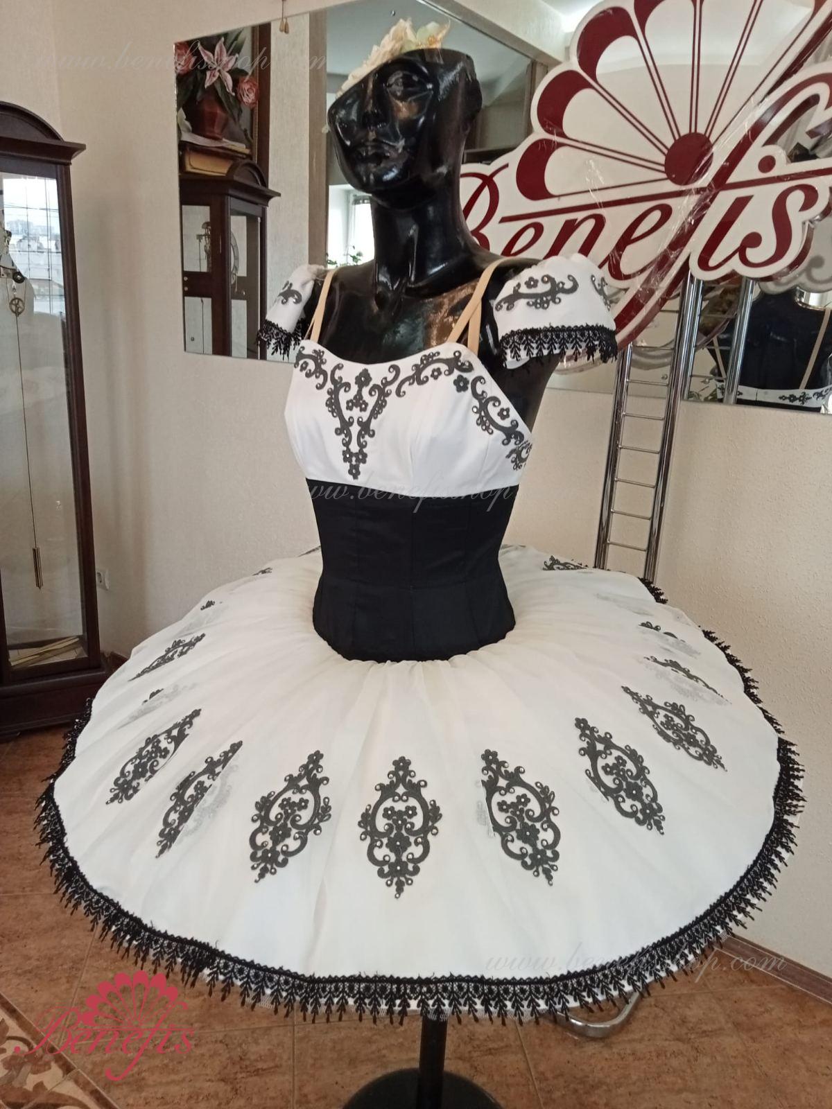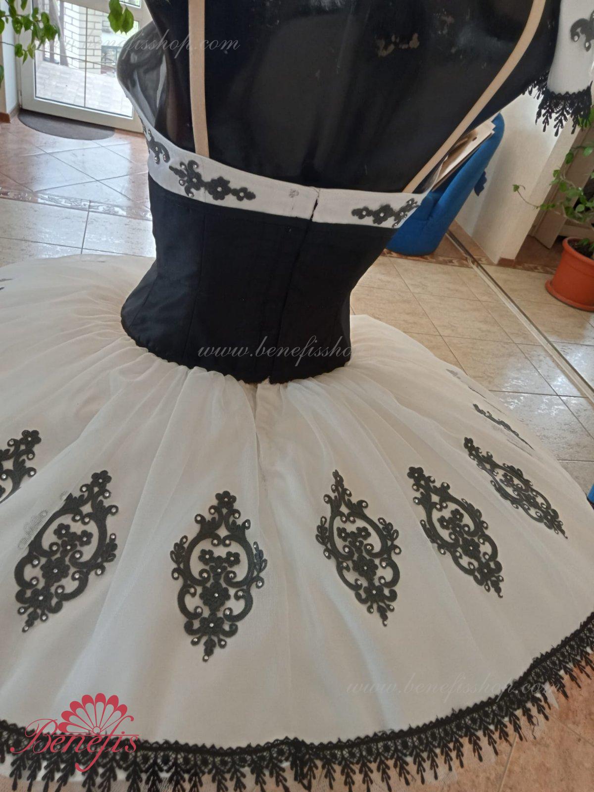 Details: dress. This is a professional stage ballet costume. The bodice fastens at the back with two rows of hooks. In the chest area, the bodice is fastened with an inner cord in the chest area. The basic is based on the basic model T0001r made of light soft and hard tulle. Appliques and lace braid, cool rhinestones are used as decoration.