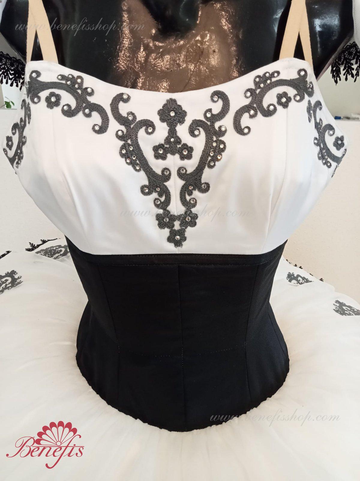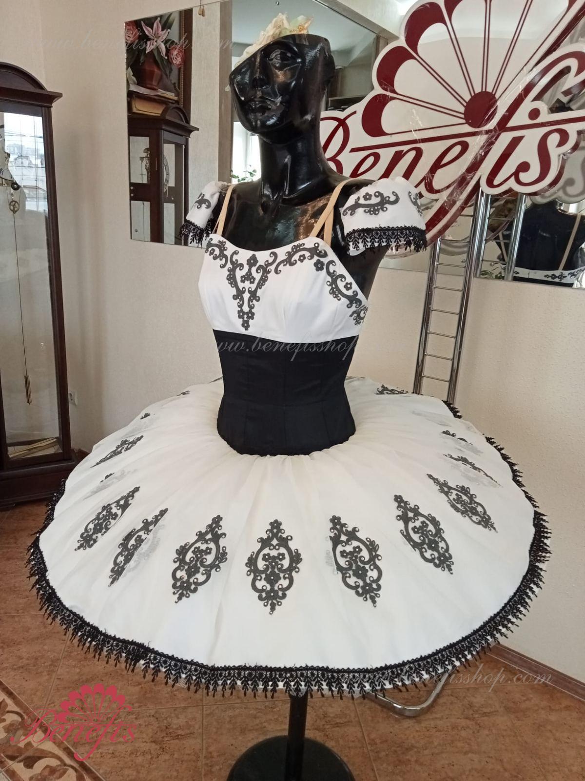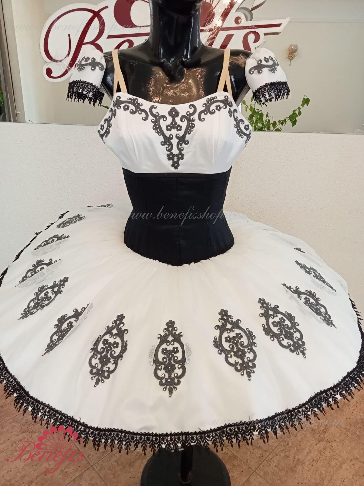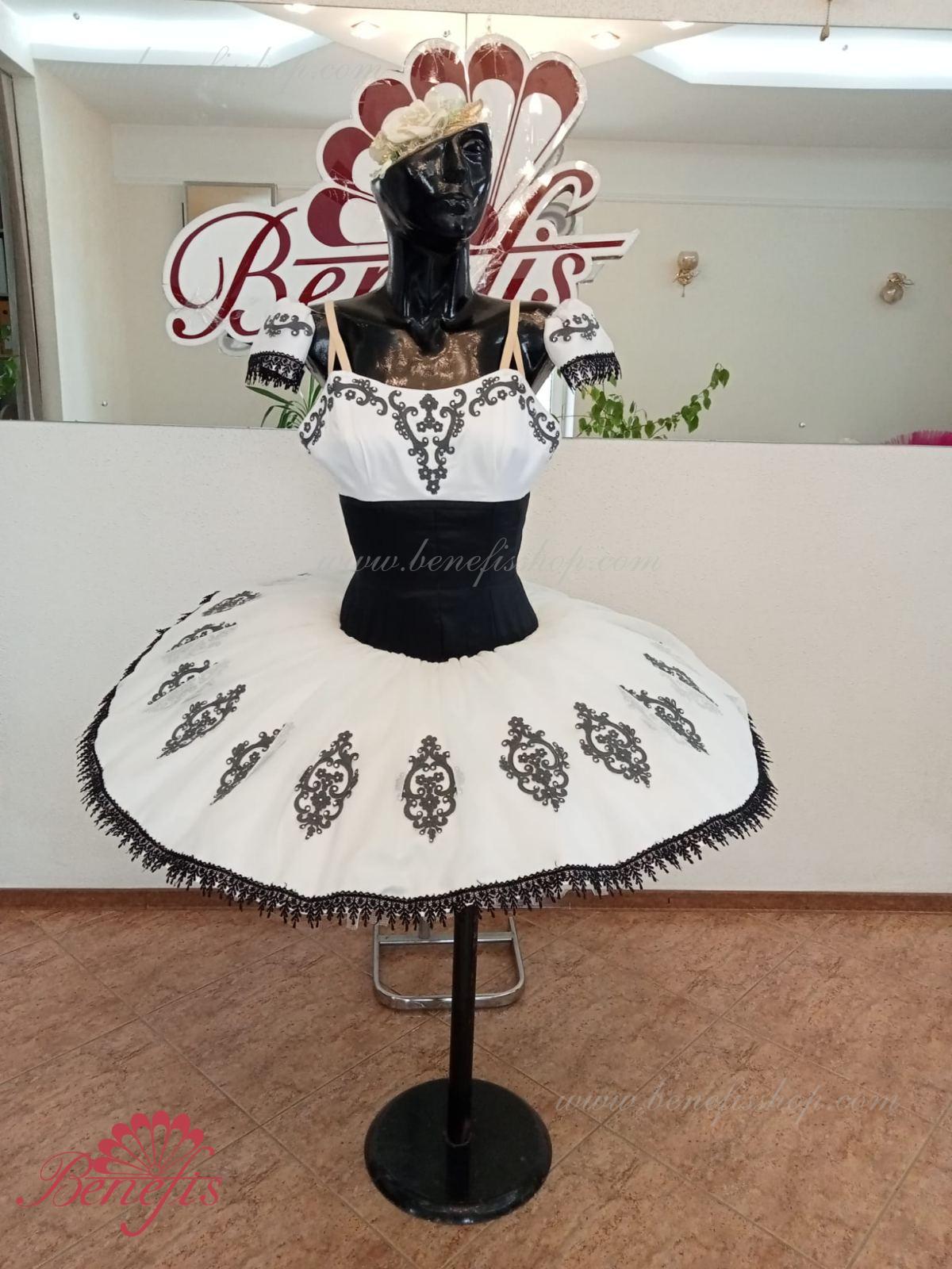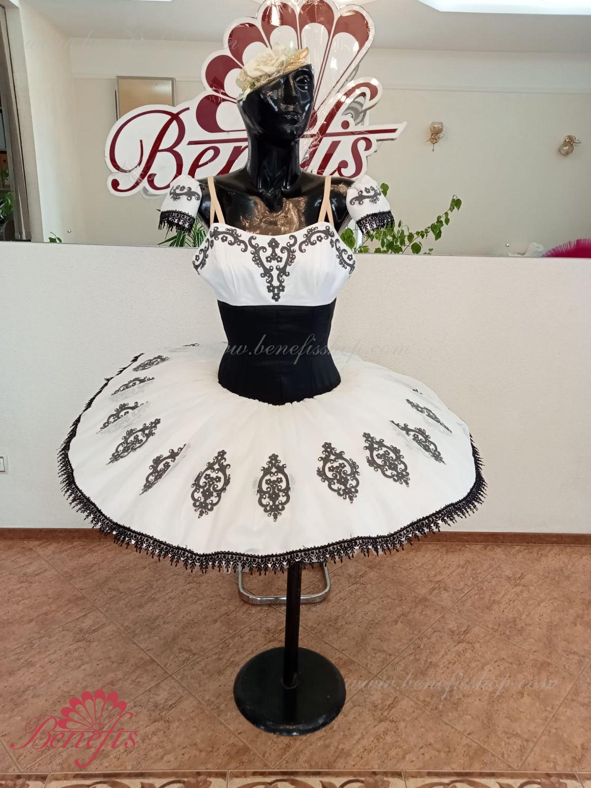 Details: dress. This is a professional stage ballet costume. The bodice fastens at the back with two rows of hooks. In the chest area, the bodice is fastened with an inner cord in the chest area. The basic is based on the basic model T0001r made of light soft and hard tulle. Appliques and lace braid, cool rhinestones are used as decoration.