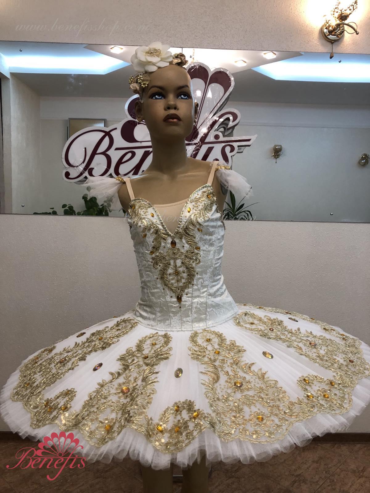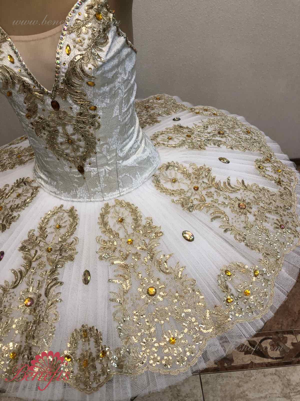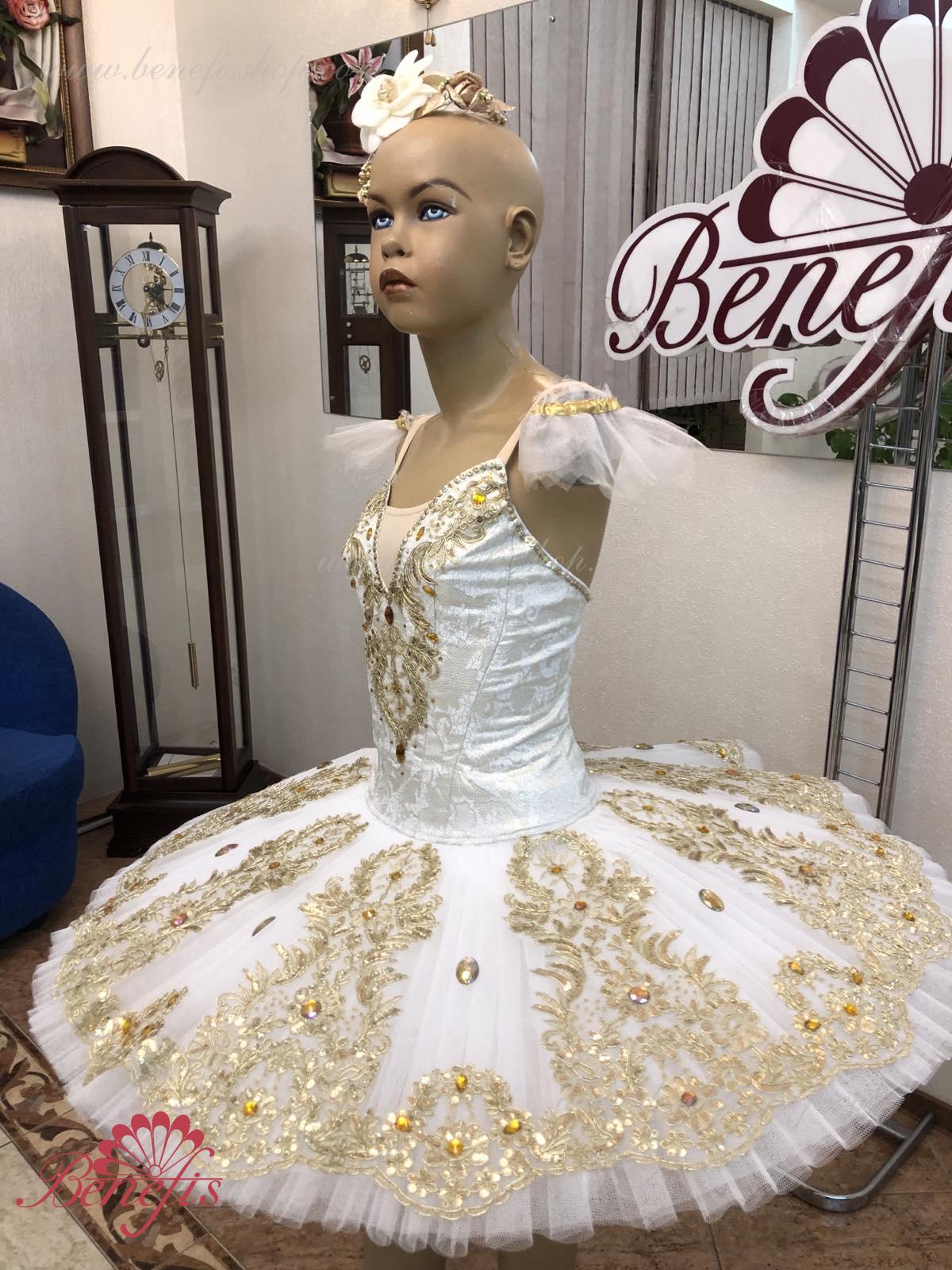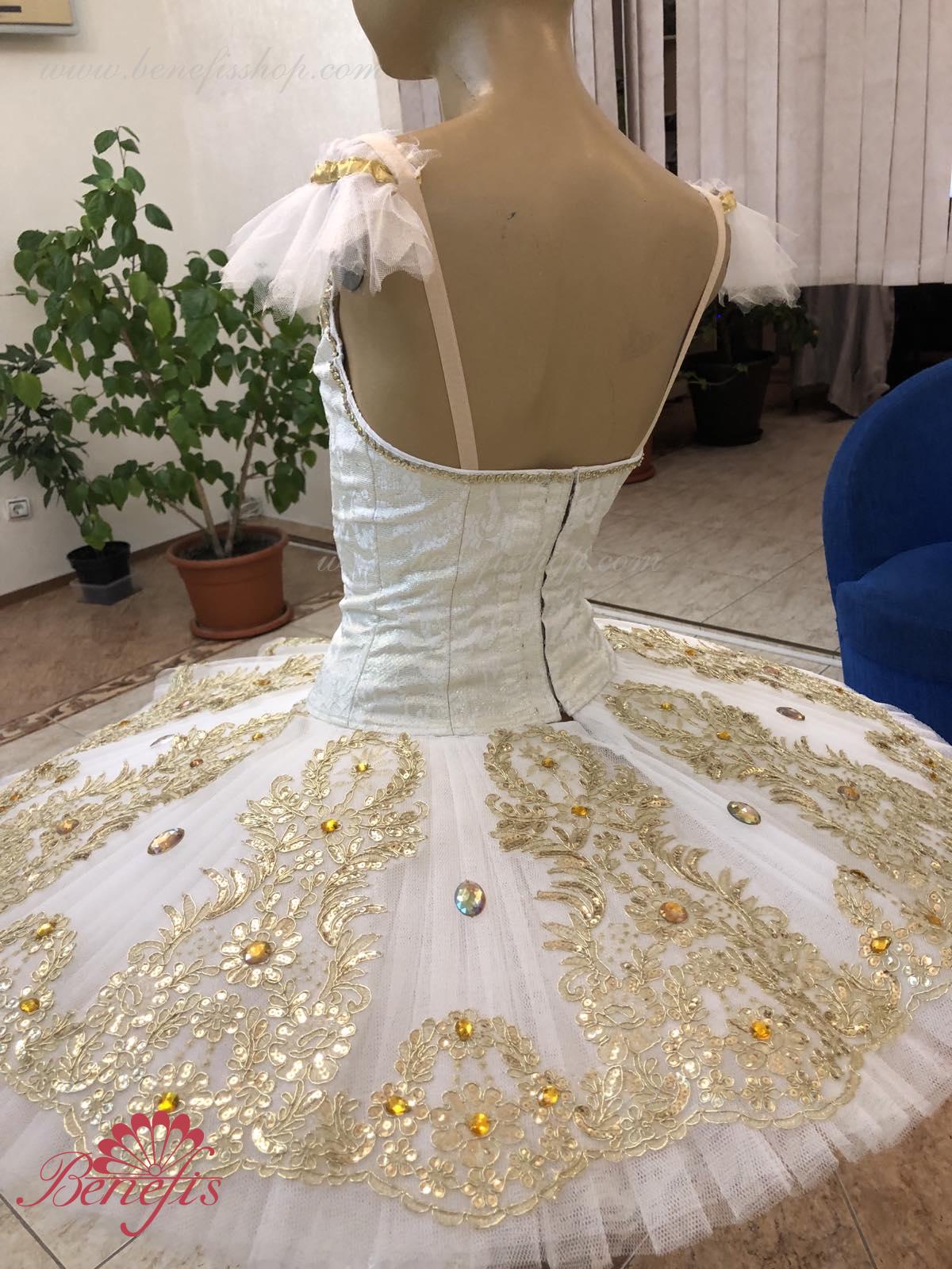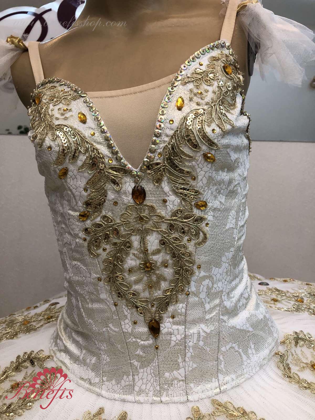 Details: costume, sleeves. The bodice, with elastic straps and a body insert on the chest, is made of dense semi-elastic fabric. The bodice is fastened with hooks in two rows for easy adjustment, the inner cord is used to tighten the bodice in the chest area. Eight pleated graduated layers of semi-soft tulle- seven long and one short on tulle panties with a 10 cm yoke attached to an elastic waistband. Two crinoline hoops are embedded in the middle layer with two additional short frills at the edges. The length of the top layer is 36-38 cm, each subsequent layer is 4 cm shorter. The tutu is fastened at the back with 6 large hooks and loops.Decor: appliques, sequins, rhinestones.