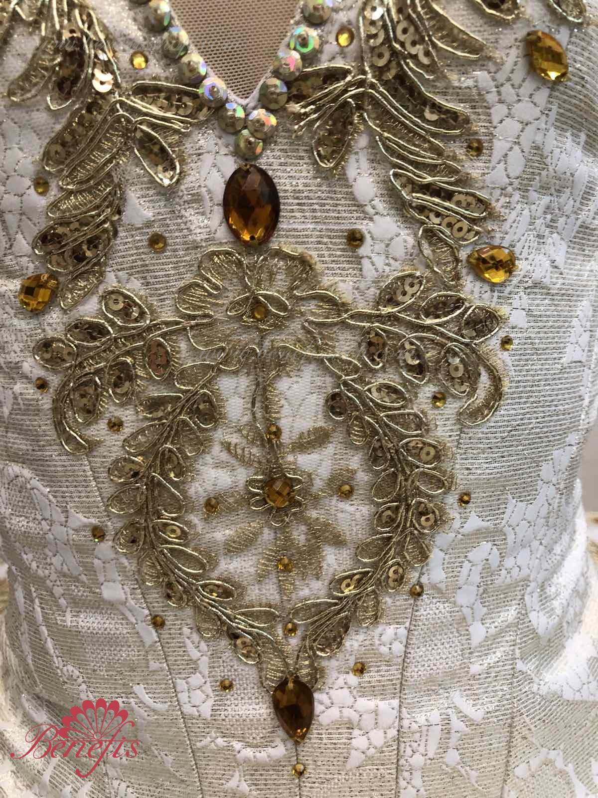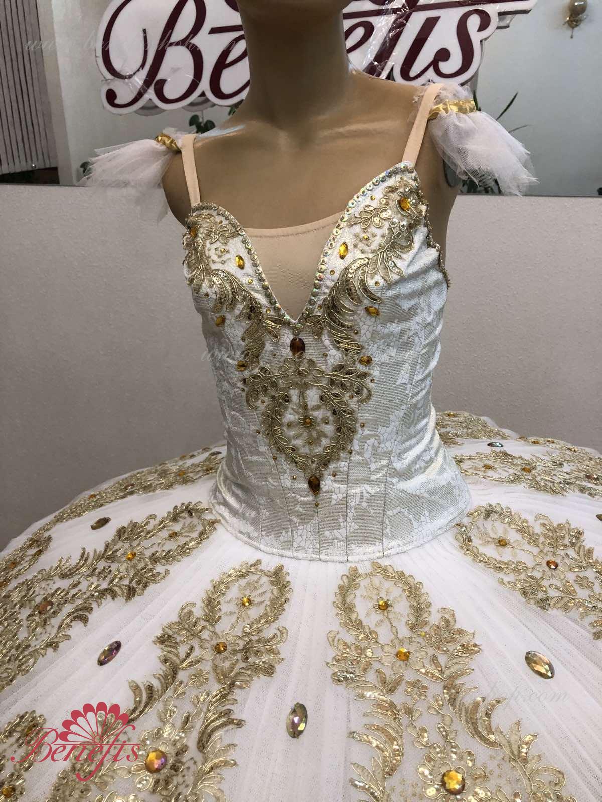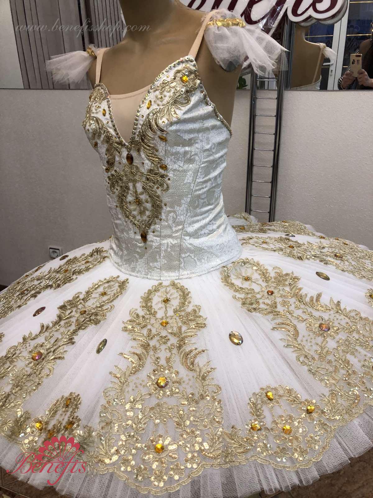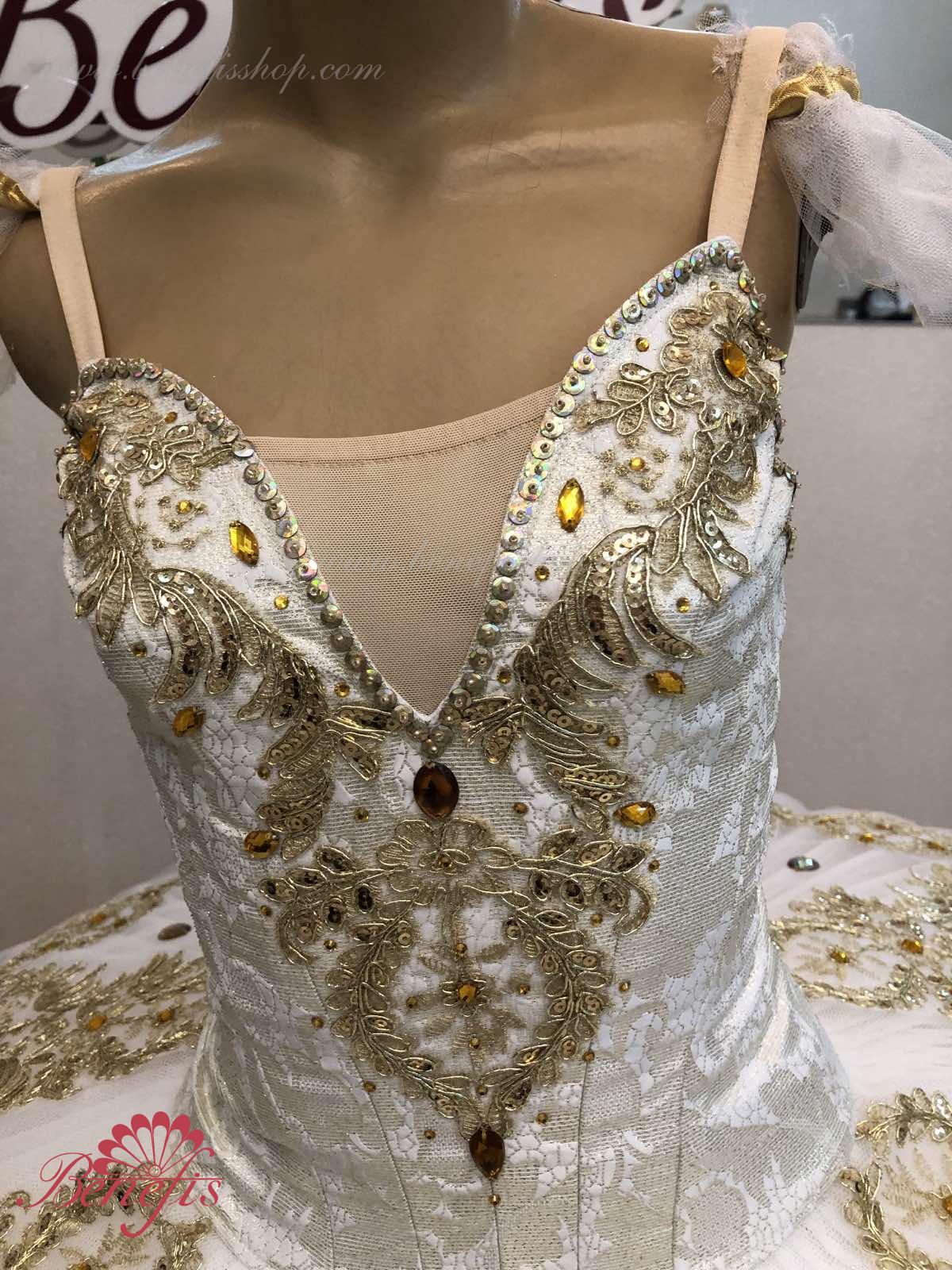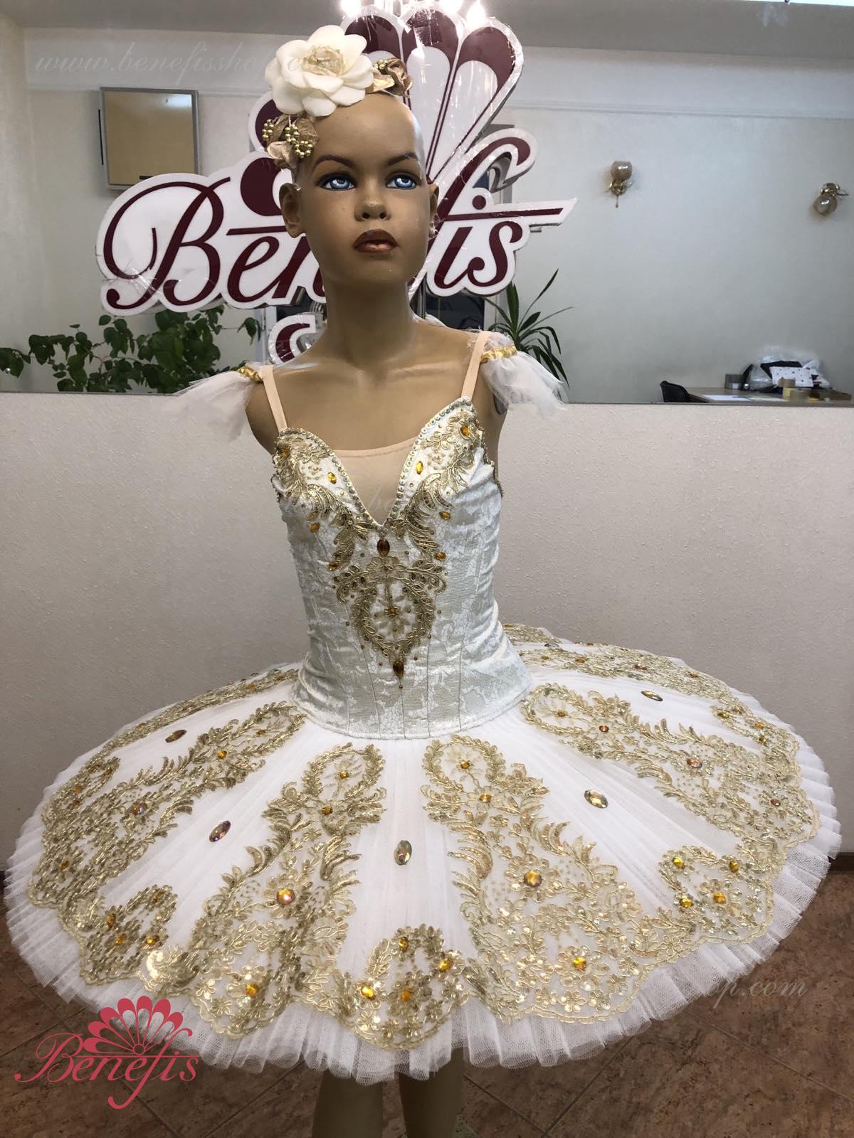 Details: costume, sleeves. The bodice, with elastic straps and a body insert on the chest, is made of dense semi-elastic fabric. The bodice is fastened with hooks in two rows for easy adjustment, the inner cord is used to tighten the bodice in the chest area. Eight pleated graduated layers of semi-soft tulle- seven long and one short on tulle panties with a 10 cm yoke attached to an elastic waistband. Two crinoline hoops are embedded in the middle layer with two additional short frills at the edges. The length of the top layer is 36-38 cm, each subsequent layer is 4 cm shorter. The tutu is fastened at the back with 6 large hooks and loops.Decor: appliques, sequins, rhinestones.