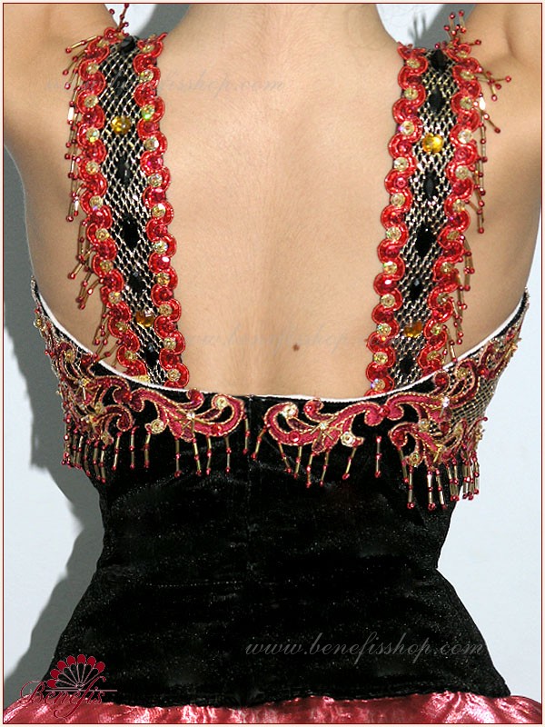 The bodice is decorated with silver or golden sparkling net fabric, applications that match the costume\'s tint, multicolored crystals, sequins and bugles.