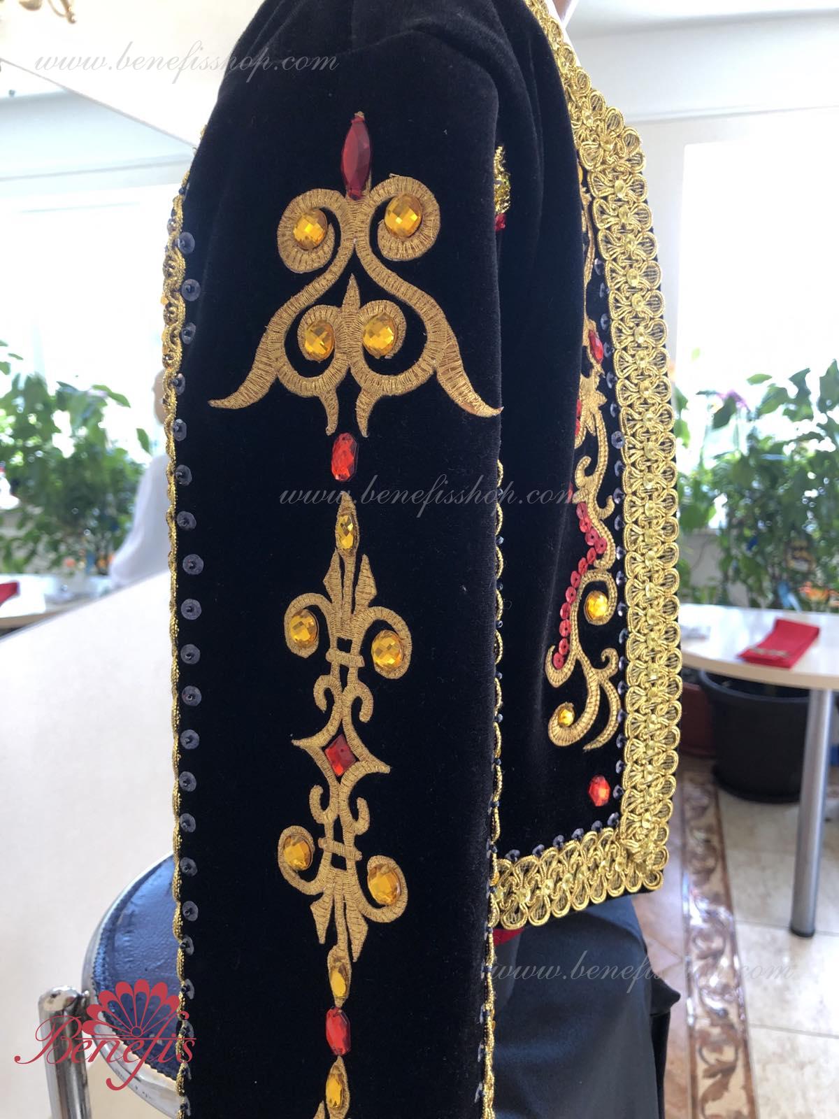 The tunic is decorated with a dense golden braid. It is also embroidered with golden and red sparkles and crystals of different sizes.