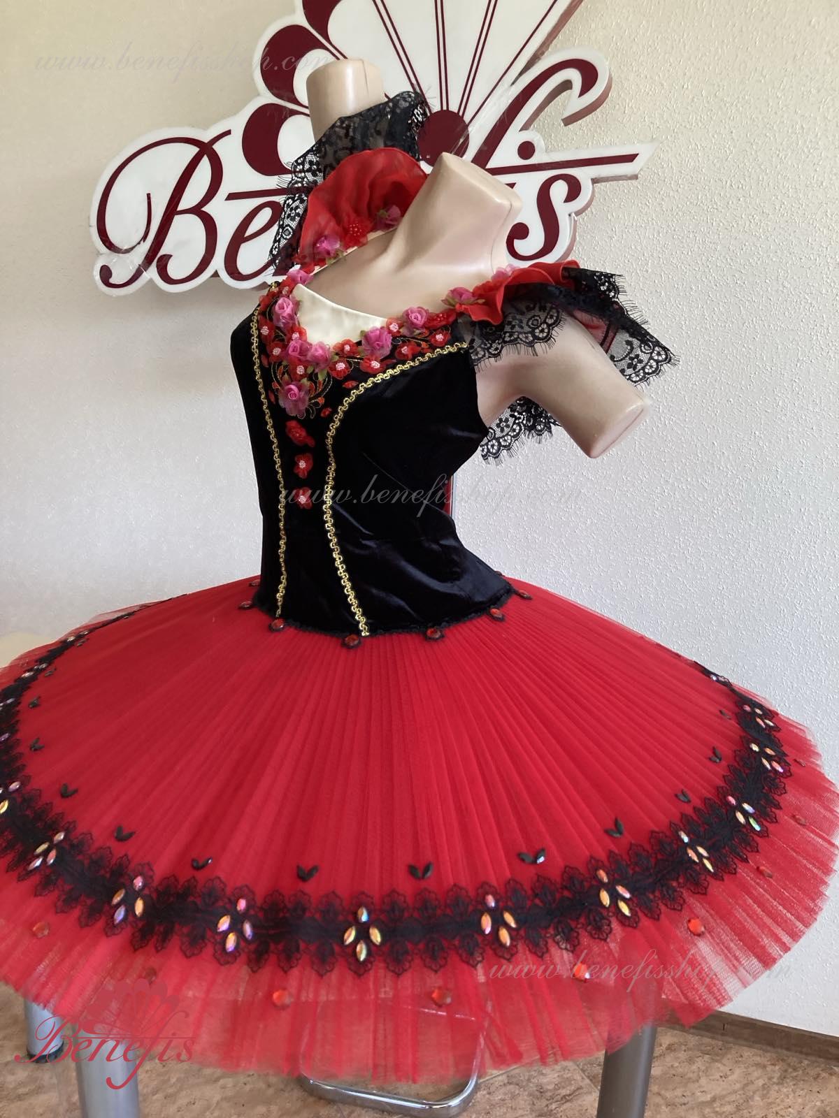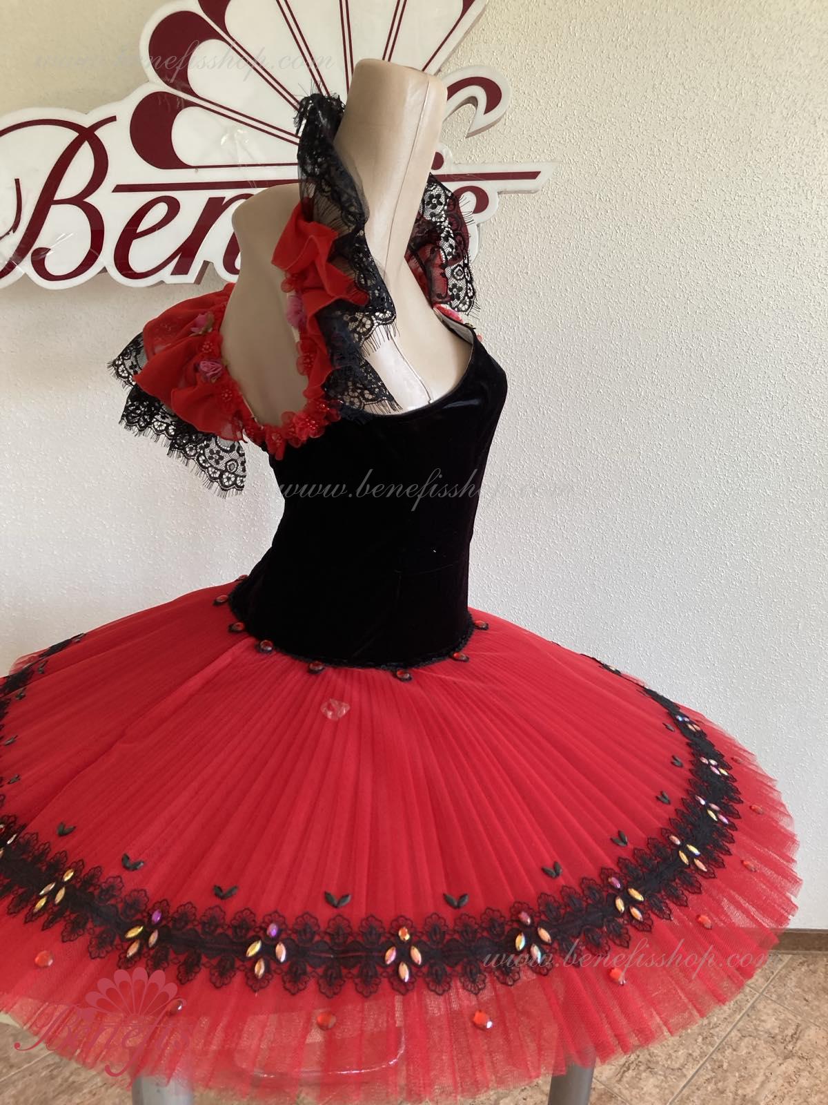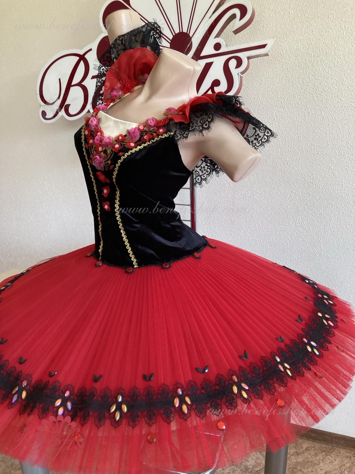 Details: dress. The bodice, with elastic straps and a body insert on the chest, is made of velvet.The bodice is fastened with hooks in two rows for convenient adjustment, the inner cord is used to tighten the bodice in the chest area.Eight to ten pleated graduated layers of hard tulle on tulle panties with a 10 cm yoke. Each next layer is 2 cm shorter. The pack is attached to an elastic waistband.A steel elastic hoop is embedded in the middle layer with two additional short frills at the edges.The tutu (skirt) itself is made in the shape of a bell and can be 5-10 cm longer than a regular standard tutu (38 cm). The steel hoop in the bundle perfectly preserves its shape.The pack is fastened at the back with 6 large hooks and loops sewn in the waist area.Professional quality.This ballet rehearsal tutu can be performed on both an adult and a child. Decor: braid, rhinestones, satin flowers, lace.