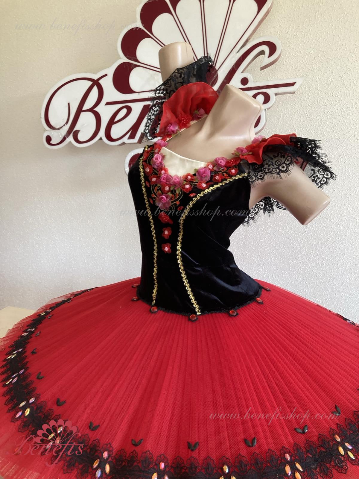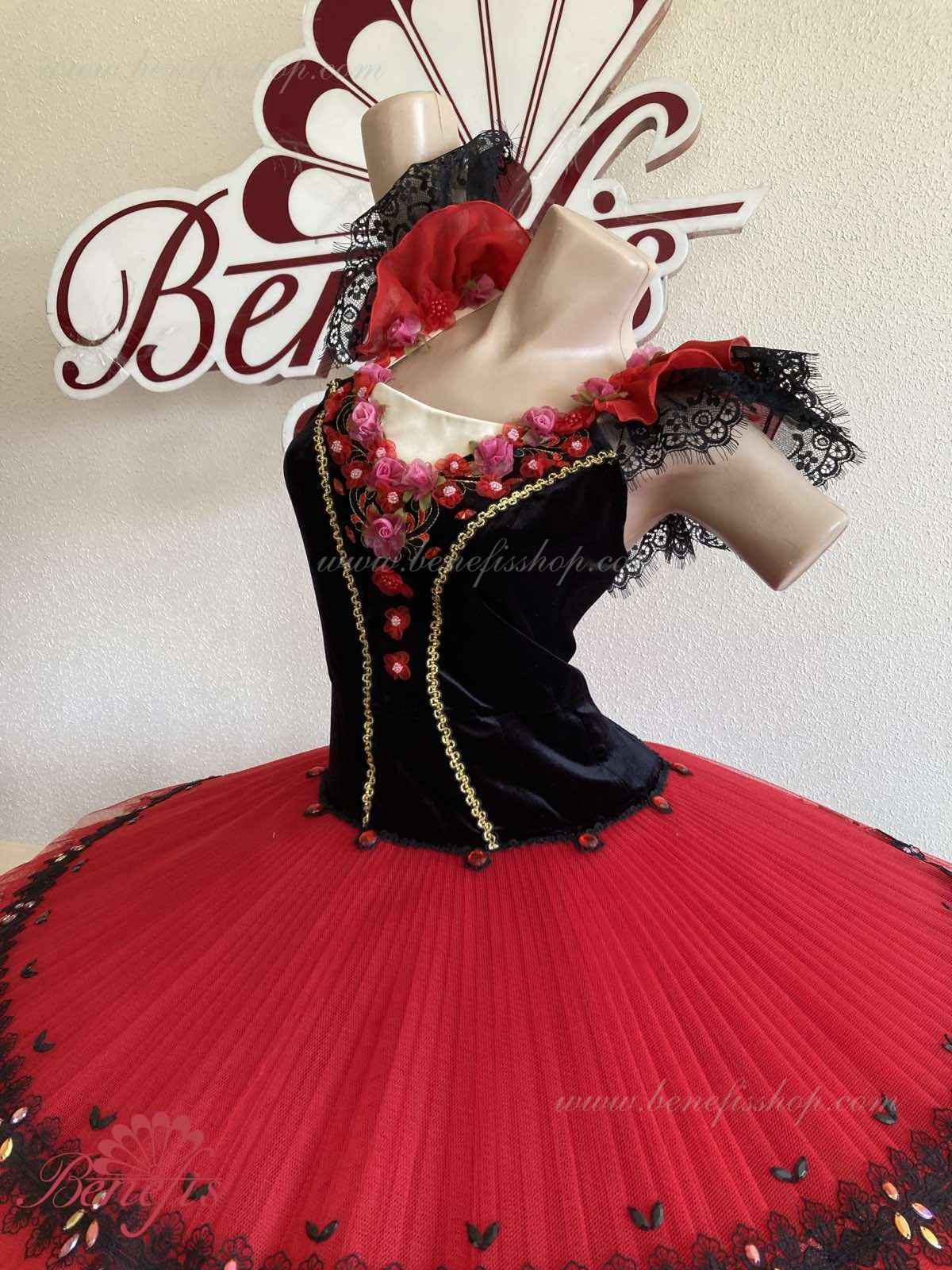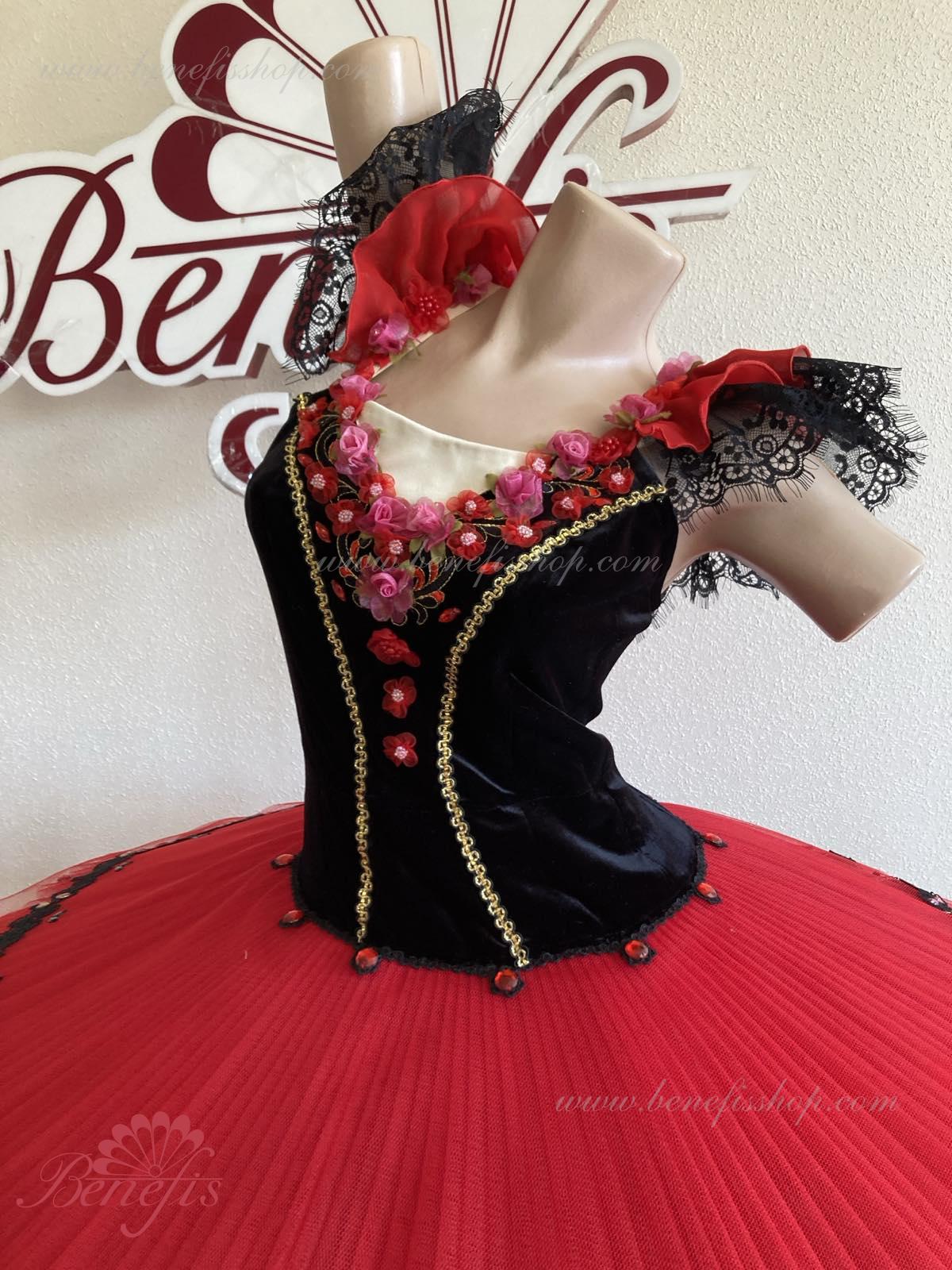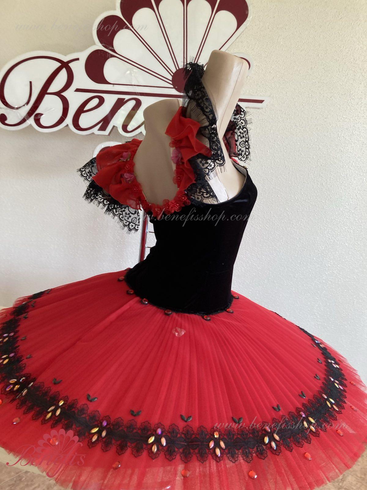 Details: dress. The bodice, with elastic straps and a body insert on the chest, is made of velvet.The bodice is fastened with hooks in two rows for convenient adjustment, the inner cord is used to tighten the bodice in the chest area.Eight to ten pleated graduated layers of hard tulle on tulle panties with a 10 cm yoke. Each next layer is 2 cm shorter. The pack is attached to an elastic waistband.A steel elastic hoop is embedded in the middle layer with two additional short frills at the edges.The tutu (skirt) itself is made in the shape of a bell and can be 5-10 cm longer than a regular standard tutu (38 cm). The steel hoop in the bundle perfectly preserves its shape.The pack is fastened at the back with 6 large hooks and loops sewn in the waist area.Professional quality.This ballet rehearsal tutu can be performed on both an adult and a child. Decor: braid, rhinestones, satin flowers, lace.