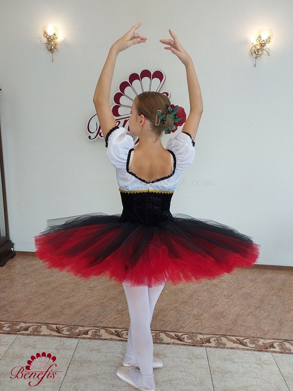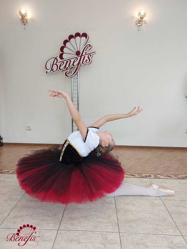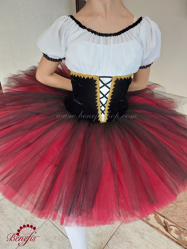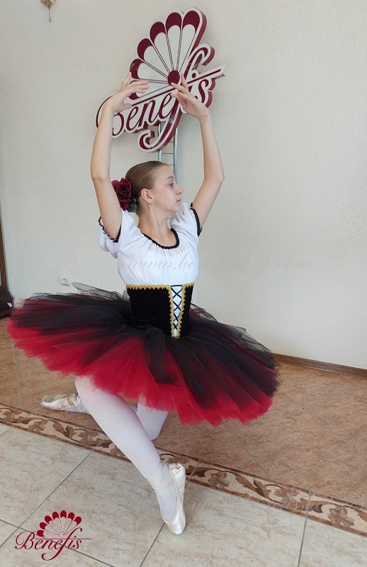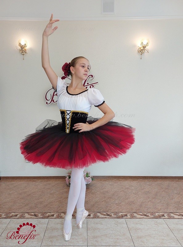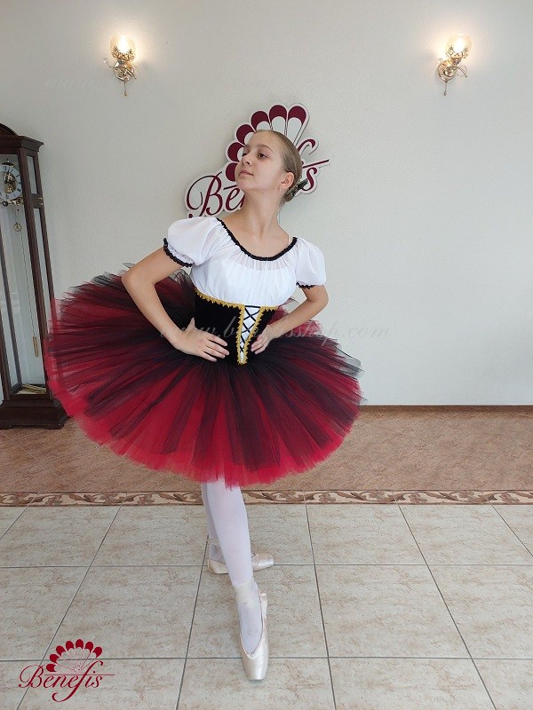 Details: costume. The corset is made of velvet with a chiffon blouse. The T0001R base. Made of 9 layers of soft and hard tulle with 1 crinoline. The tutu length is 38-42 cm. Decor: braid.