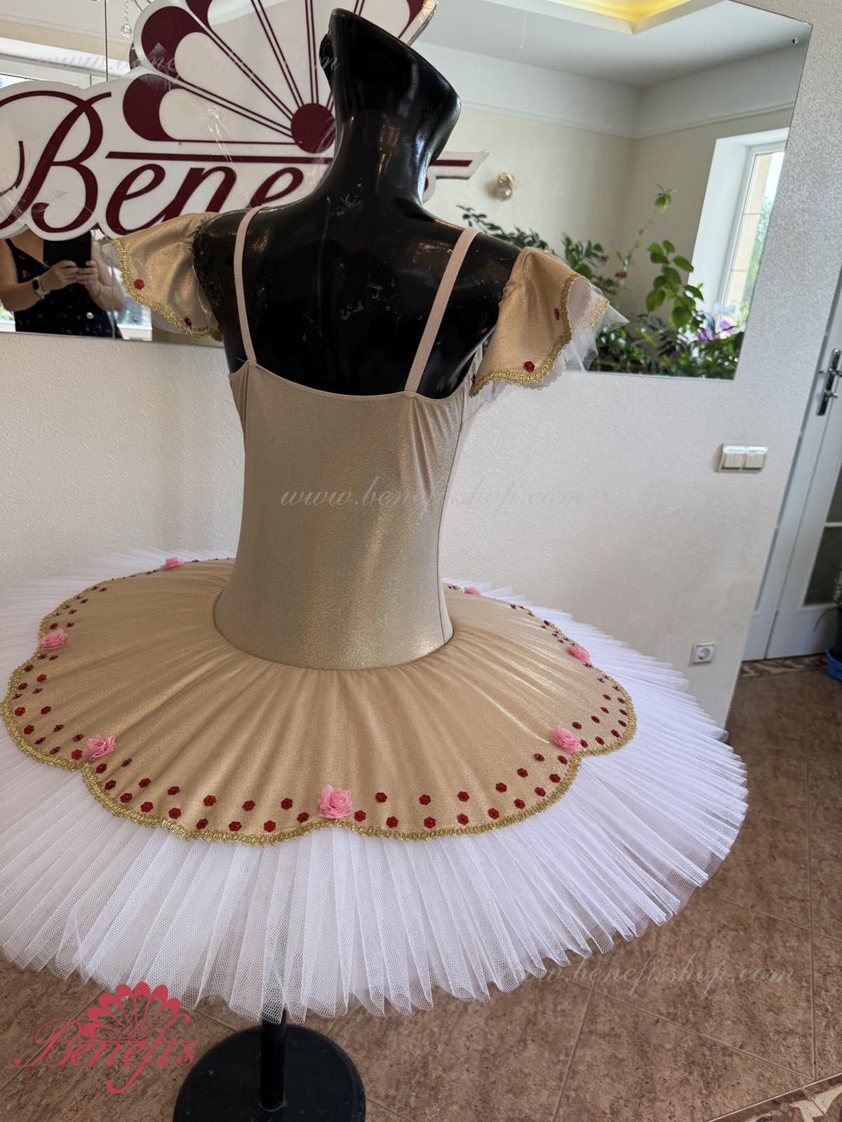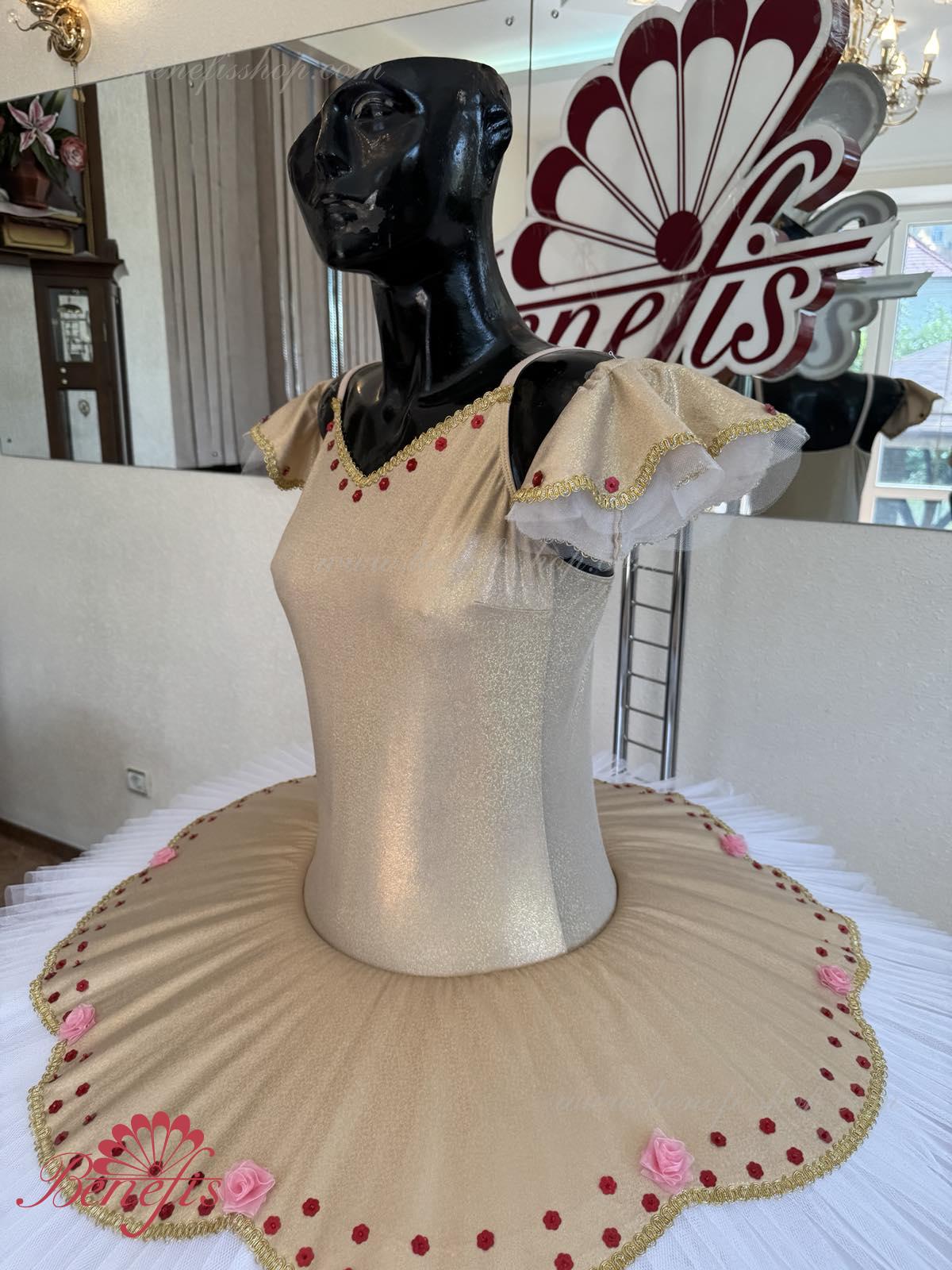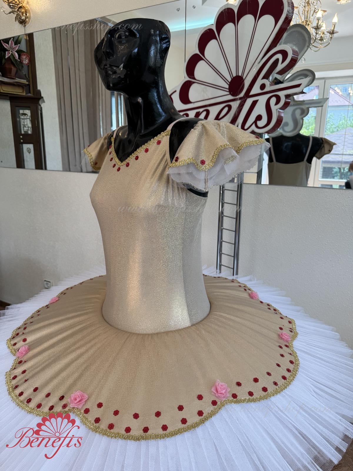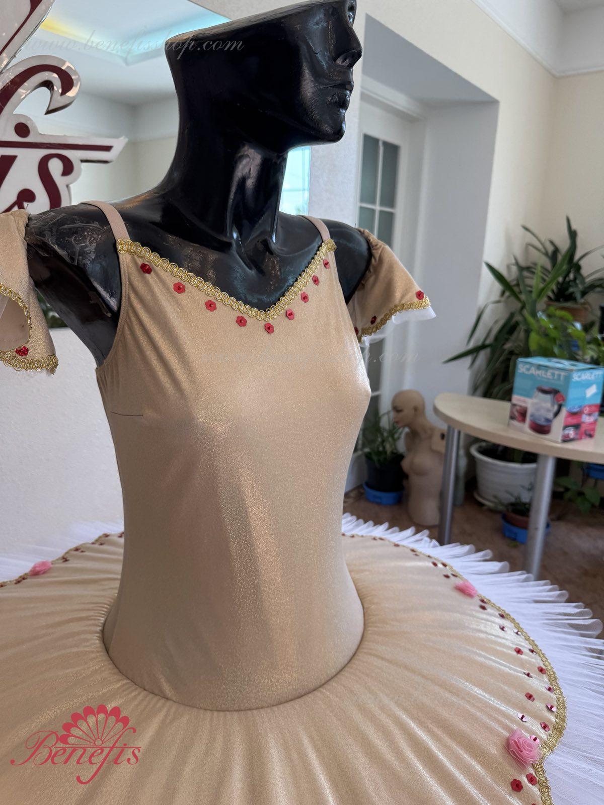 Details: costume. Leotard A0001A with white briefs, the base is made of 5 layers of tulle, the top is hard, the rest is soft,1 crinoline. The leotard is made of biflex fabric (100% lycra).The tire and sleeves are decorated with sequins with beads and braid.