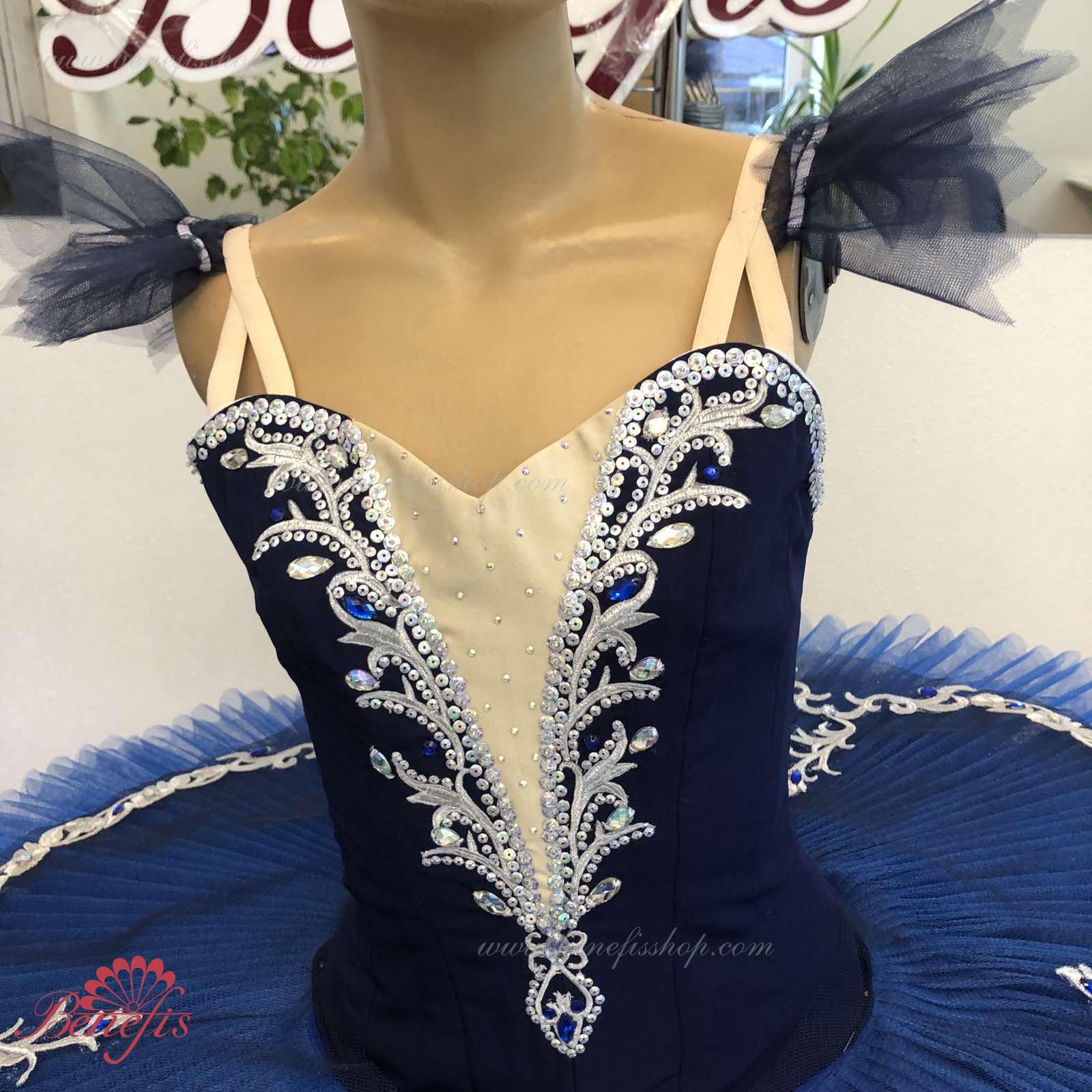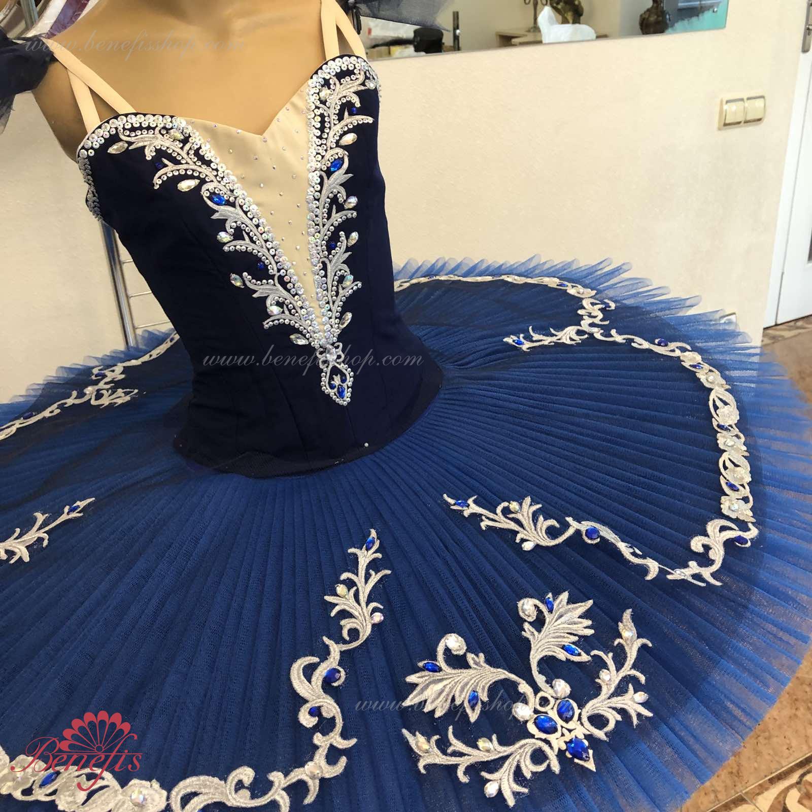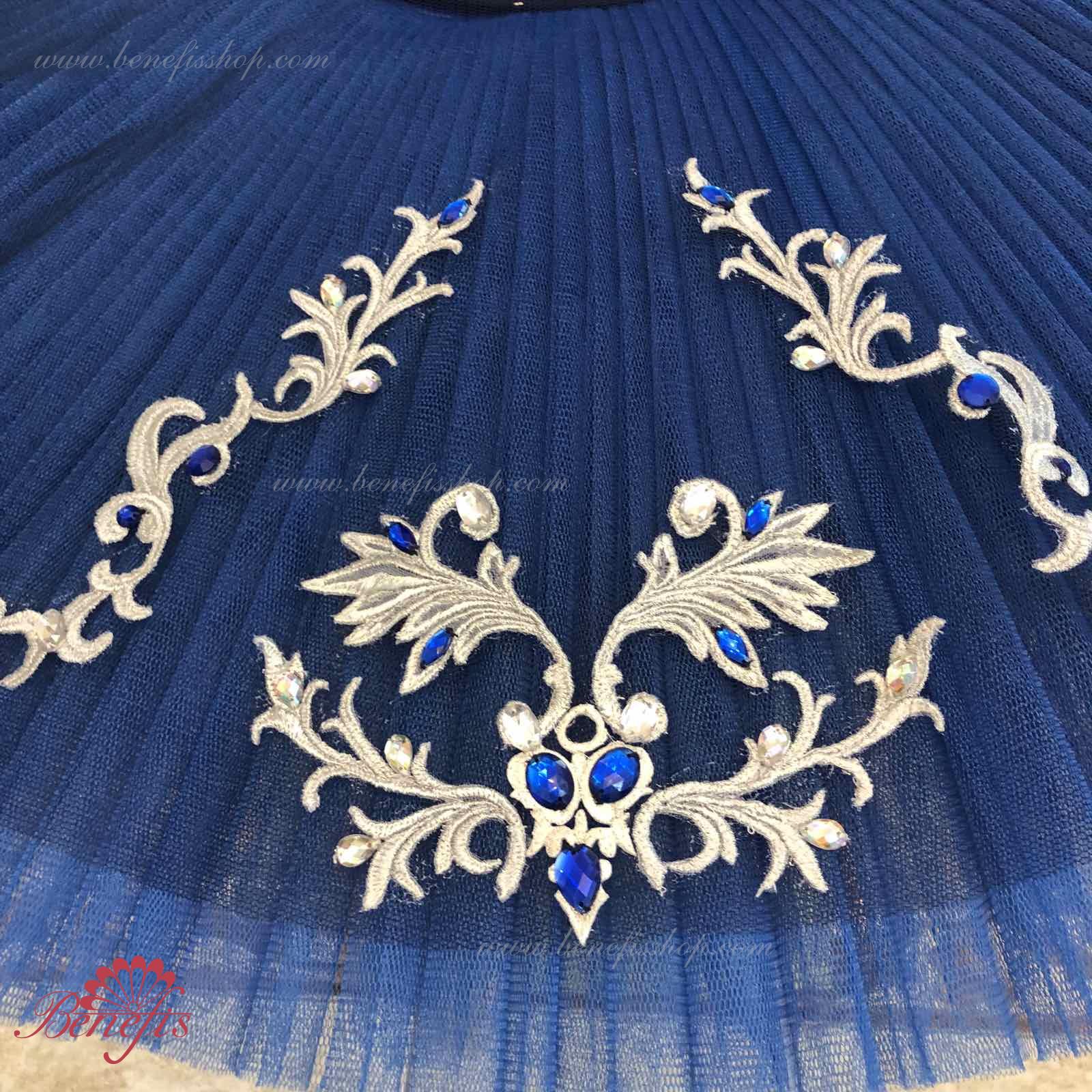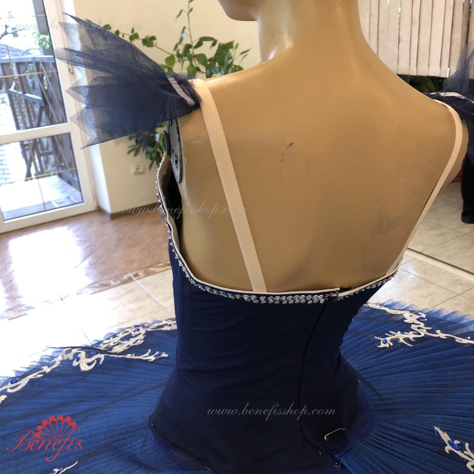 Tutu- Eight pleated graduated layers of semi-soft tulle- seven long and one short with tulle panties with a 10 cm bascque attached to an elastic waistband. Two crinoline hoops are sewed in the middle layer with two additional short frills at the edges. The length of the top layer of the tutu is 36-38 cm, each next layer is shorter with 4 cm than previous . The tutu is fastened at the back with 6 large hooks and loops.