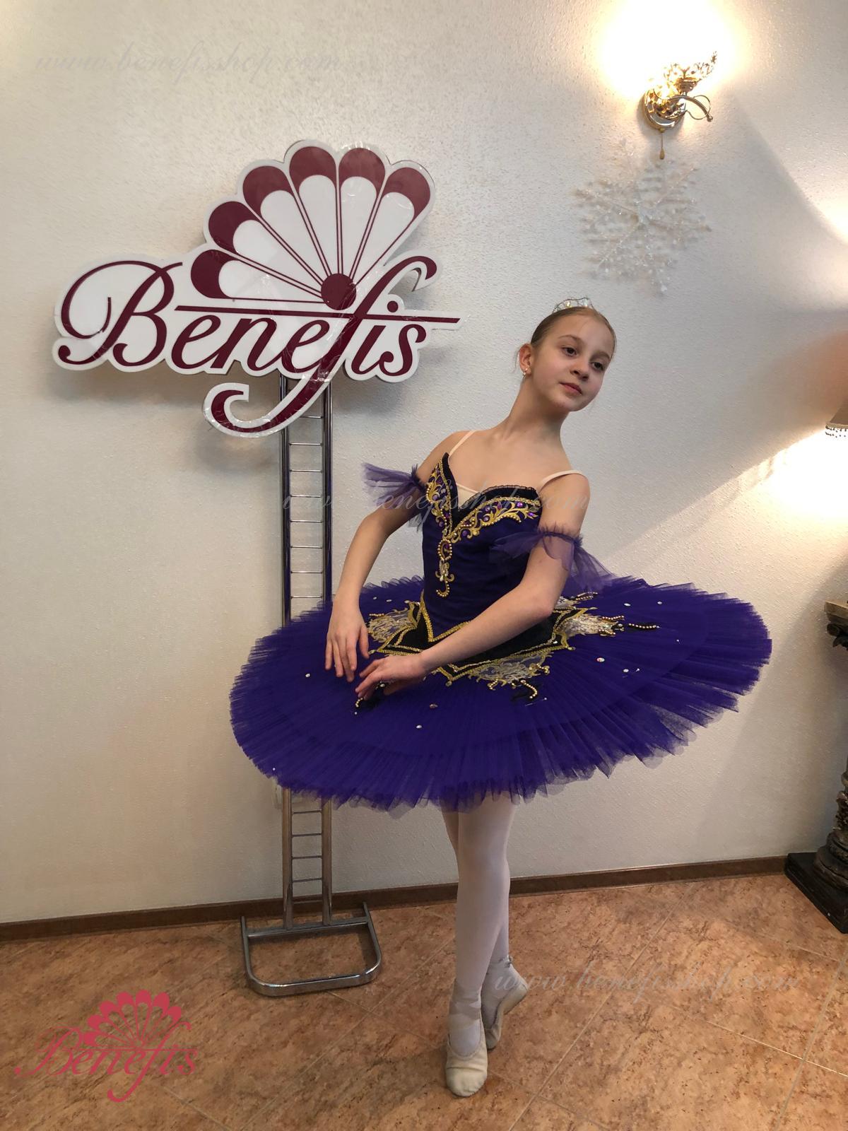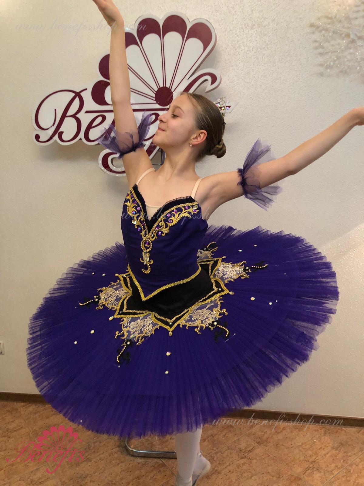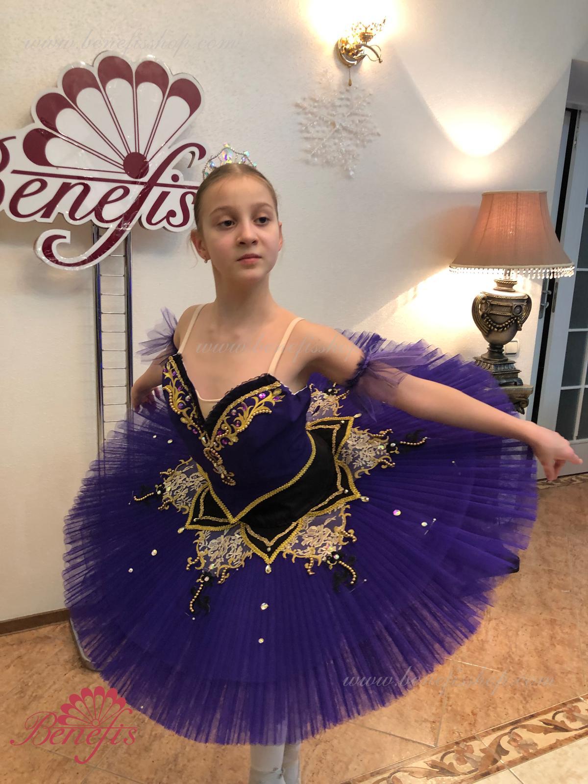 Details: costume. The bodice, with elastic straps and a body insert on the chest, is made of dense semi-elastic fabric. The bodice is fastened with hooks in two rows for easy adjustment, the inner cord is used to tighten the bodice in the chest area. Eight pleated graduated layers of semi-soft tulle- seven long and one short on tulle panties with a 10 cm yoke attached to an elastic waistband. Two crinoline hoops are embedded in the middle layer with two additional short frills at the edges. The length of the top layer is 36-38 cm, each subsequent layer is 4 cm shorter. The tutu is fastened at the back with 6 large hooks and loops. The sleeves are made of soft tulle, the peplum is made of semi-elastic fabric and guipure. Everything is decorated with braid, rhinestones and sequins, applications and beads.